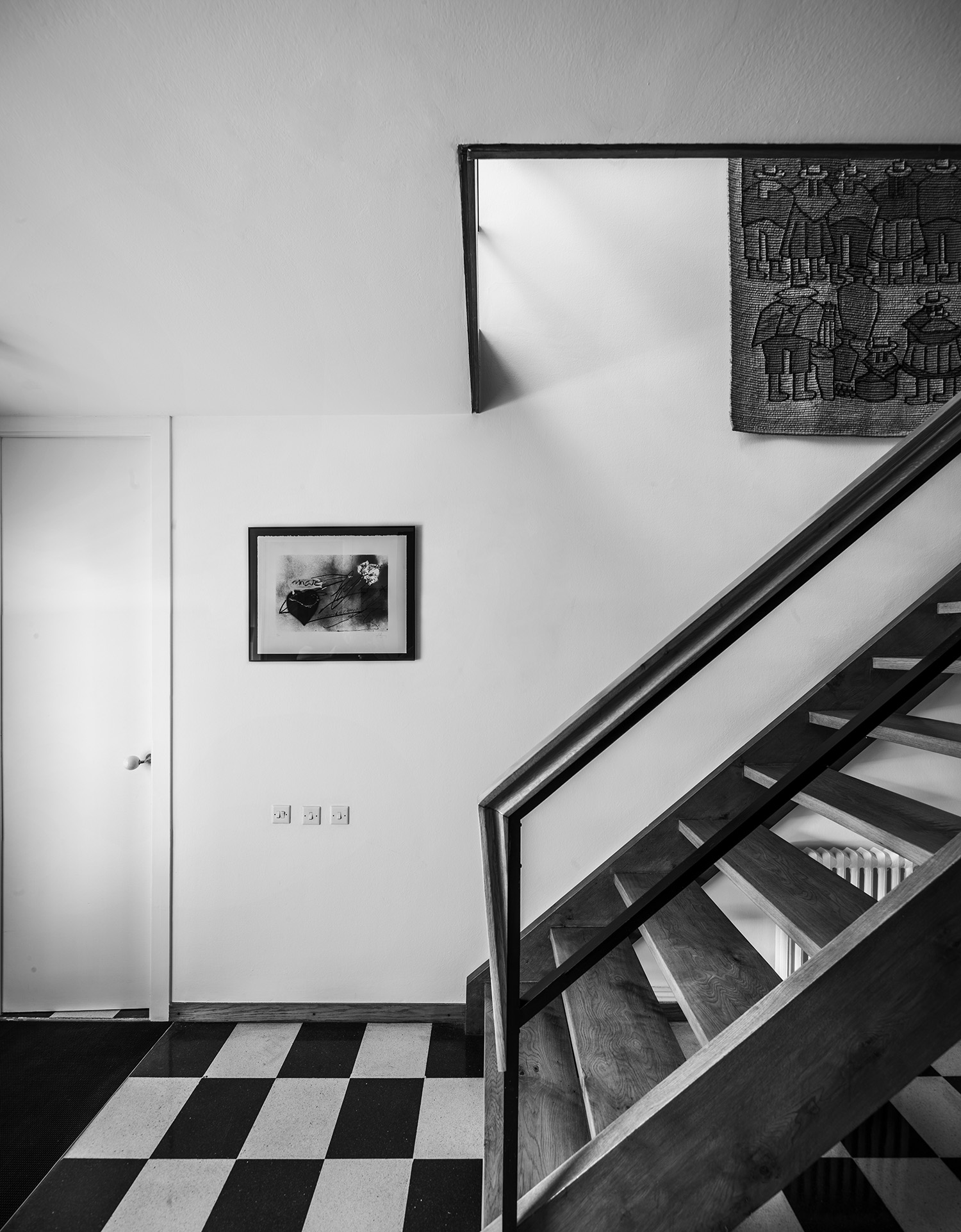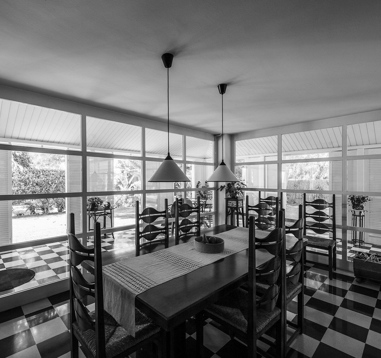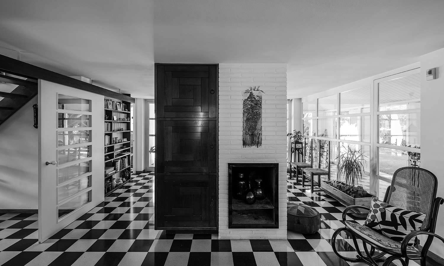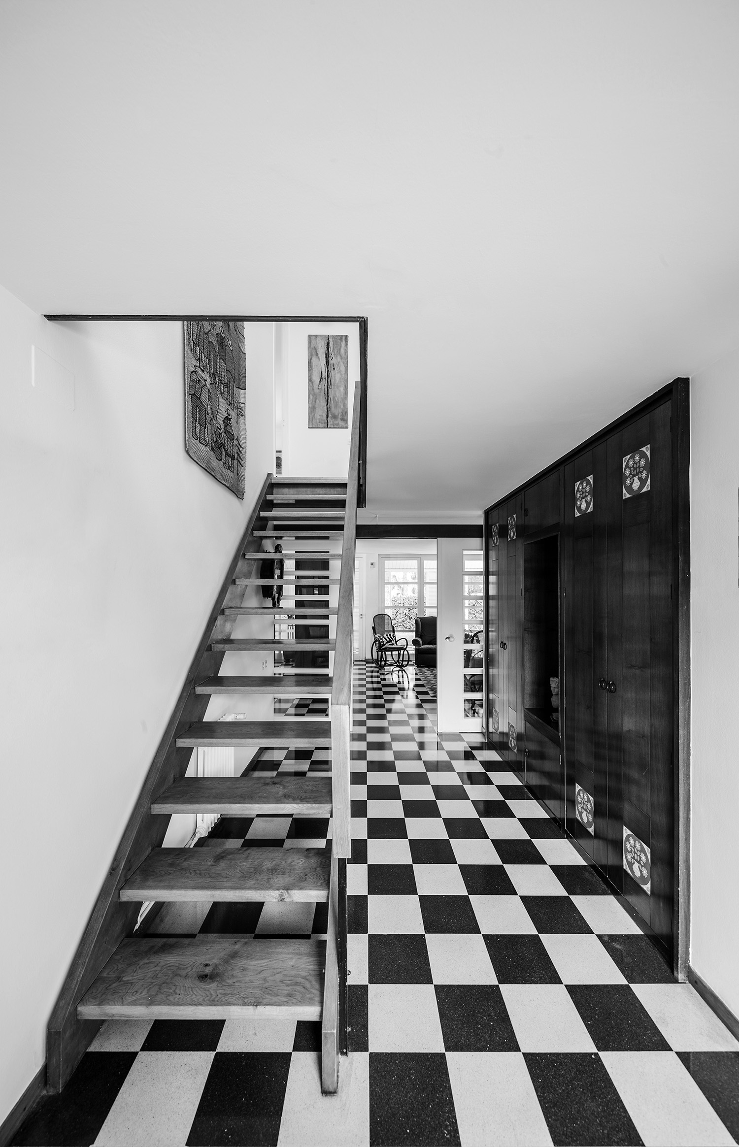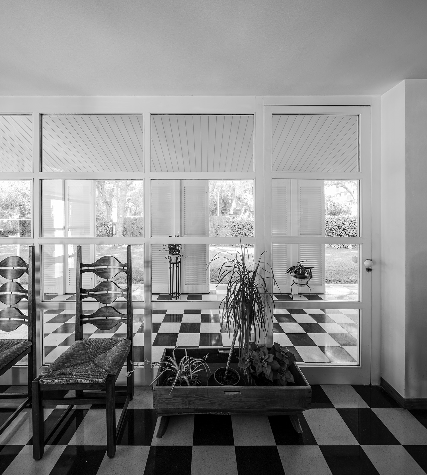 El pavimento de la planta baja, en damero blanco y negro, valora la continuidad entre interior y porche exterior, y muestra el orden y el módulo a partir del cual se ordena toda la casa.