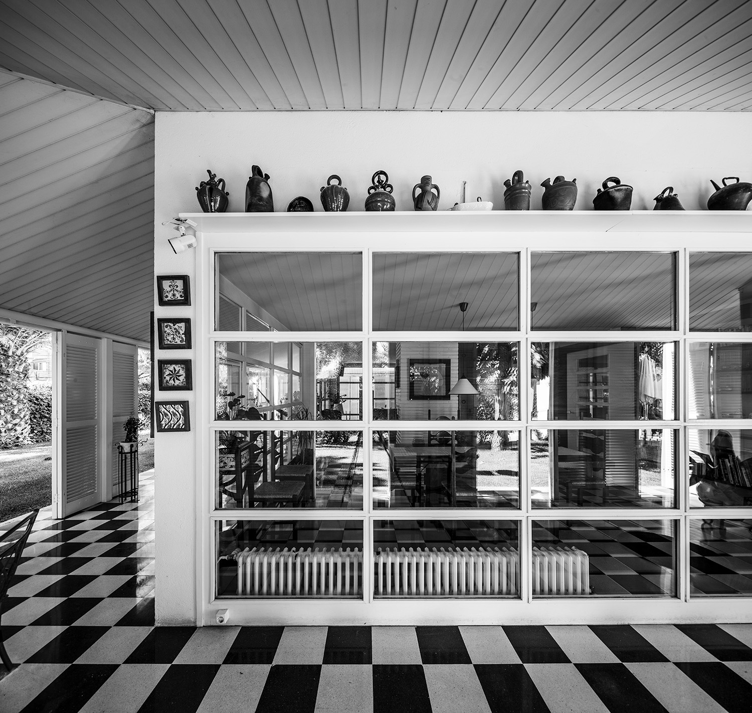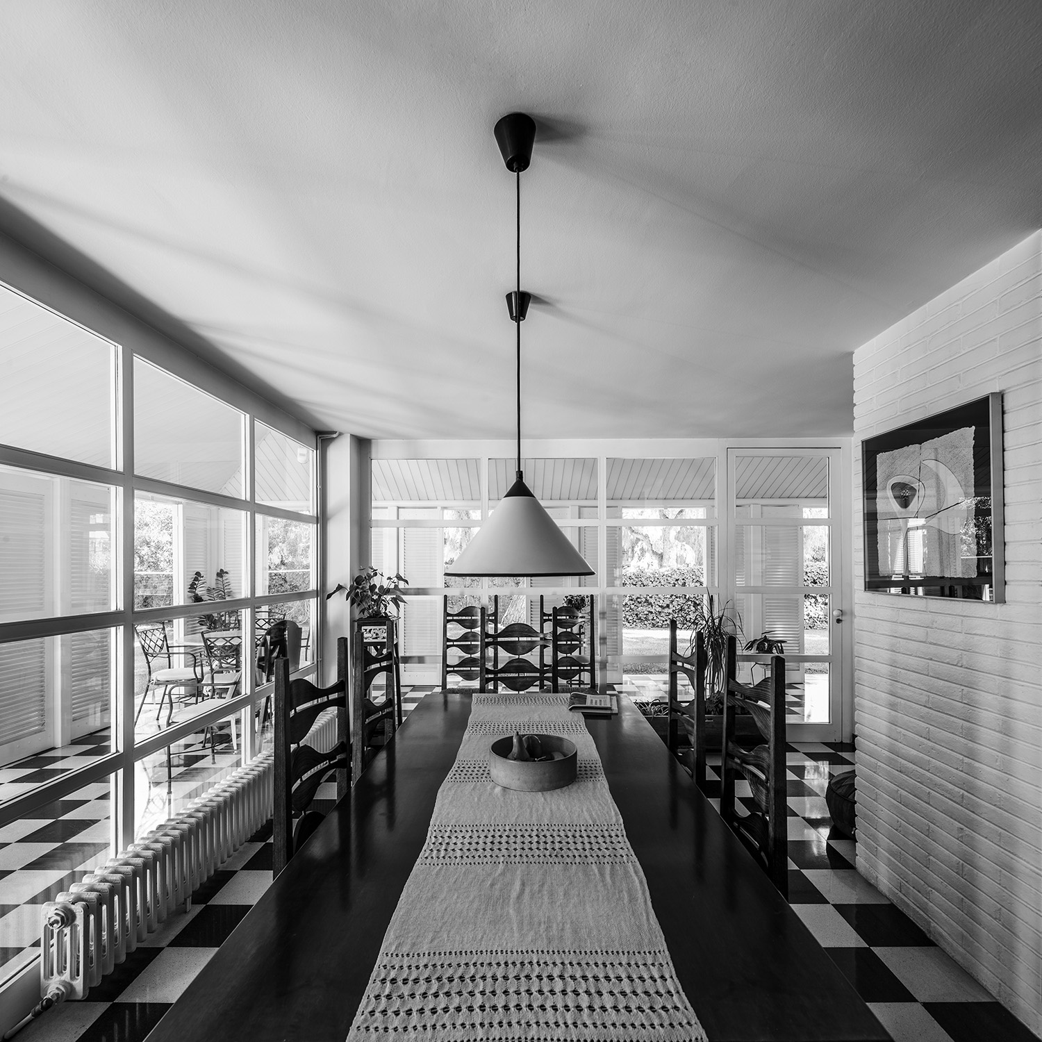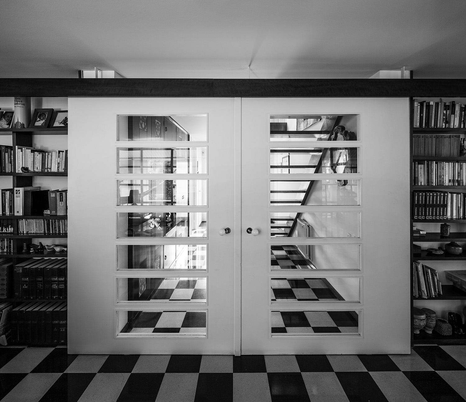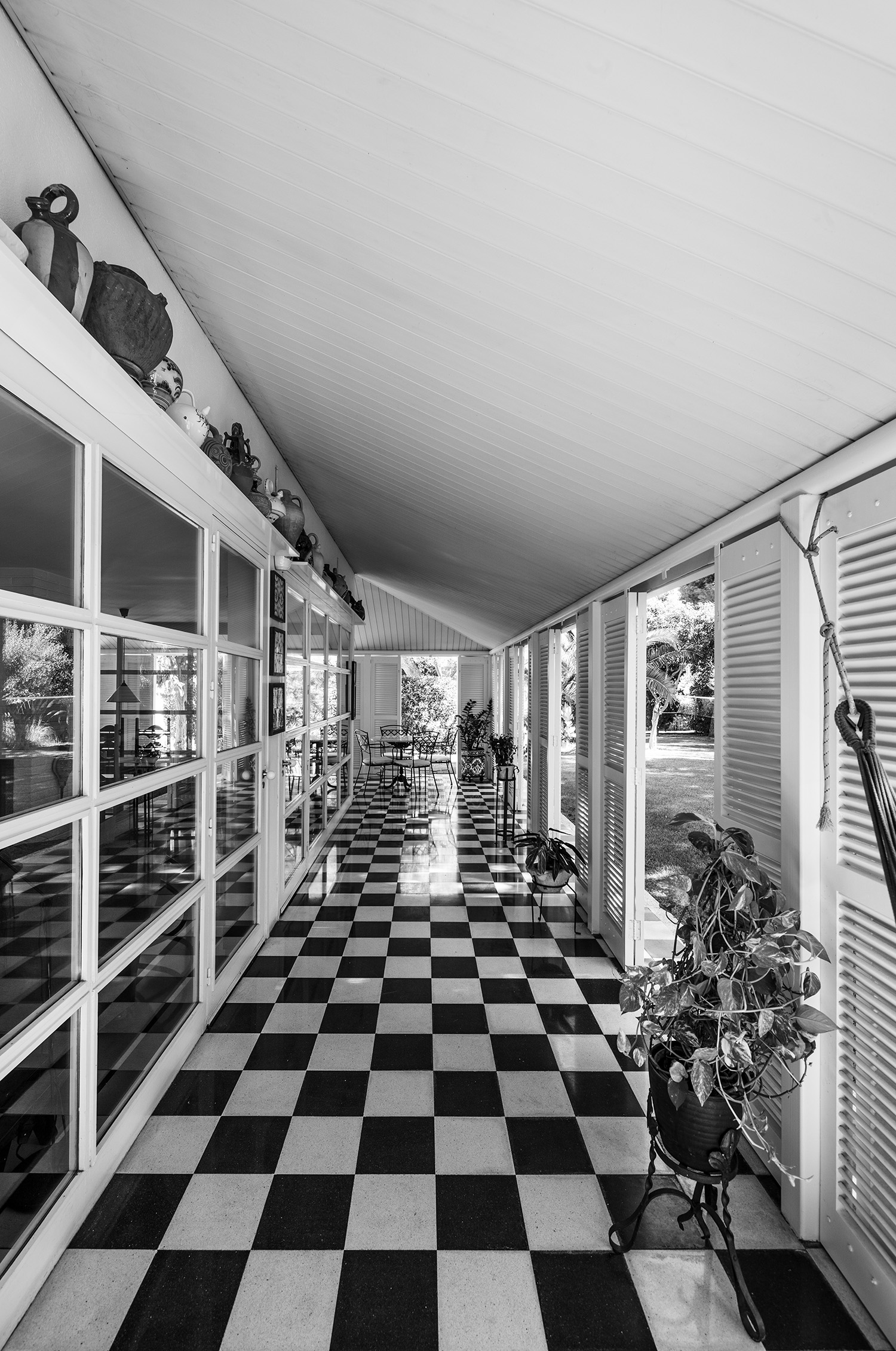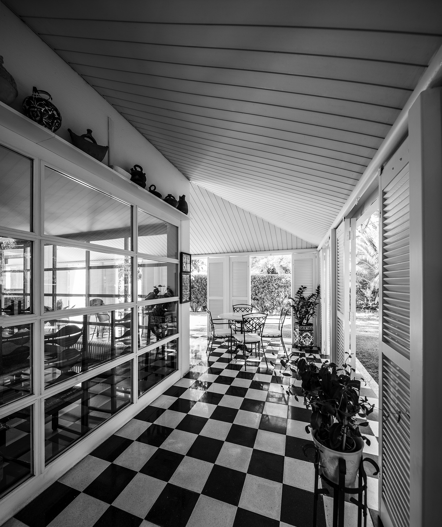 El pavimento de la planta baja, en damero blanco y negro, valora la continuidad entre interior y porche exterior, y muestra el orden y el módulo a partir del cual se ordena toda la casa.