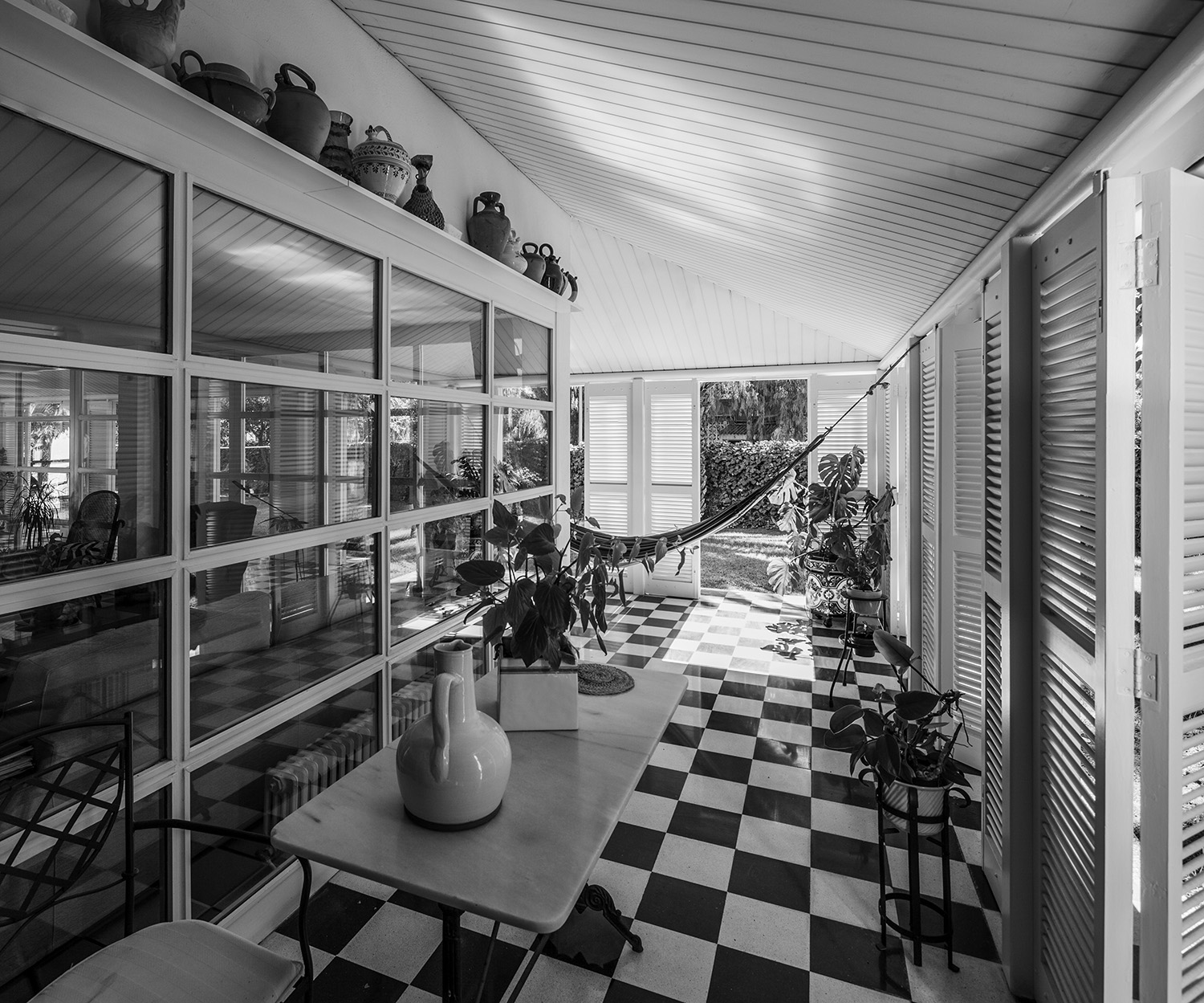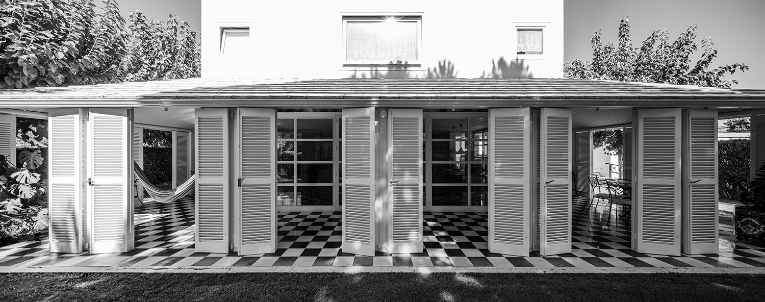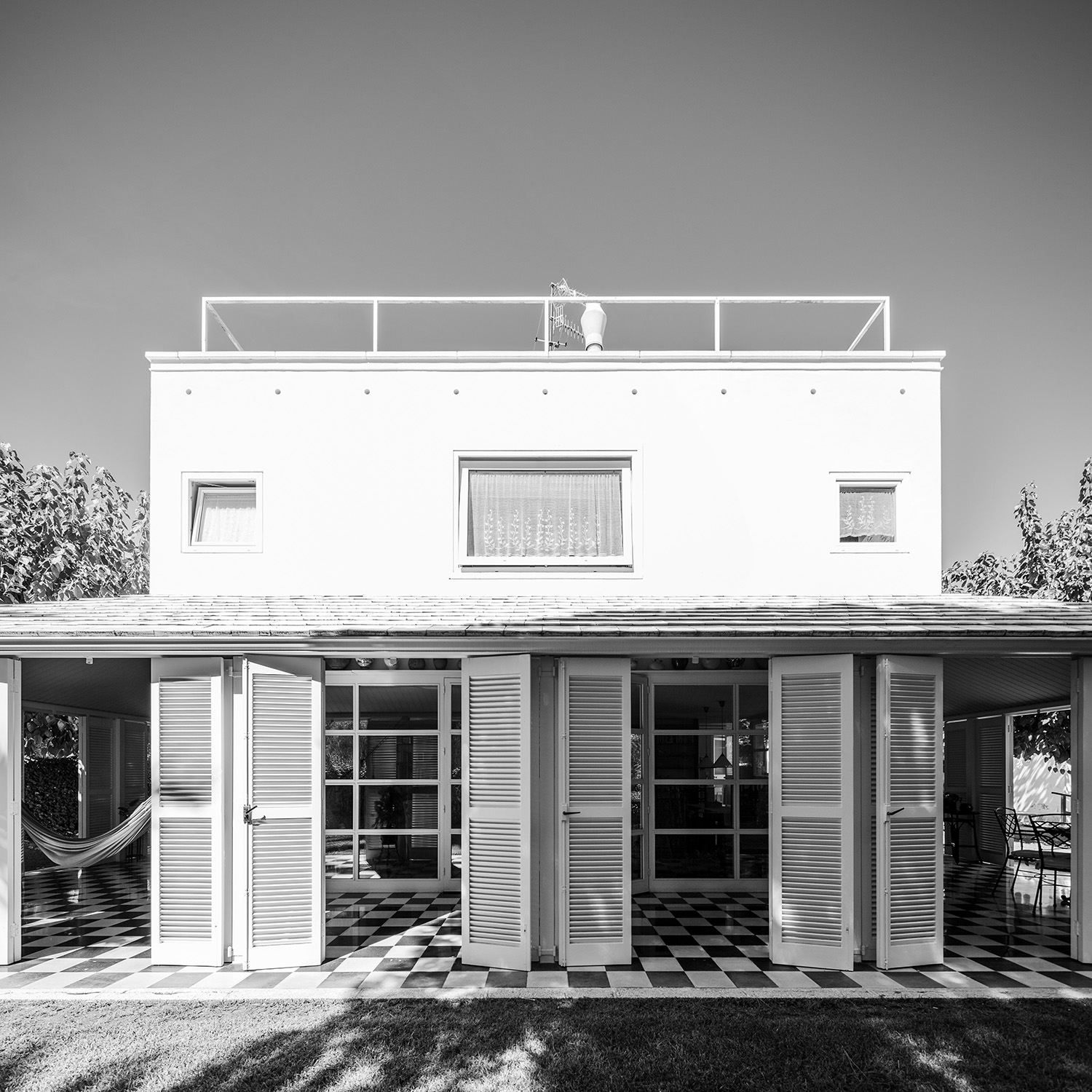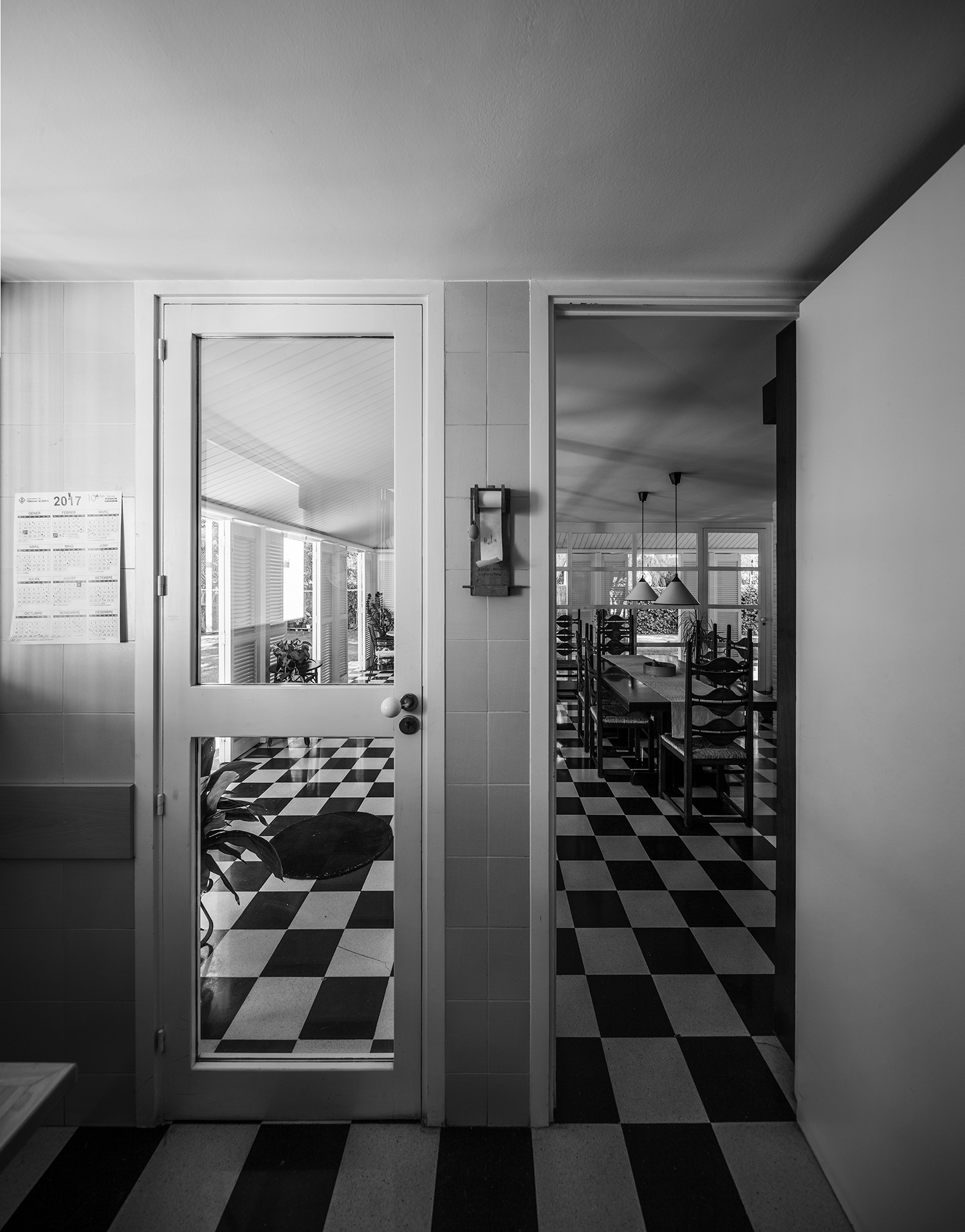 El pavimento de la planta baja, en damero blanco y negro, valora la continuidad entre interior y porche exterior, y muestra el orden y el módulo a partir del cual se ordena toda la casa.