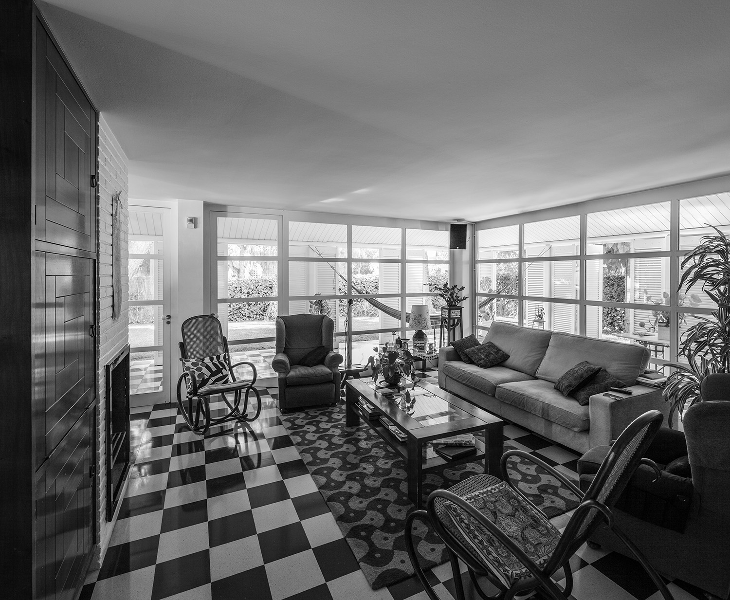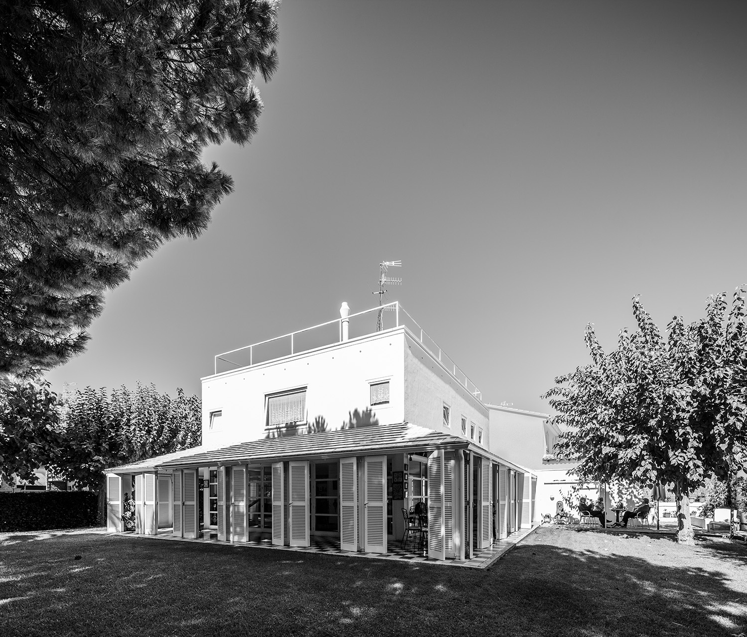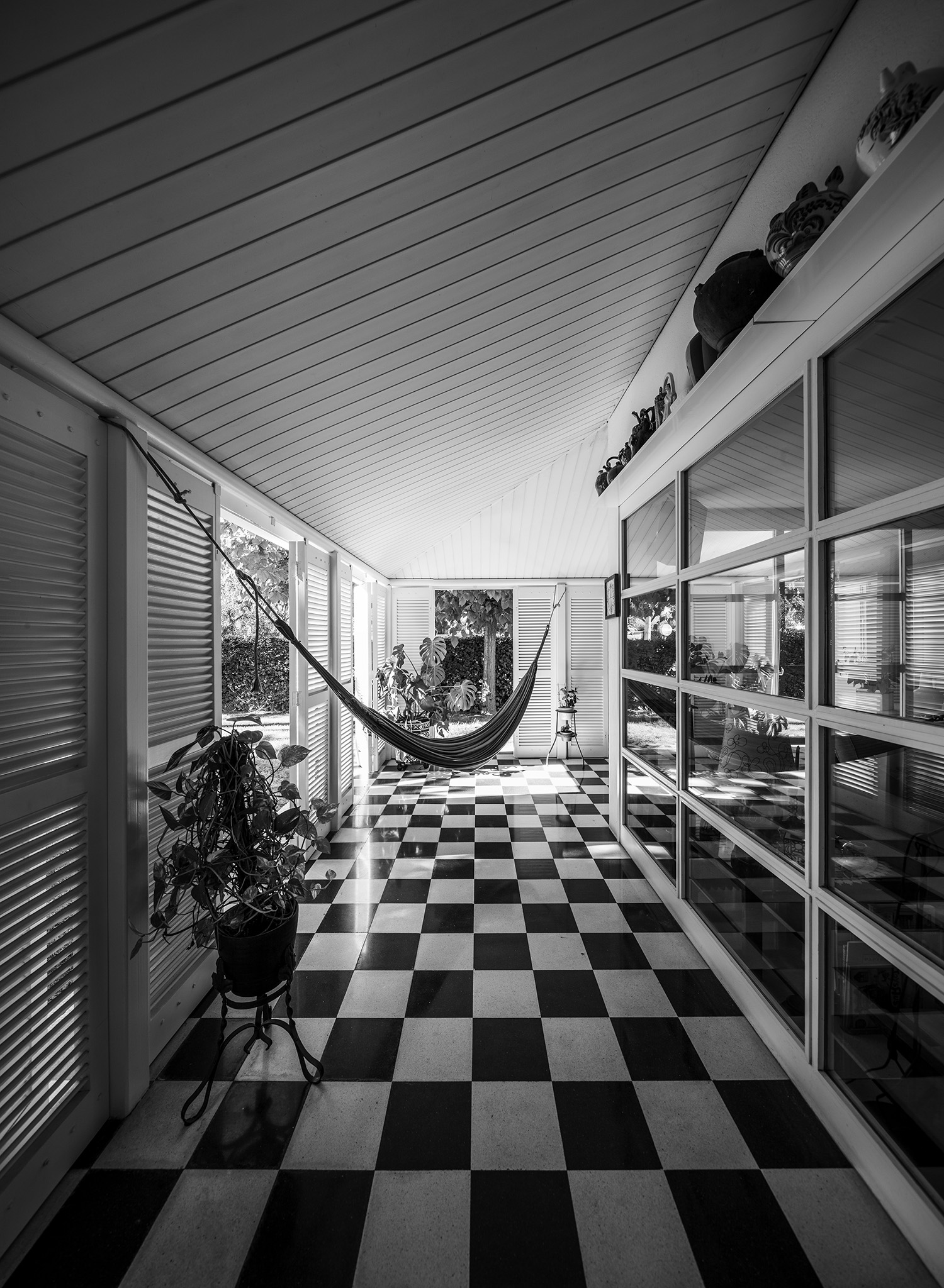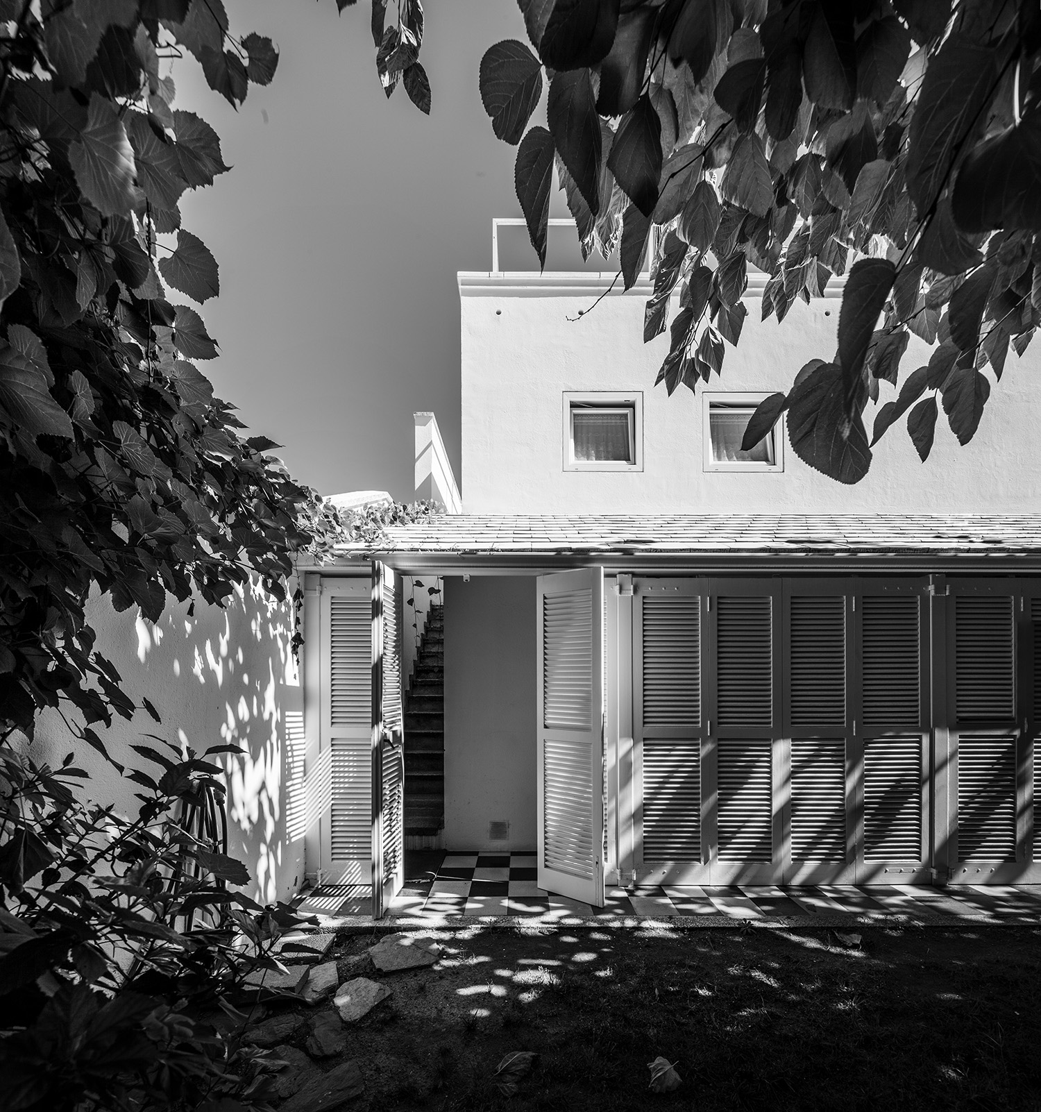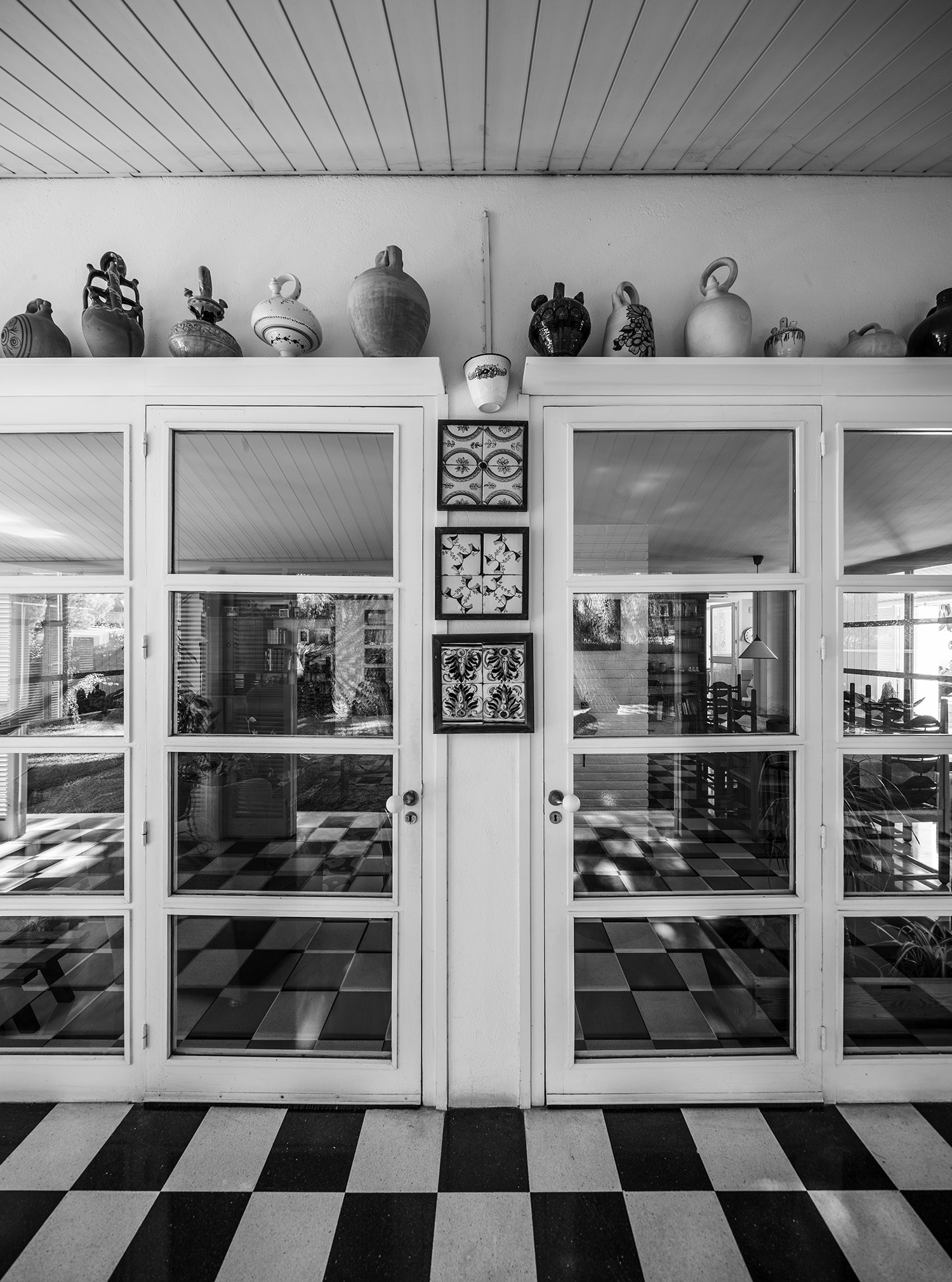 El pavimento de la planta baja, en damero blanco y negro, valora la continuidad entre interior y porche exterior, y muestra el orden y el módulo a partir del cual se ordena toda la casa.