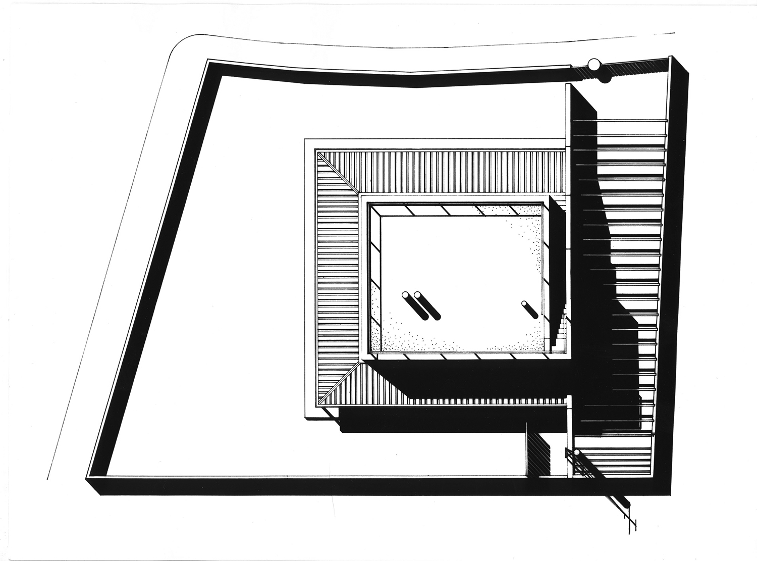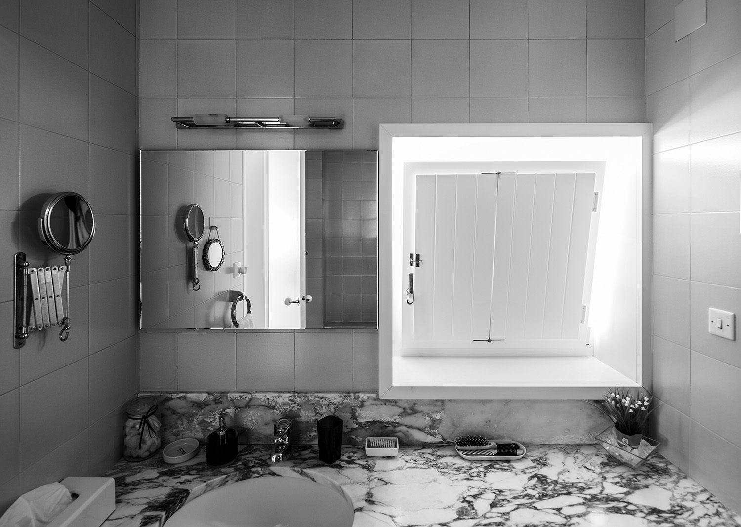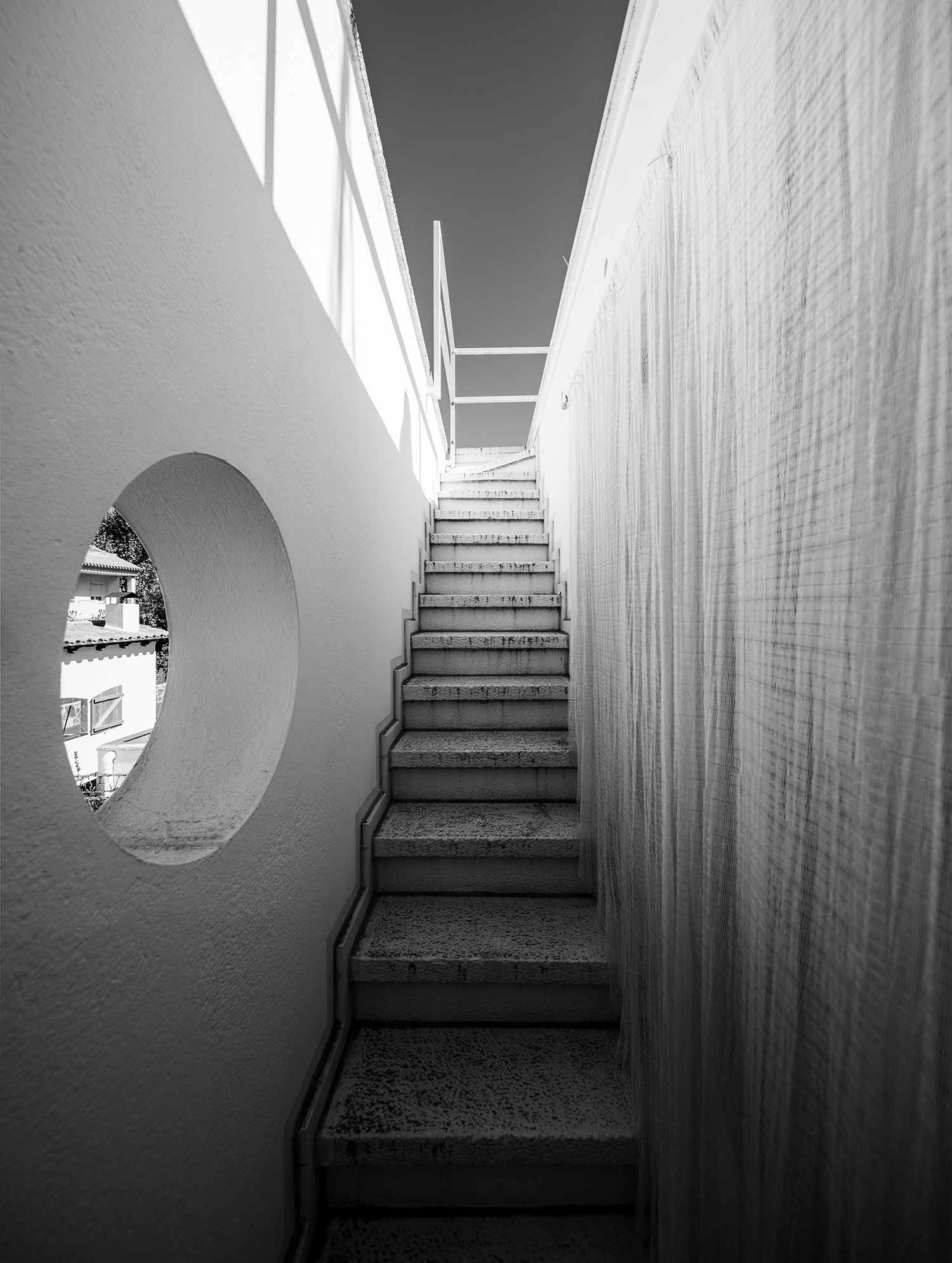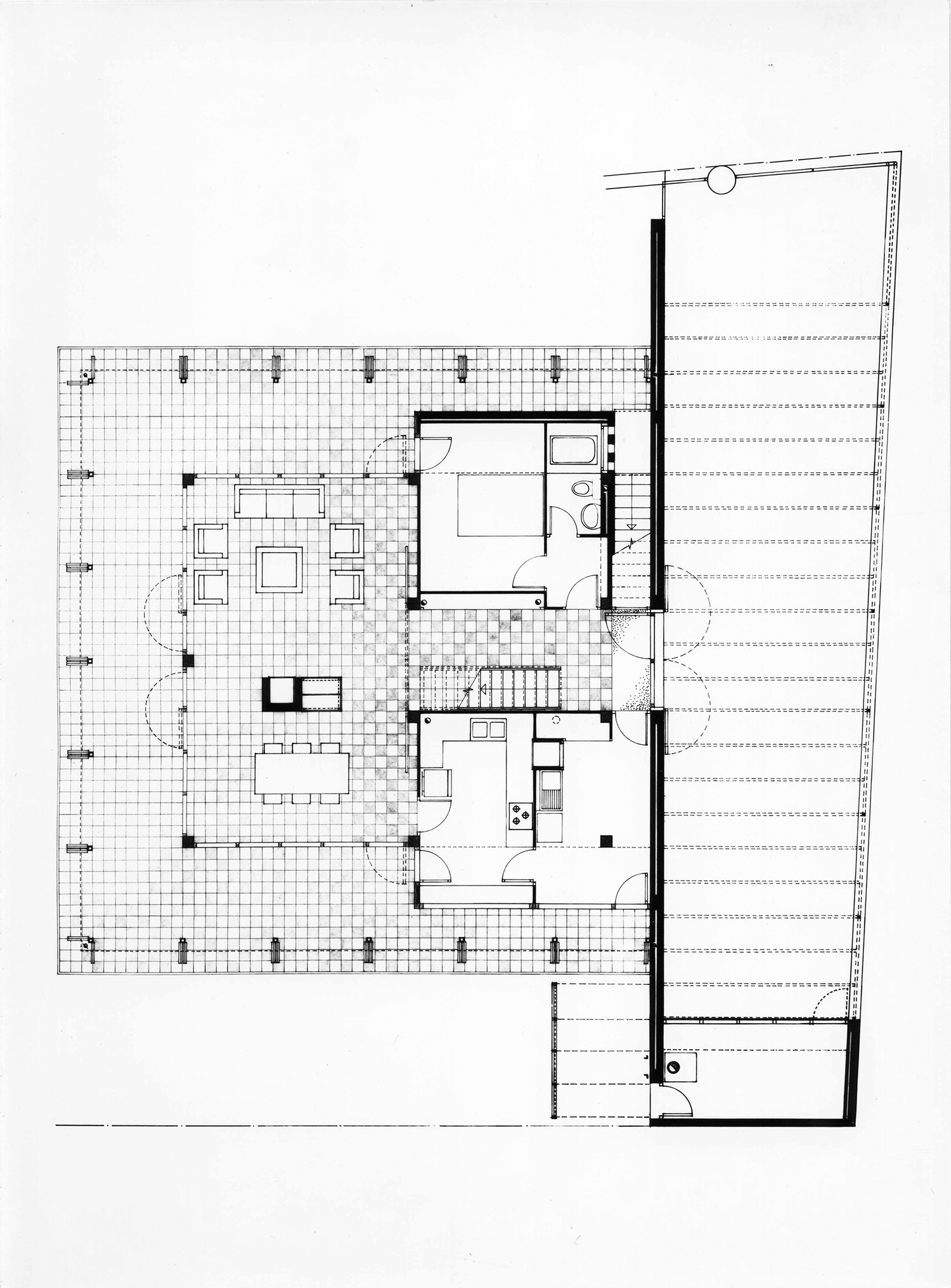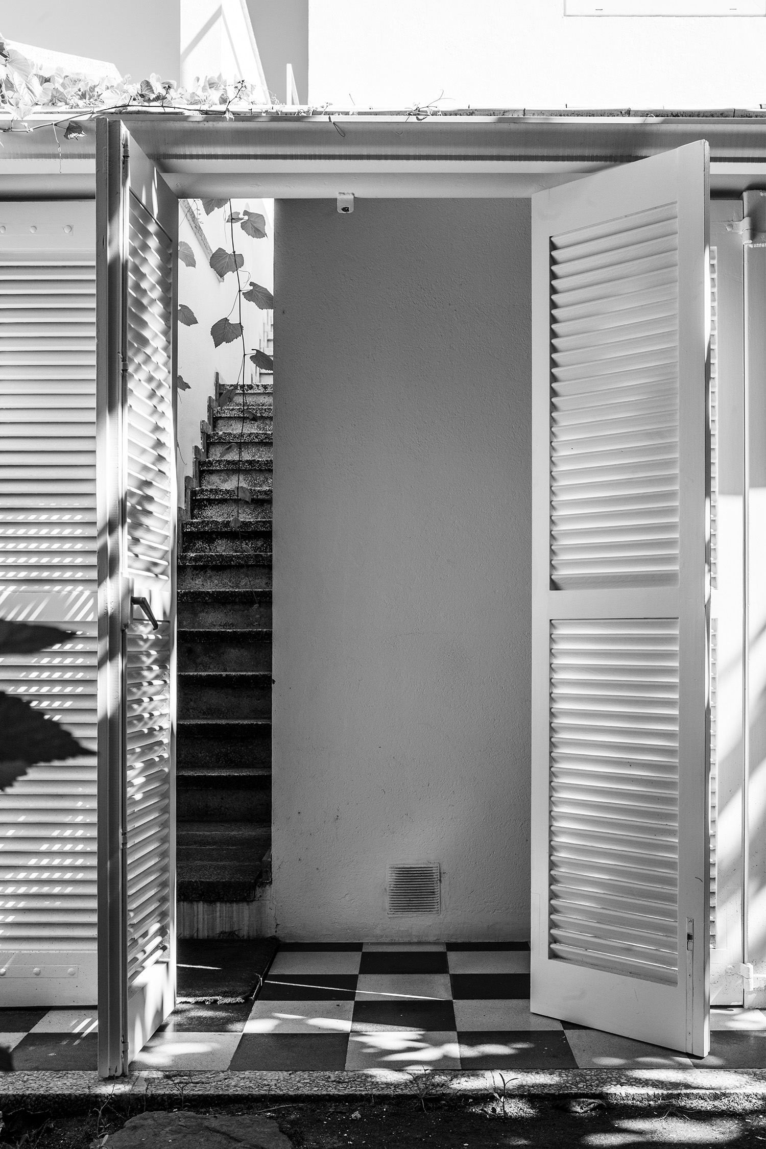 El pavimento de la planta baja, en damero blanco y negro, valora la continuidad entre interior y porche exterior, y muestra el orden y el módulo a partir del cual se ordena toda la casa.