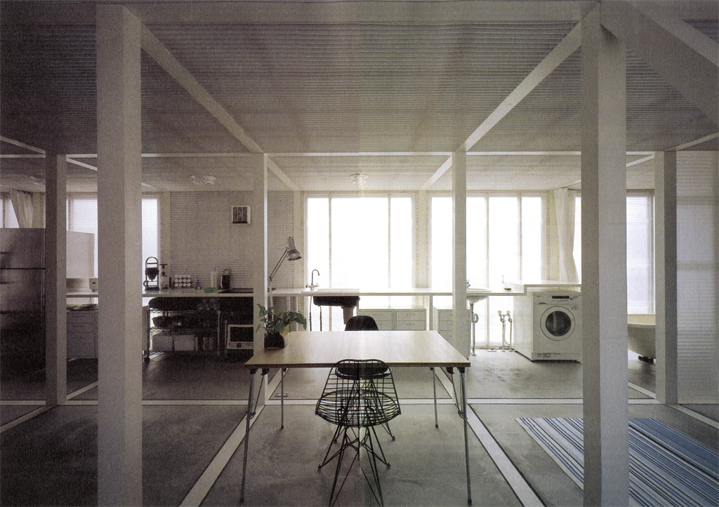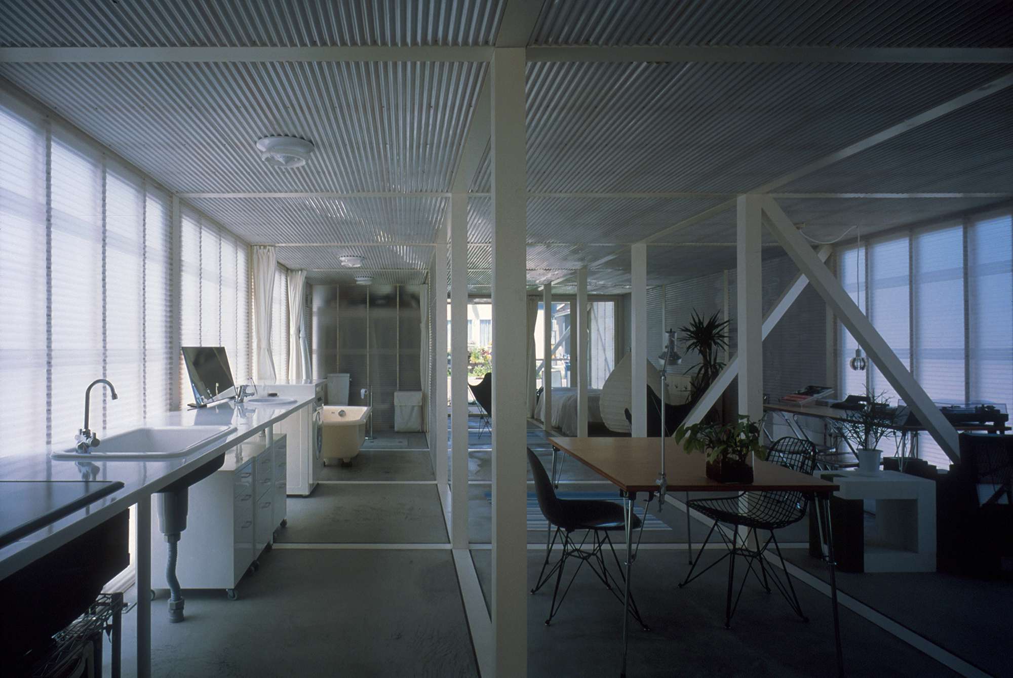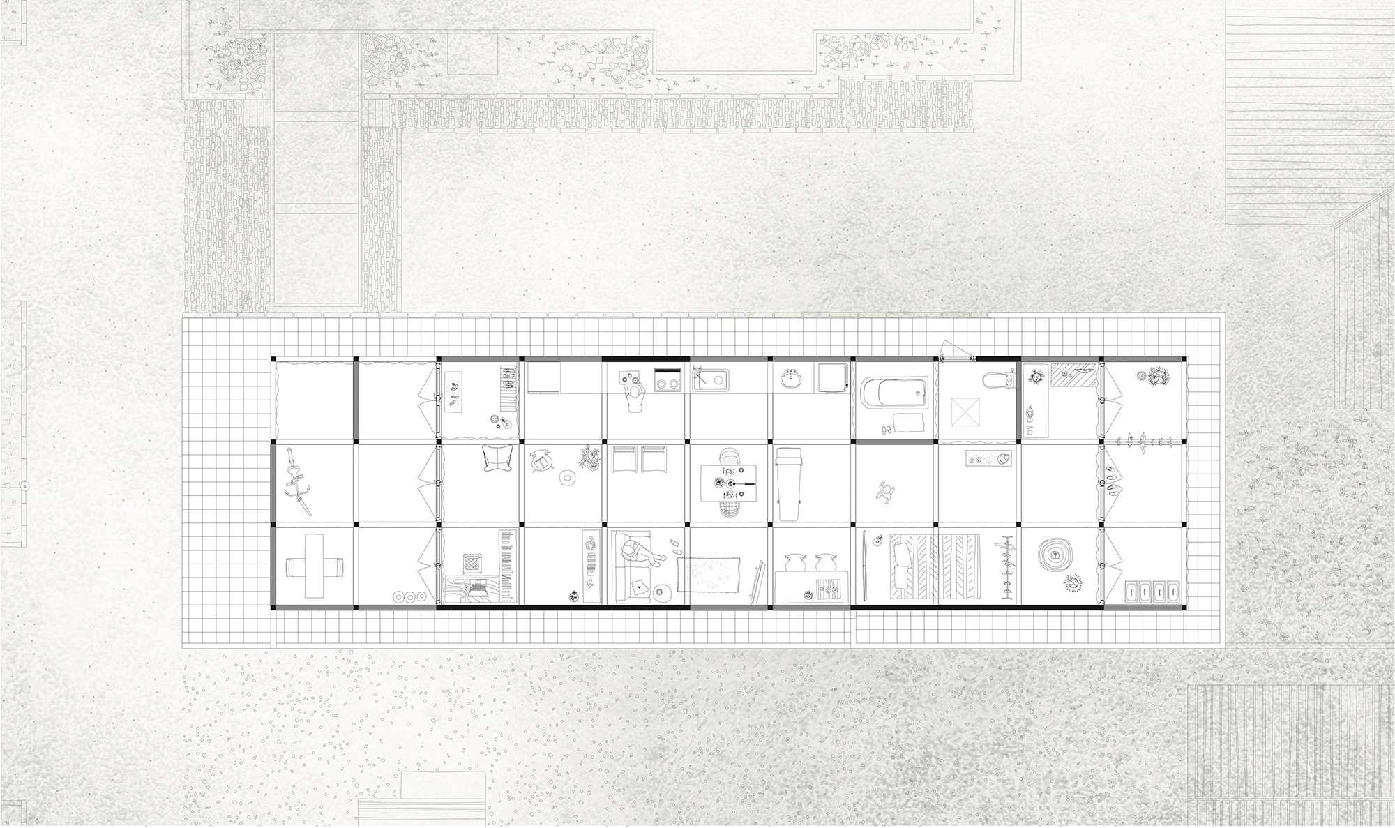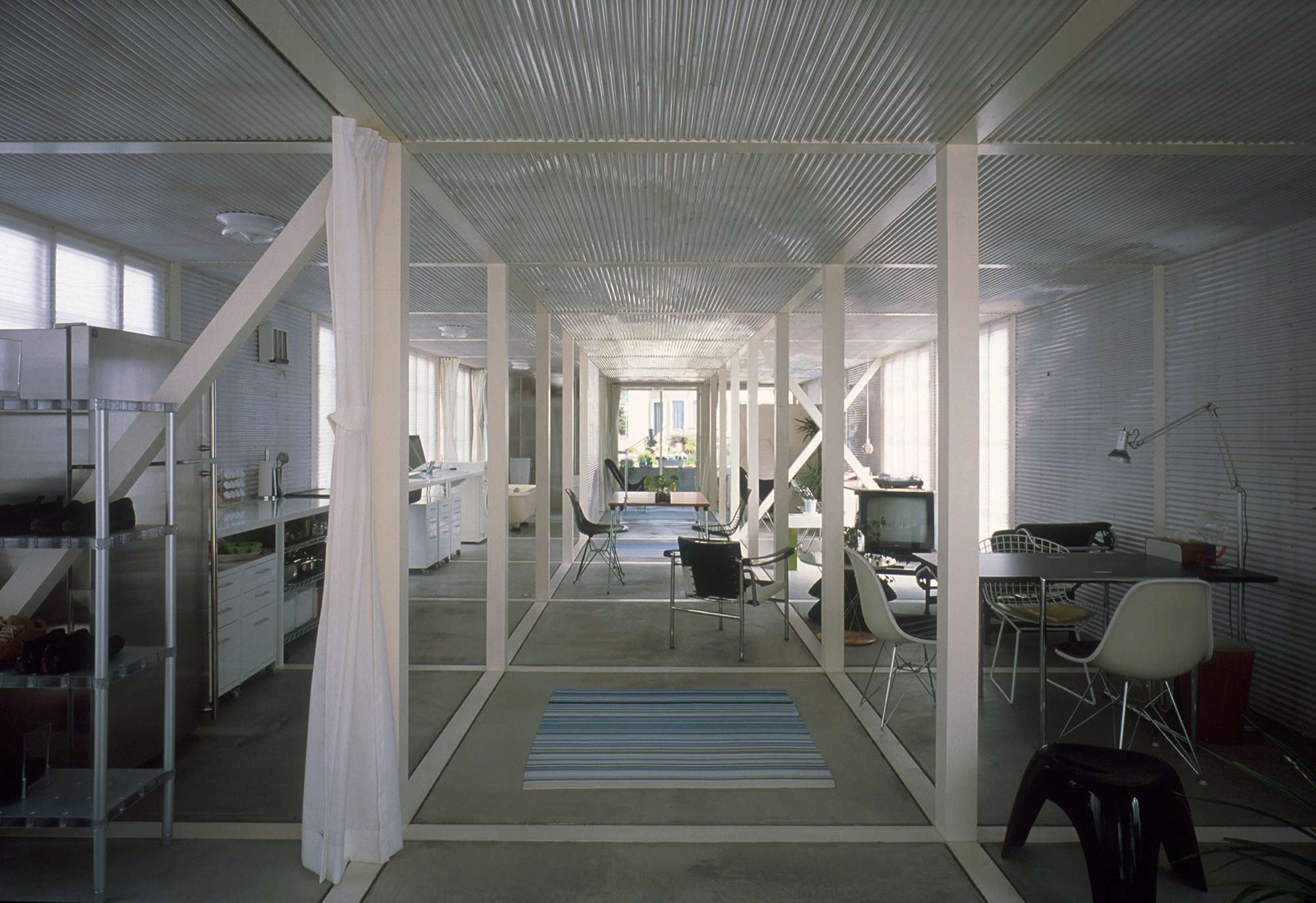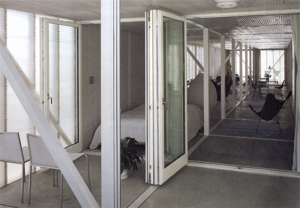 Una capsa lleugera i translúcida formada per 33 mòduls quadrats de 1,82 x 1,82 metres cadascun -la matriu és de 3 x 11-, amb un porxo d’accés força tancat a sud (3 x 2 mòduls), una galeria de servei a nord (3 x 1 mòduls) i un únic gran espai central de 80m2 (3 x 8 mòduls) organitzat només per 3 mampares fixes de policarbonat, algunes cortines mòbils i, sobretot, pels 16 pilars de secció quadrada. A fora, la façana, molt lleugera, combina tancaments de plàstic opacs i translúcids… i una única i inquietant balconera de vidre al bany.