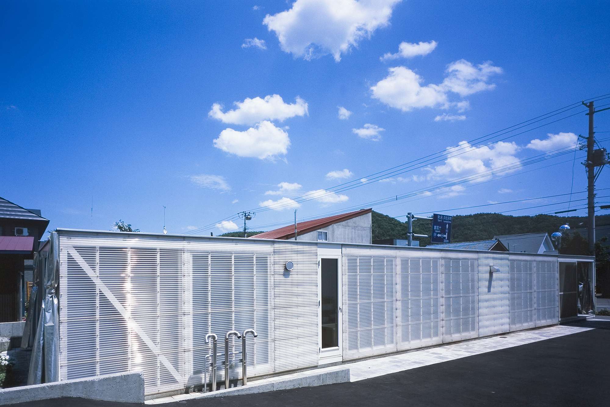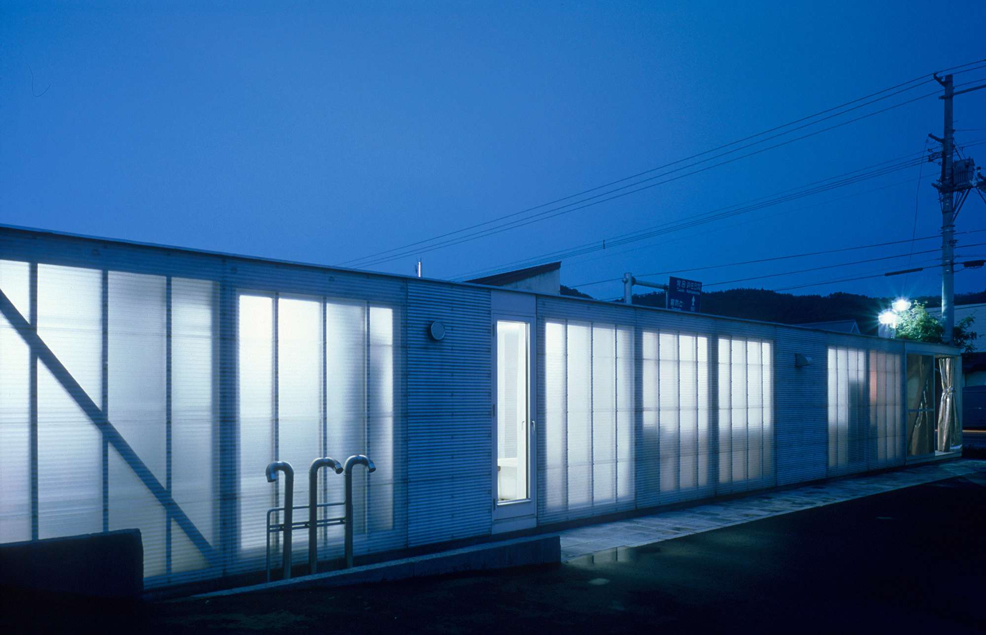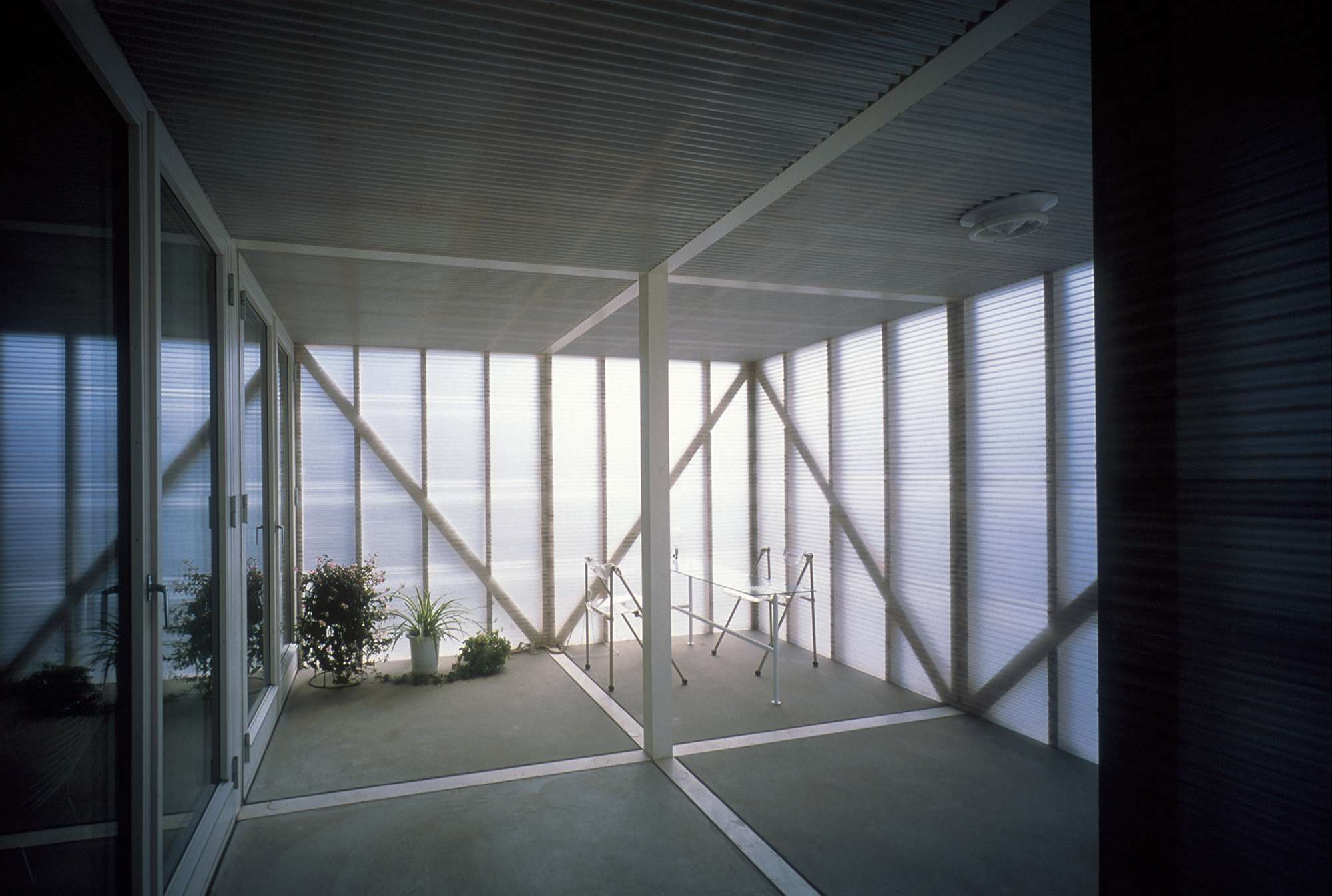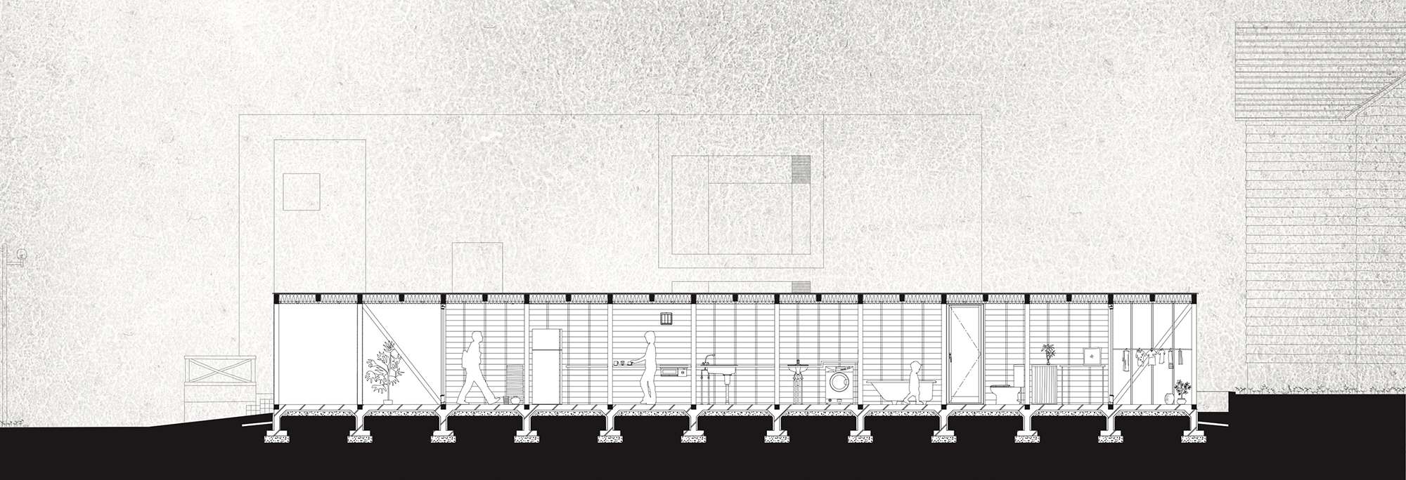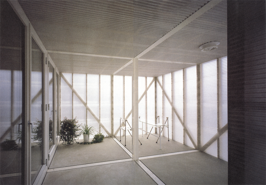Una capsa lleugera i translúcida formada per 33 mòduls quadrats de 1,82 x 1,82 metres cadascun -la matriu és de 3 x 11-, amb un porxo d’accés força tancat a sud (3 x 2 mòduls), una galeria de servei a nord (3 x 1 mòduls) i un únic gran espai central de 80m2 (3 x 8 mòduls) organitzat només per 3 mampares fixes de policarbonat, algunes cortines mòbils i, sobretot, pels 16 pilars de secció quadrada. A fora, la façana, molt lleugera, combina tancaments de plàstic opacs i translúcids… i una única i inquietant balconera de vidre al bany.