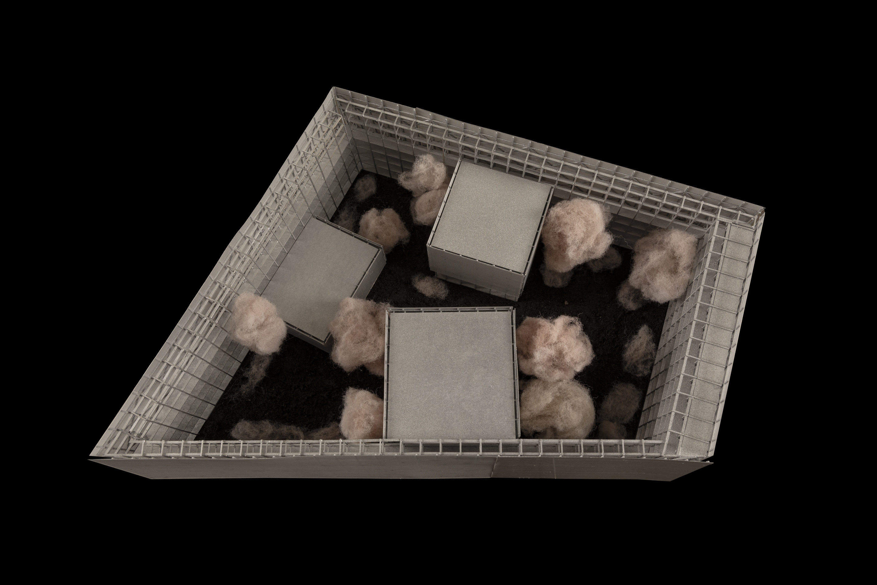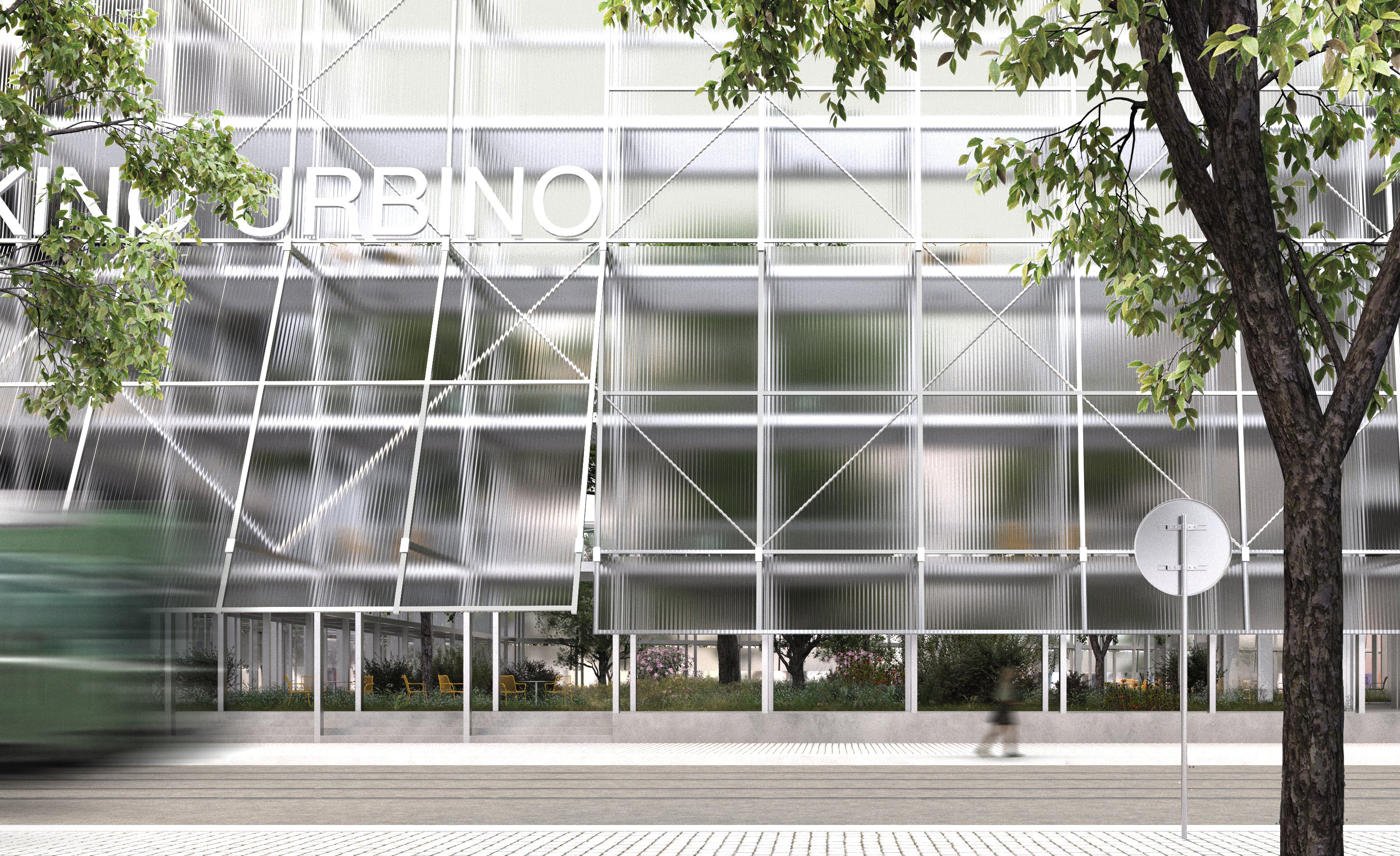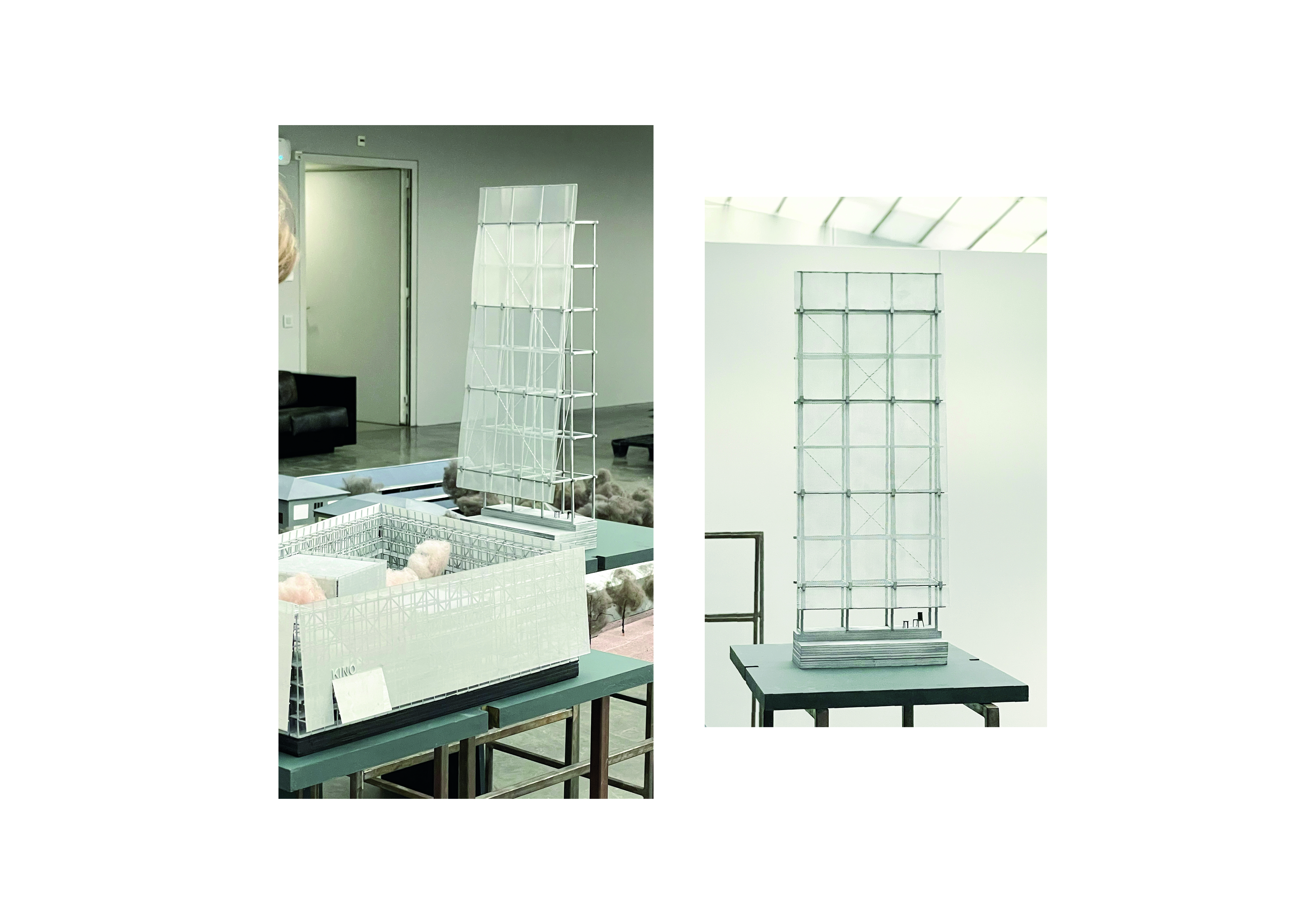 A reference point for the outer skin is an abstract wall in the city with inviting light, which relates to licht-ar- chitecture of cinemas. The volumes were placed inside the perimeter, in order to create public niches, where one bigger space is meant for outdoor film-screening. The backstage character reflects itself in the surround- ing scenography workshops. I am trying to solve the problem of the overheating of this street by creating a garden and a light structure there, with a new permeable surface. That light steel structure is covered with semi-translucent panels.