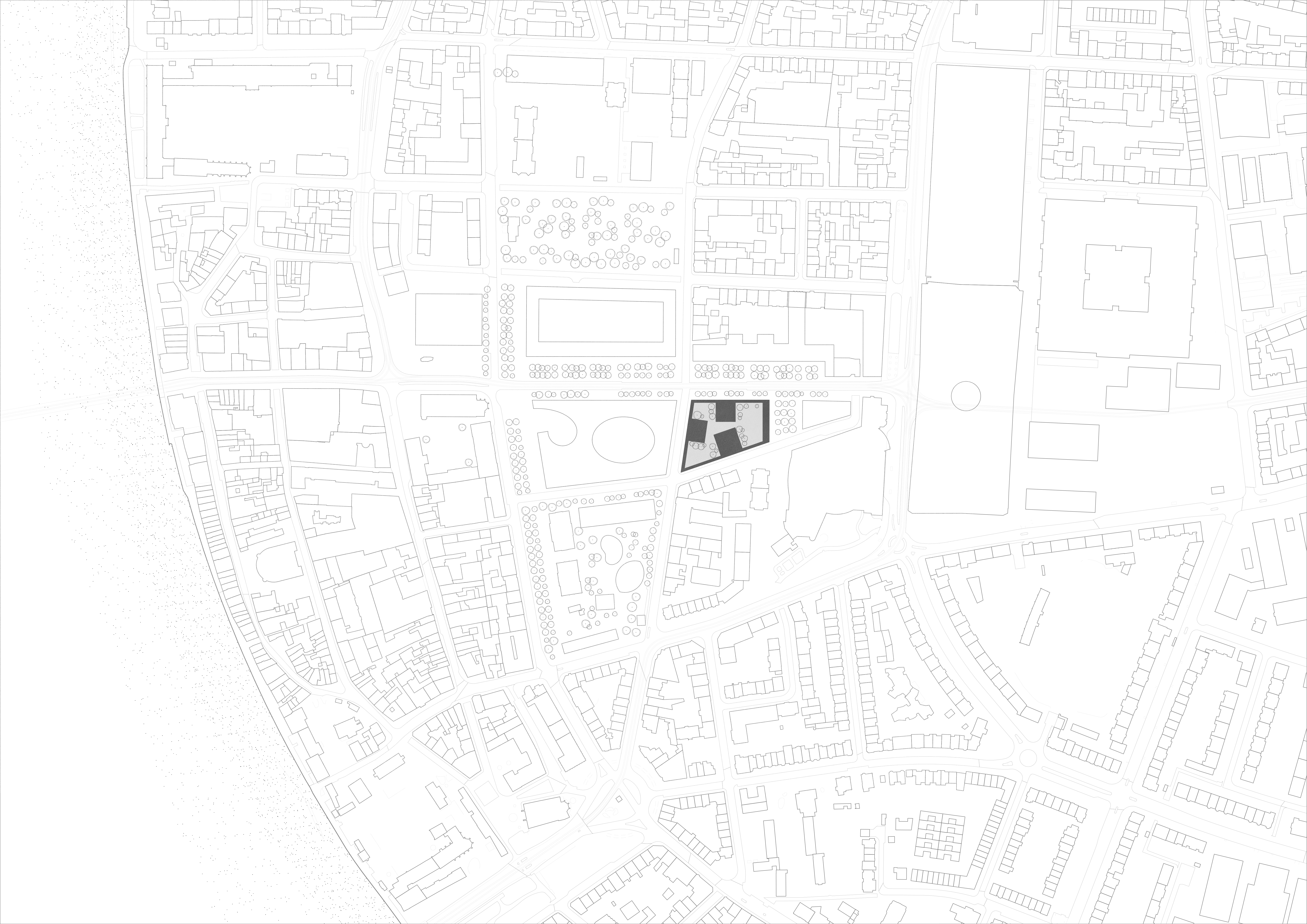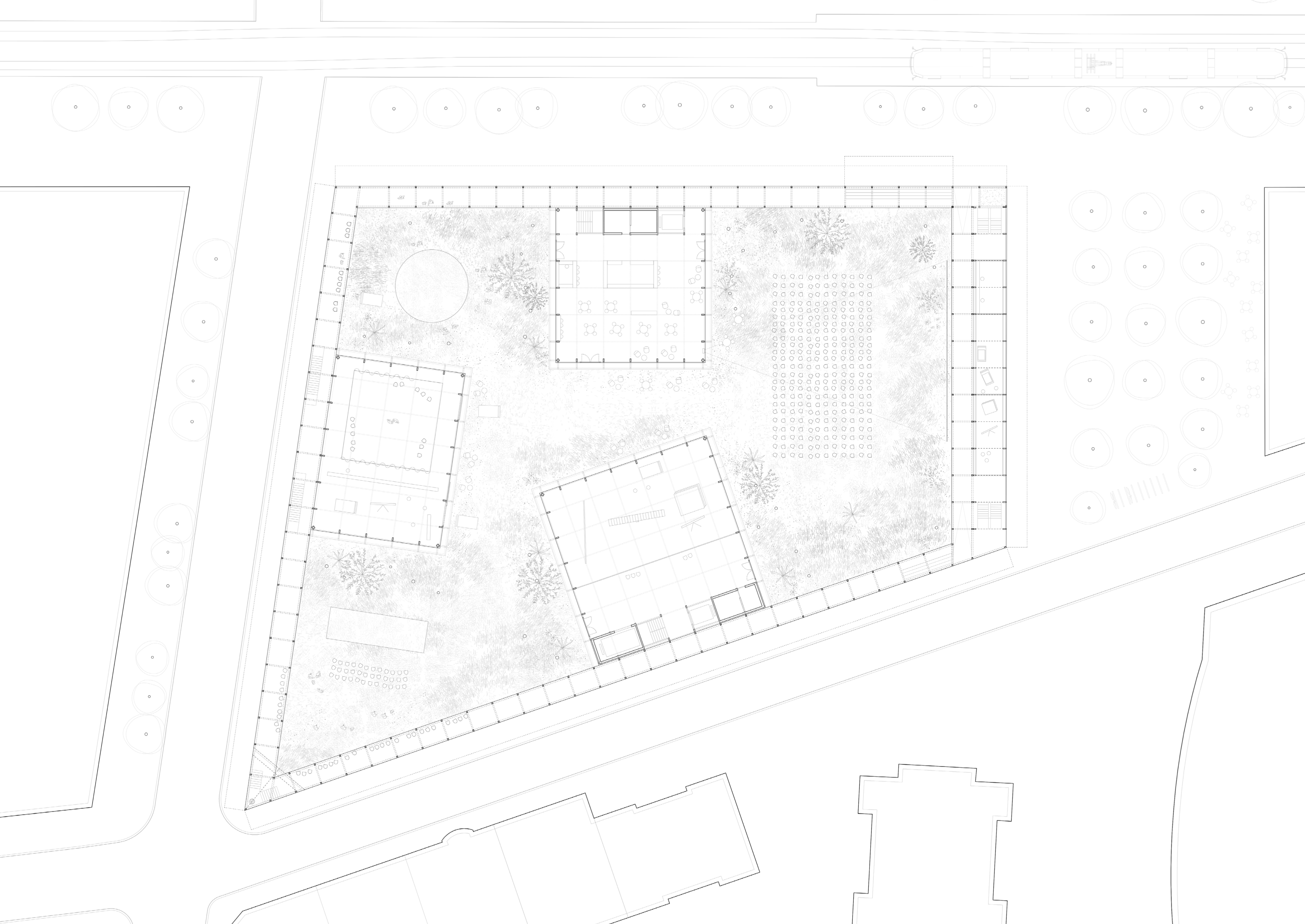 The project provides an all-time use extension of a public space on Clarastrasse. It hosts cultural events, the- atre, performance, and film screenings. Primary gesture is an outer perimeter. Added volumes are defining the internal garden. Besides the permeable park, open-air niches are used for outdoor cinema and theatre.