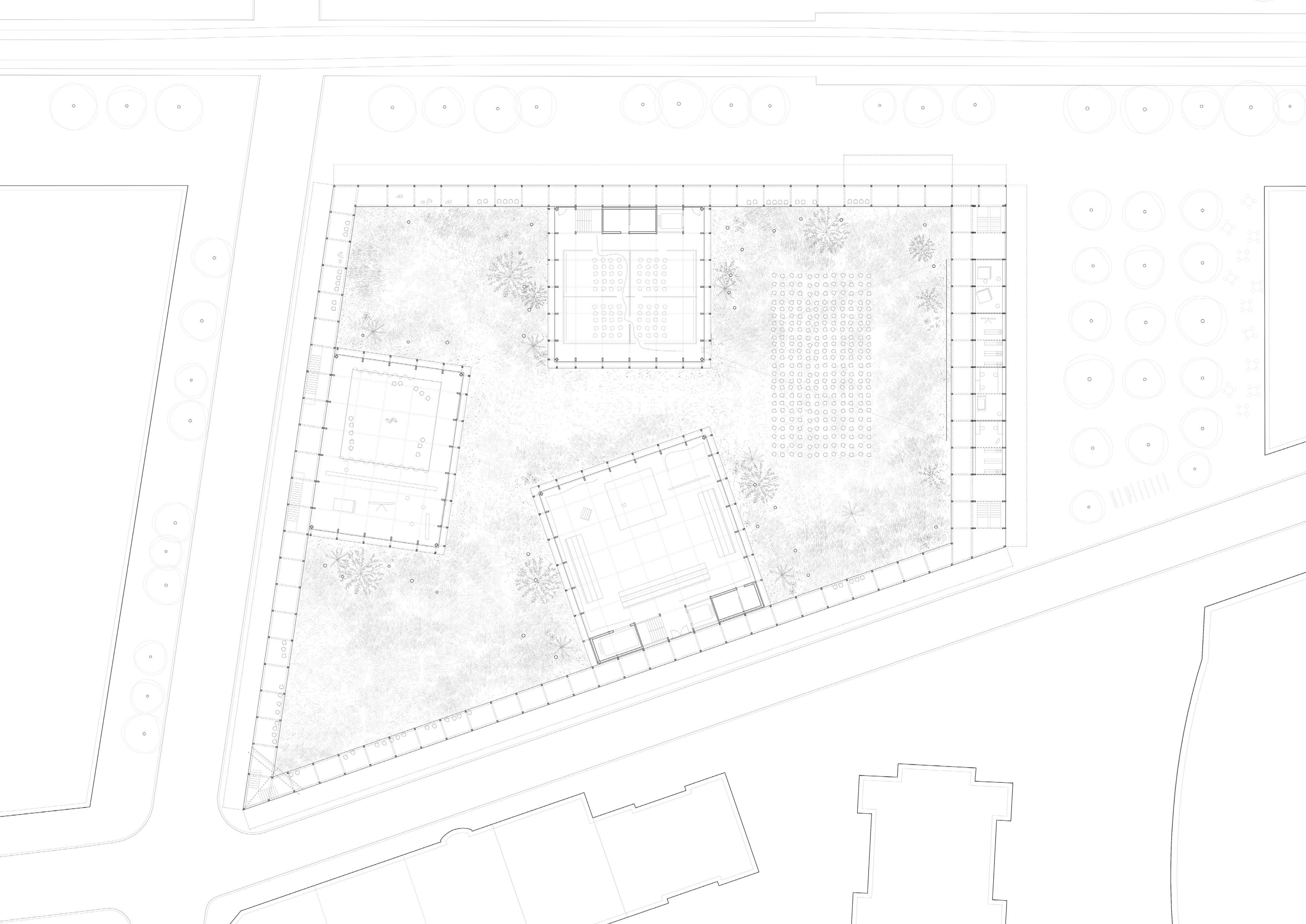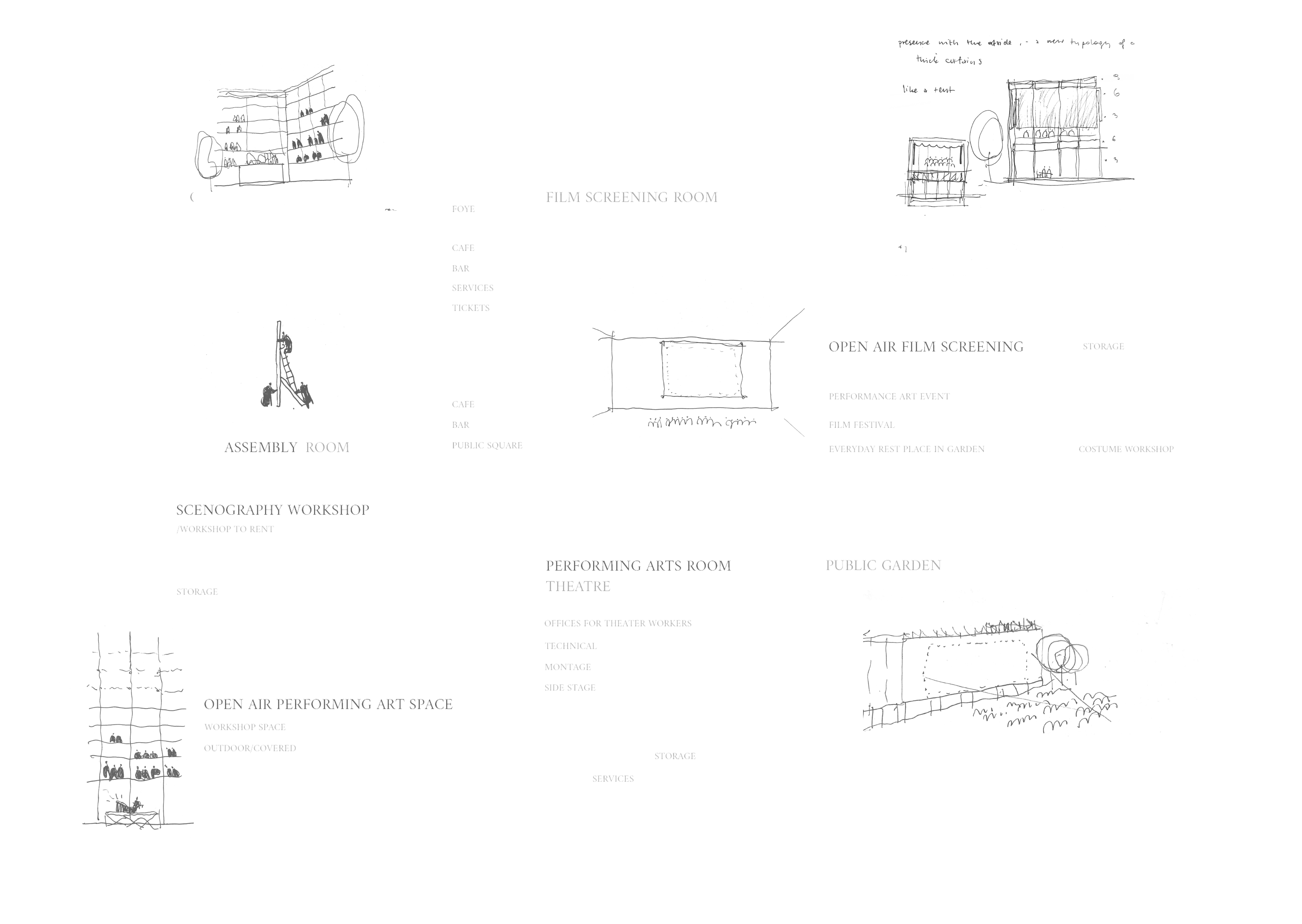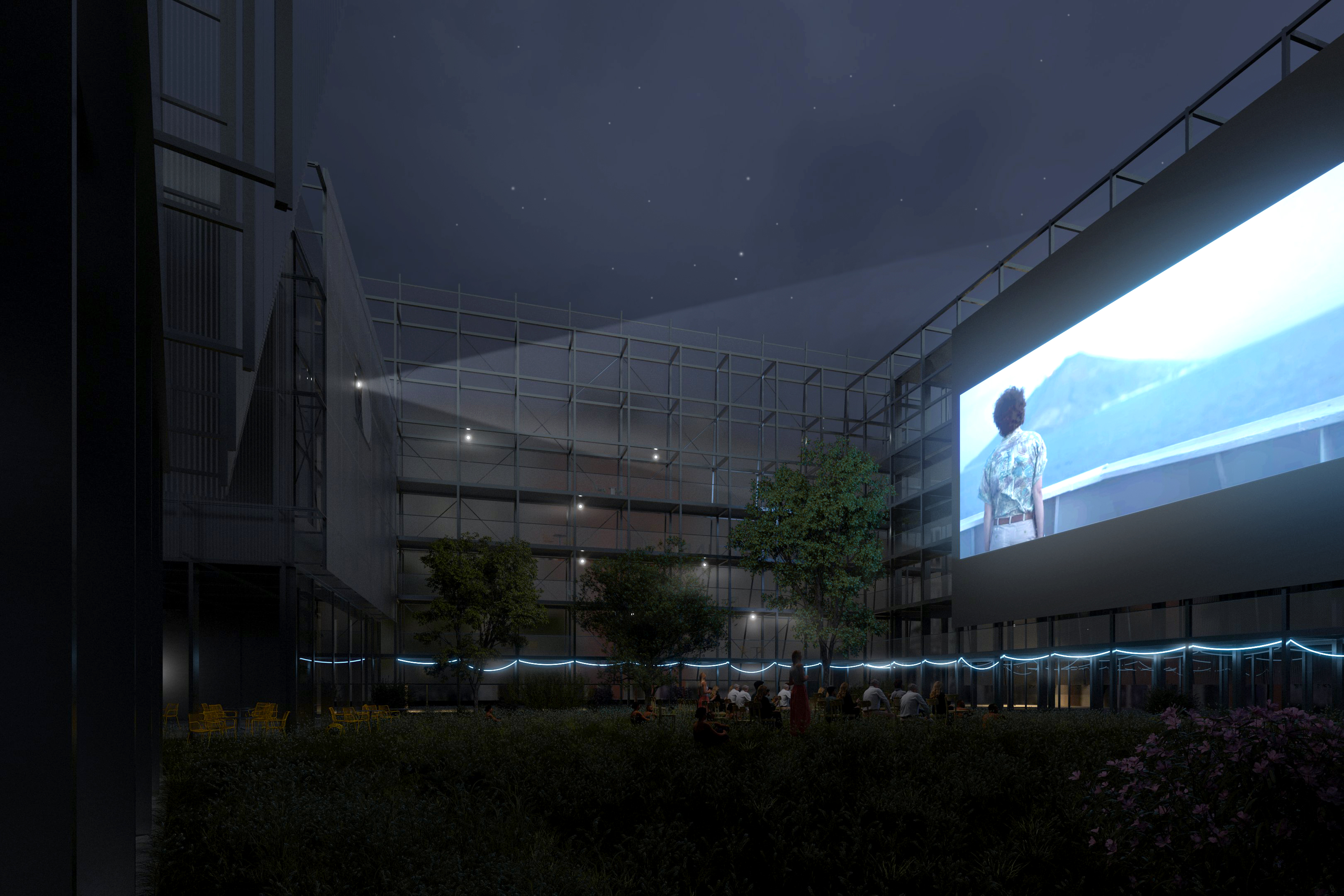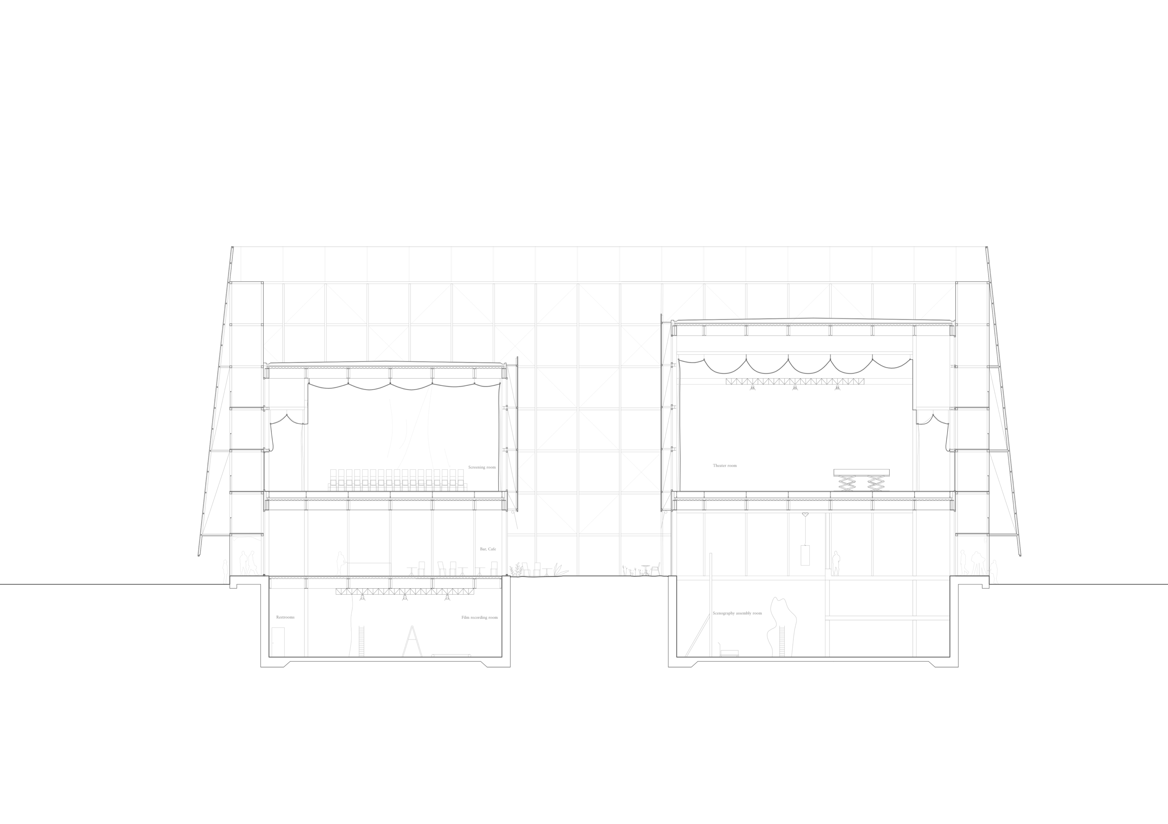 With creation of open-air stages and use of the gallery, the project redefines the traditional typology of cine- mas and theatres, opening them up to the outside world, allowing for a versatile programme.