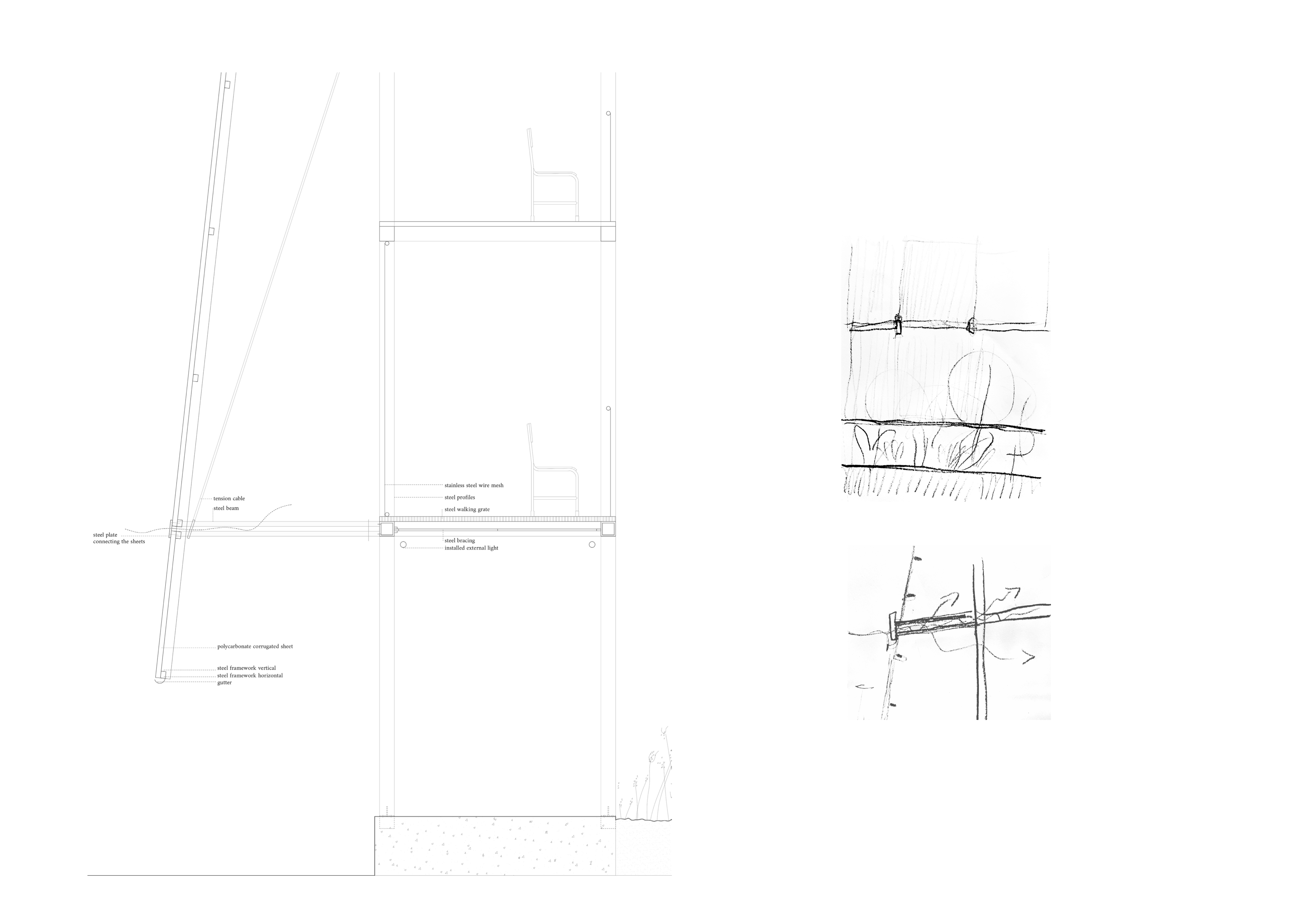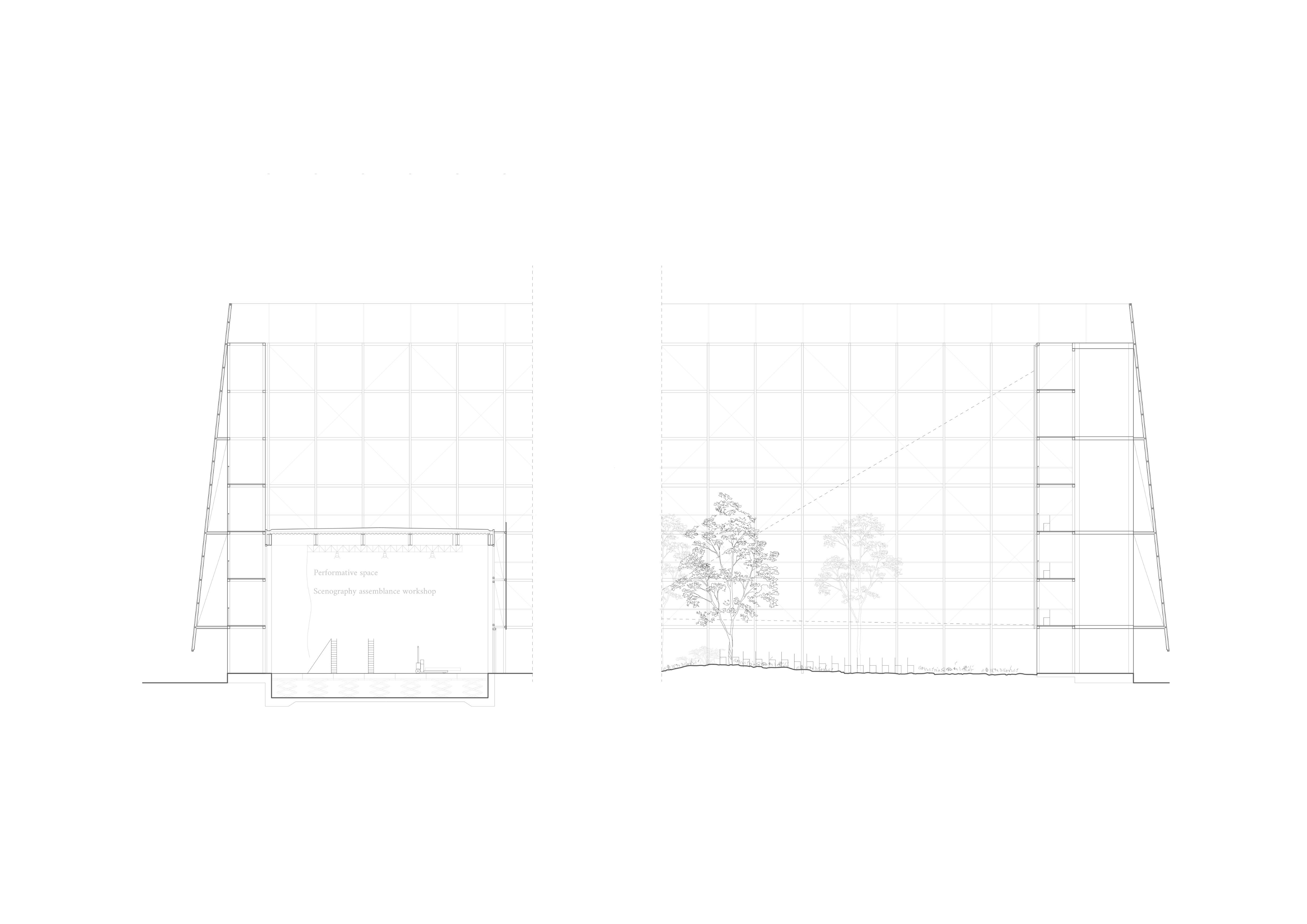 The structure is a steel frame, built from repetitive profiles, like a scaffolding structure. This light and strong construction allows it to be a stable outdoor “wall”. The modular structure is accessible on most of the floors for visitors, performing artists and workers, and it works as a gallery. The grid of the structure follows the outer perimeter of the site, so as to introduce a large amount of theatre garden space between the wall and the outside streets. It has an attached translucent panel that creates a sense of closure to the space, and through the use of tension cables and steel beams attached to the main wall structure, it allows the panel to be angled.