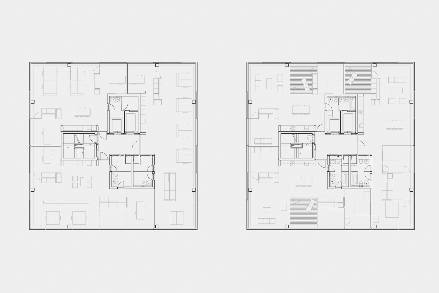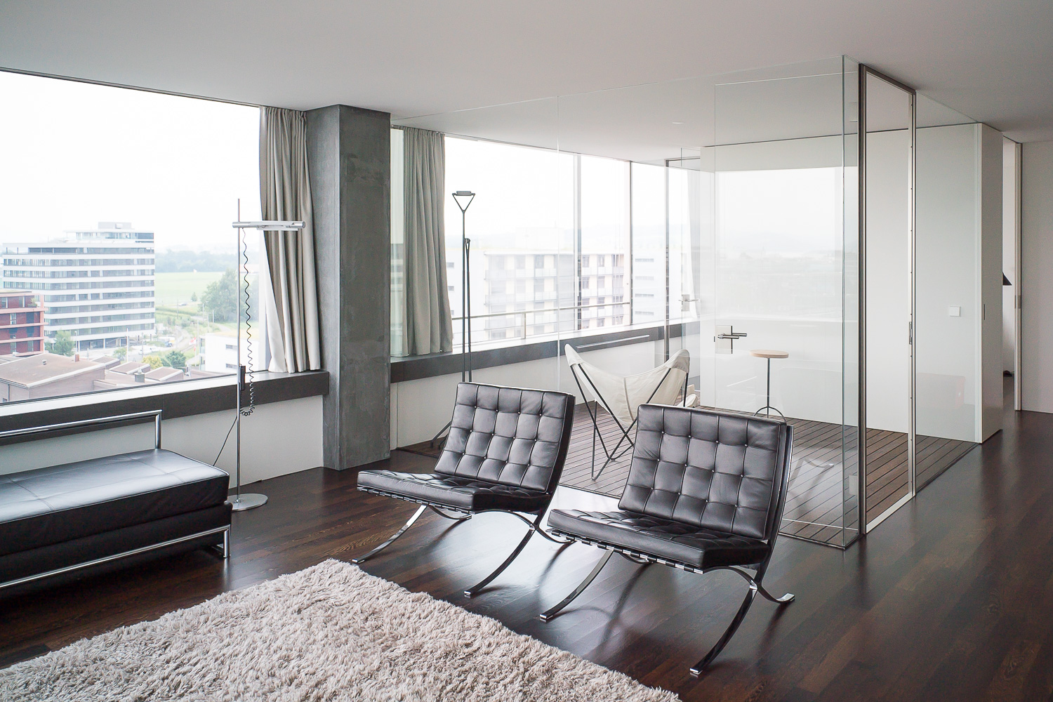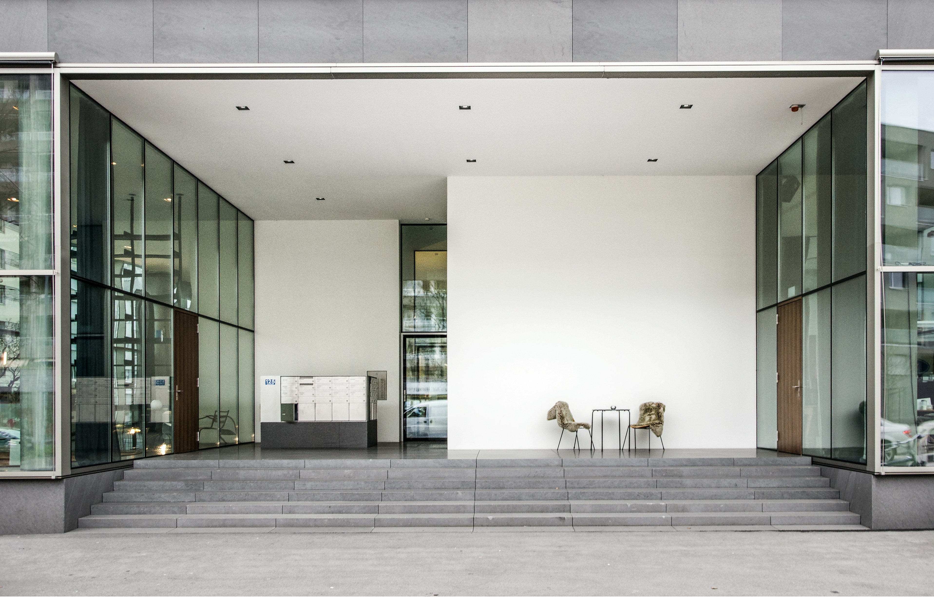 The vertical access and infrastructure of the B125 is distributed over three cores in the centre of the building. The first four floors house offices. Above this are 13 identical residential floors, each with three apartments. The apartments have three to four rooms and are between 100 and 135 square meters in size. All have horizontally sliding windows and a glazed loggia that is not visible from the outside. There is a two-story parking garage under the building and the adjacent outdoor area.