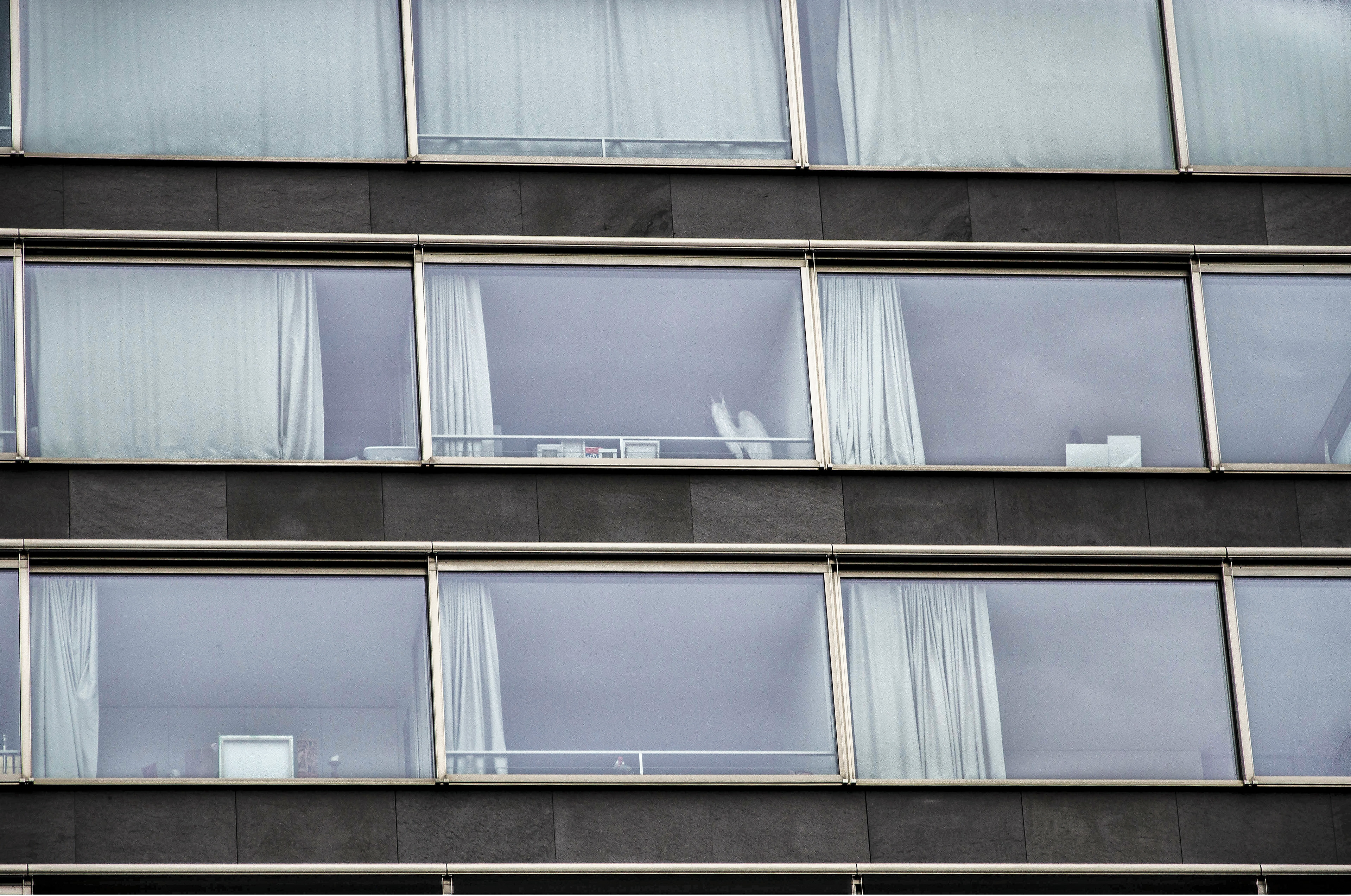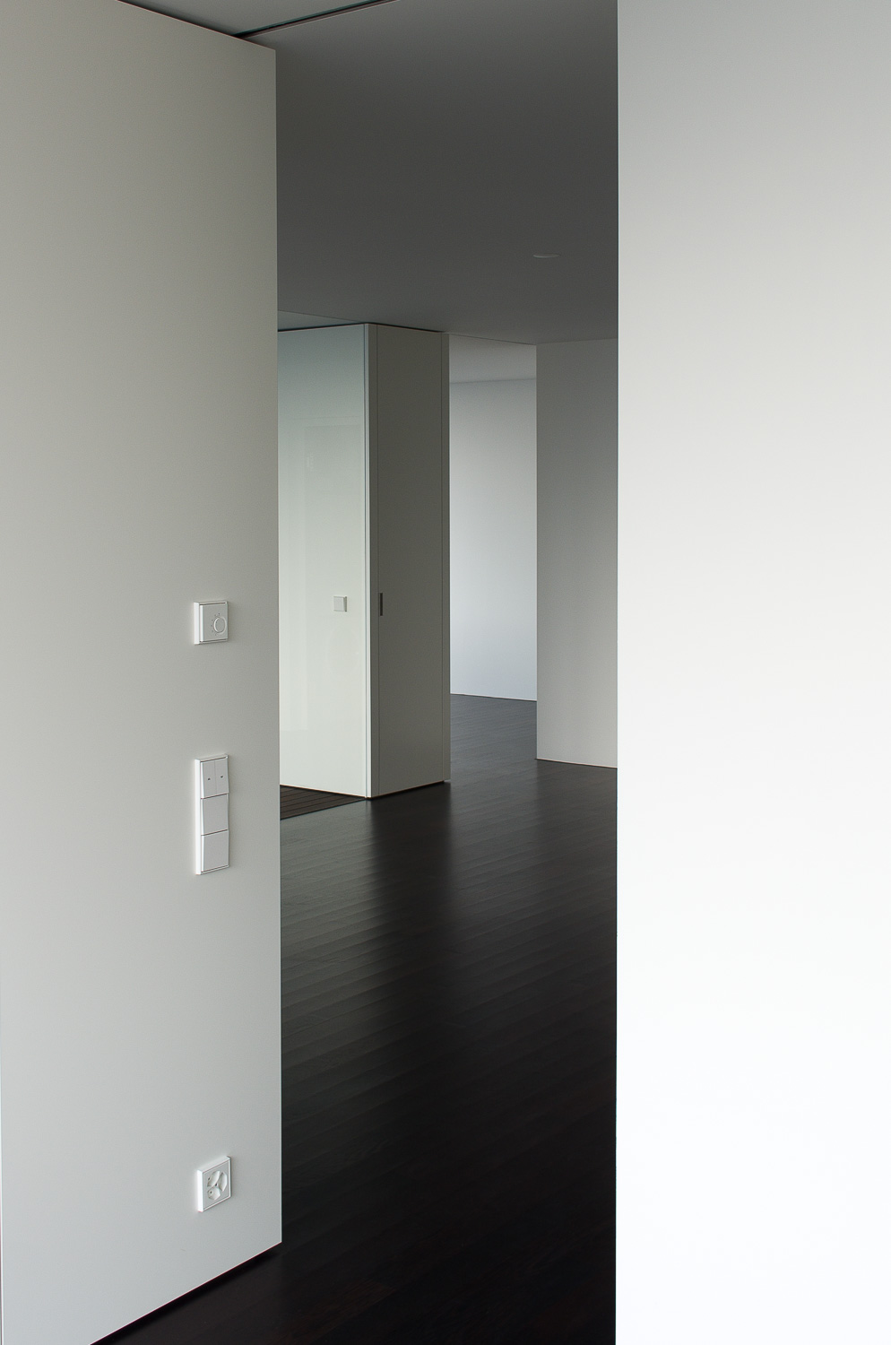 The 18-storey high-rise rises 60 metres from a square floor plan, resulting in a clear, uniform building volume on all sides. The upper end of the building is emphasised by an attic which conceals the roof structures. The entrance floor, which is slightly raised from street level by a base, is designed to be extra-high. The two entrances are built into the cube as loggias. On the street side, a centrally arranged, integrated, wide open staircase leads to the entrance area, with a bar and a shop accessible to the side. On the floor façades above, continuous bands of windows alternate with narrow parapet elements made of dark basalt stone. Dark fabric awnings are installed in front of the windows to provide shade. Together with the uniformly white curtains inside, the character of the facades varies depending on the weather and time of day.