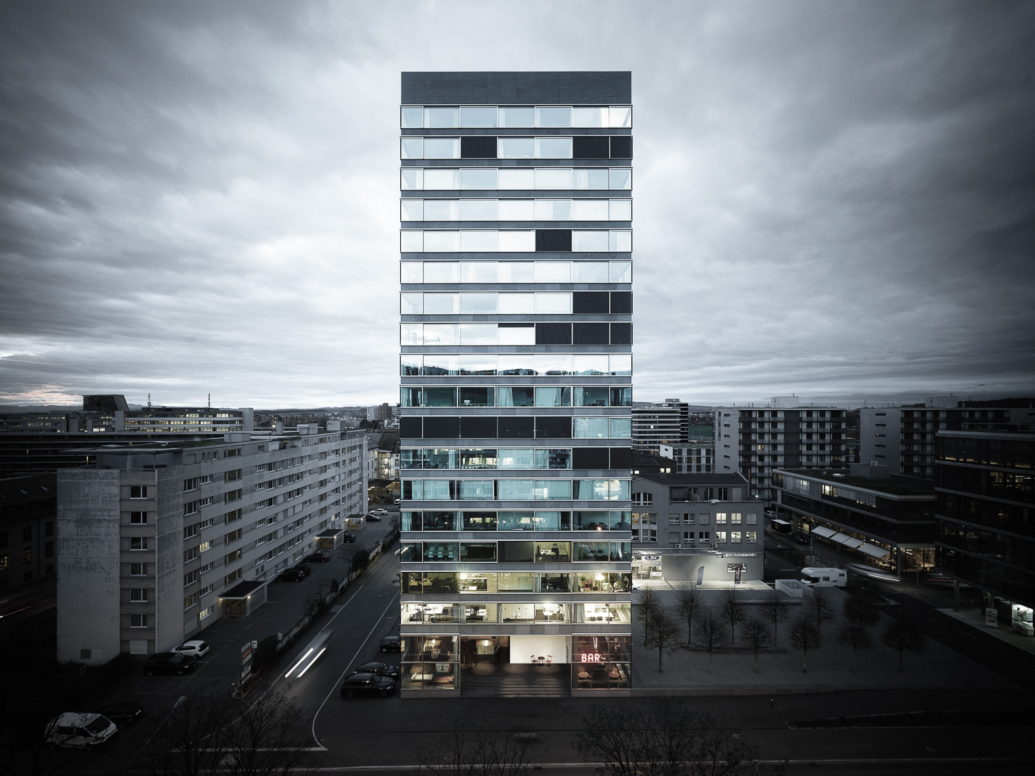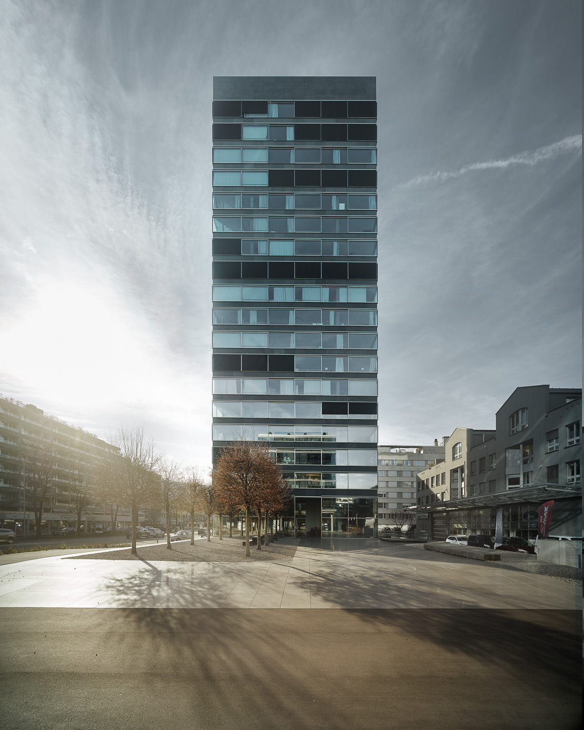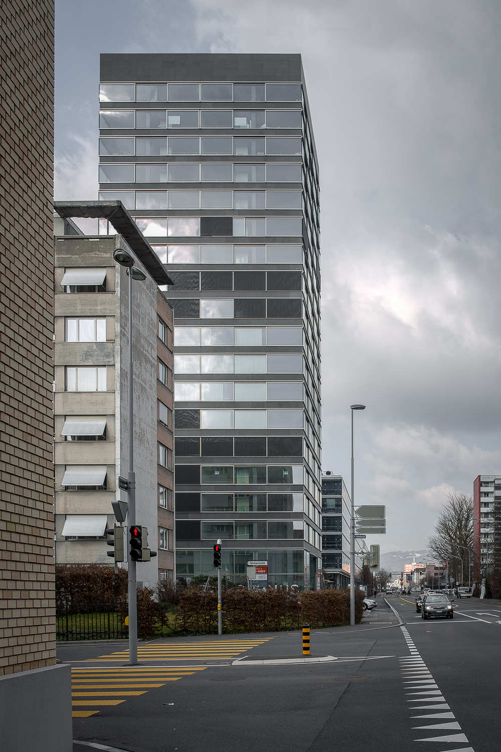 The building is located at Baarerstrasse 125, at the junction of the side street Untermüli. Baarerstrasse is the arterial road from Zug to the north, towards Baar. Zug is developing very dynamically here and is becoming increasingly urban. In the immediate vicinity of the high-rise there are converted factory buildings with brick facades, large apartment blocks, office buildings and some commercial buildings. There are also visual connections to two other high-rise buildings on Baarerstrasse. The main entrance to the B125 high-rise is in the east on Baarerstrasse. To the side of the street, to the north of the building, there is a slightly raised gravel square planted with trees as a public outdoor space with a second entrance.