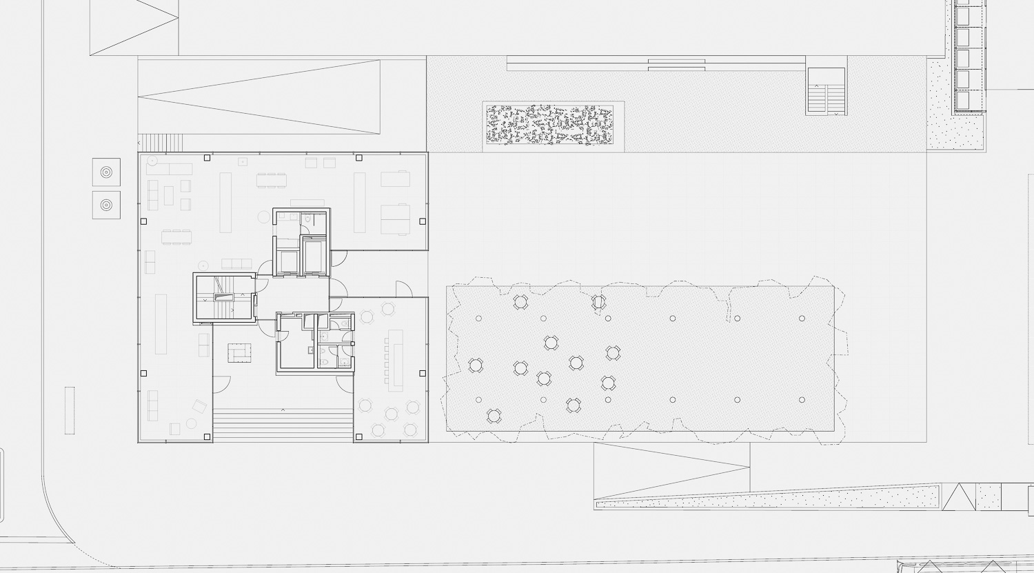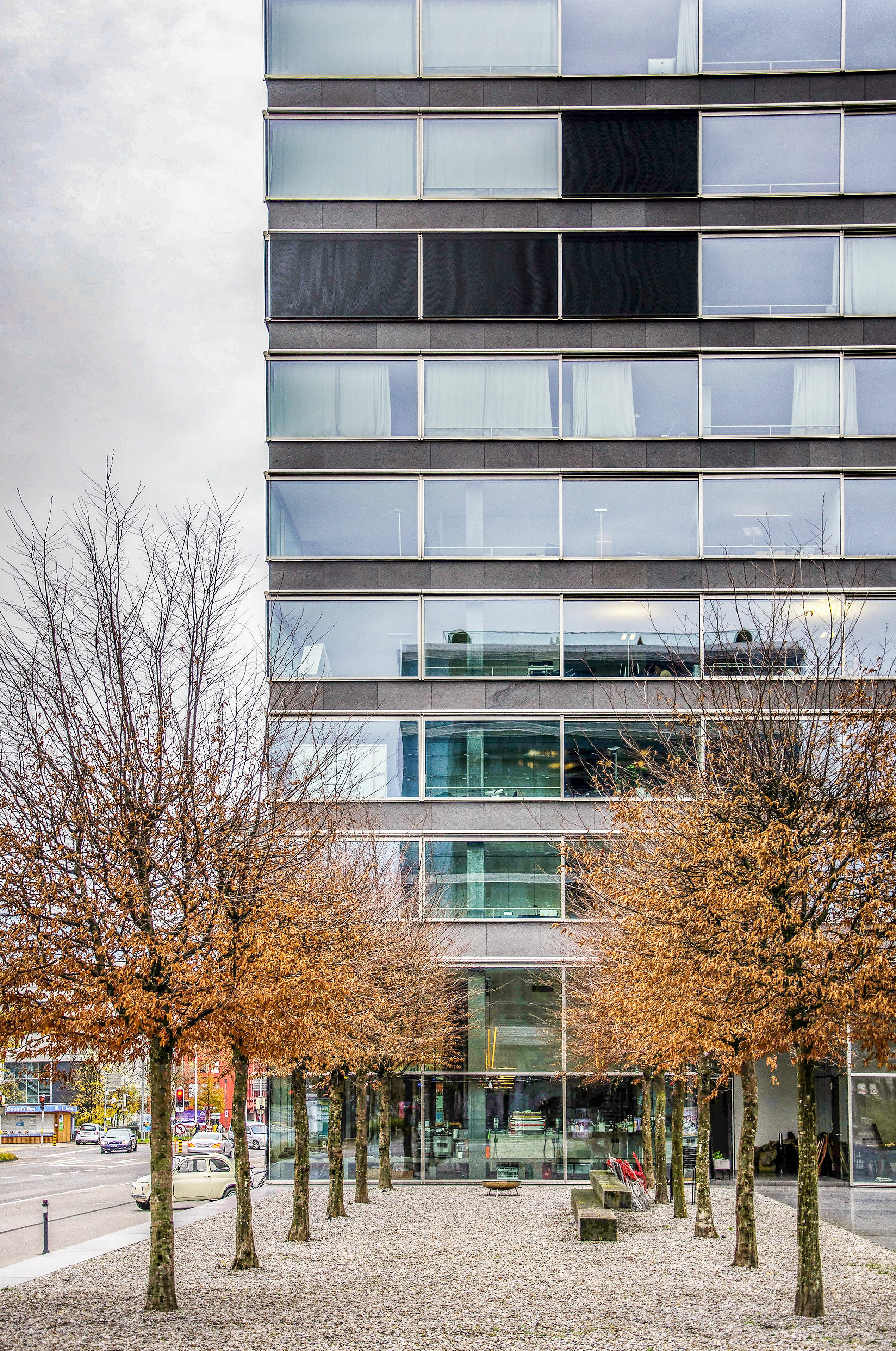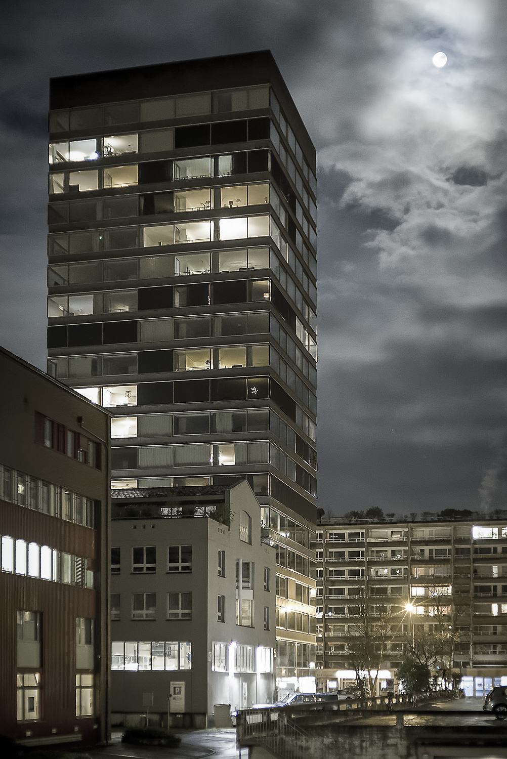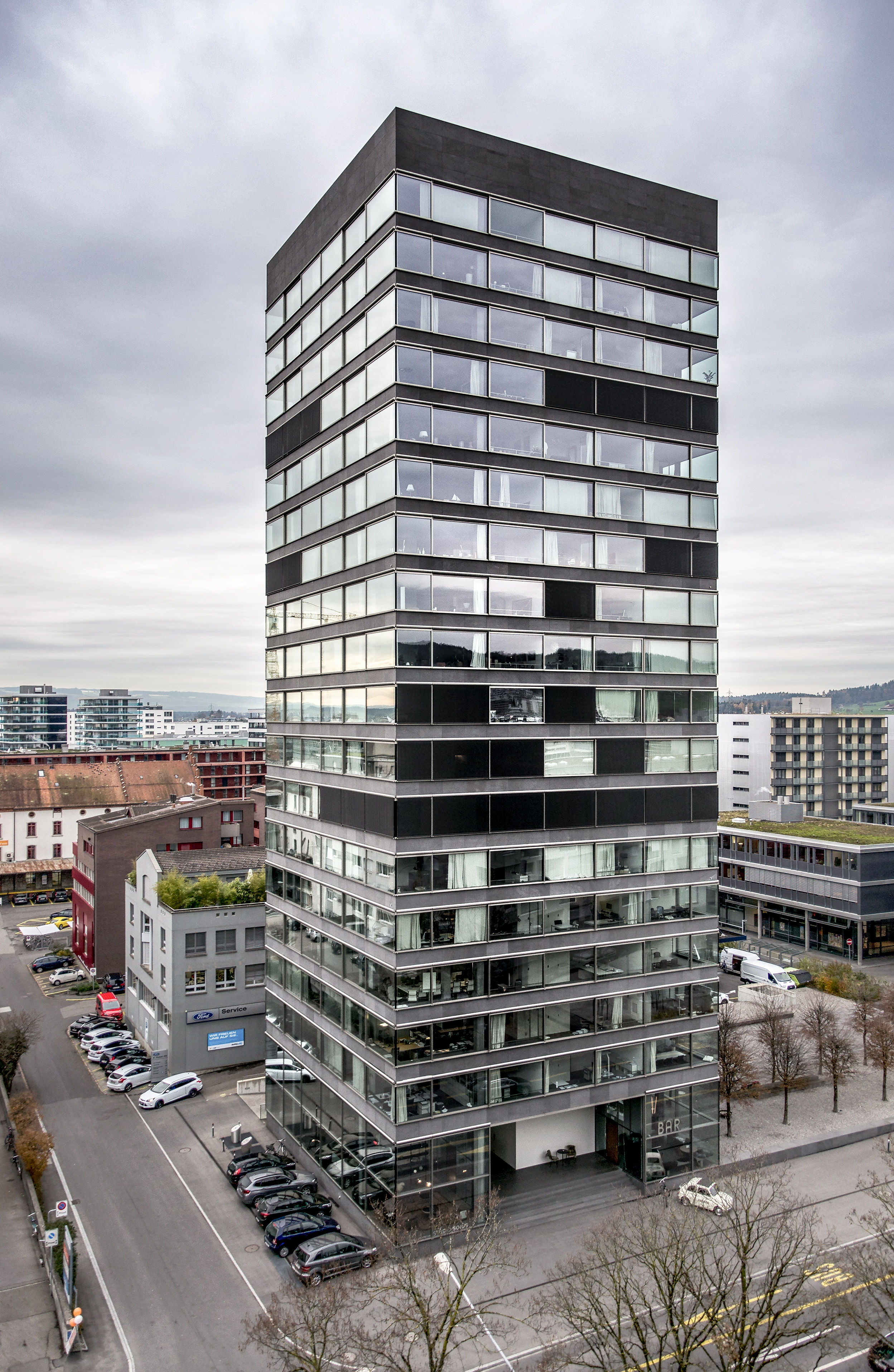 The building is located at Baarerstrasse 125, at the junction of the side street Untermüli. Baarerstrasse is the arterial road from Zug to the north, towards Baar. Zug is developing very dynamically here and is becoming increasingly urban. In the immediate vicinity of the high-rise there are converted factory buildings with brick facades, large apartment blocks, office buildings and some commercial buildings. There are also visual connections to two other high-rise buildings on Baarerstrasse. The main entrance to the B125 high-rise is in the east on Baarerstrasse. To the side of the street, to the north of the building, there is a slightly raised gravel square planted with trees as a public outdoor space with a second entrance.