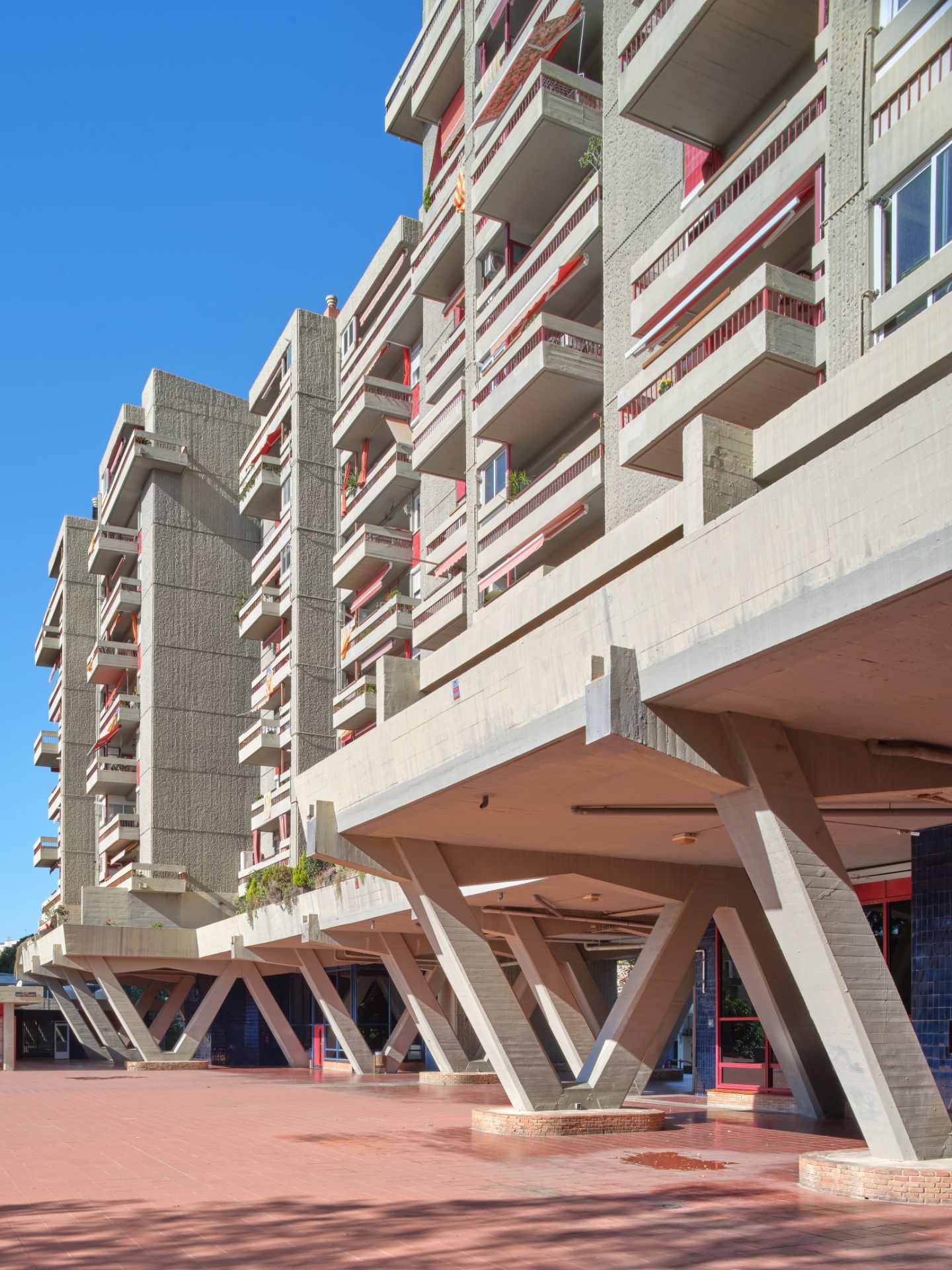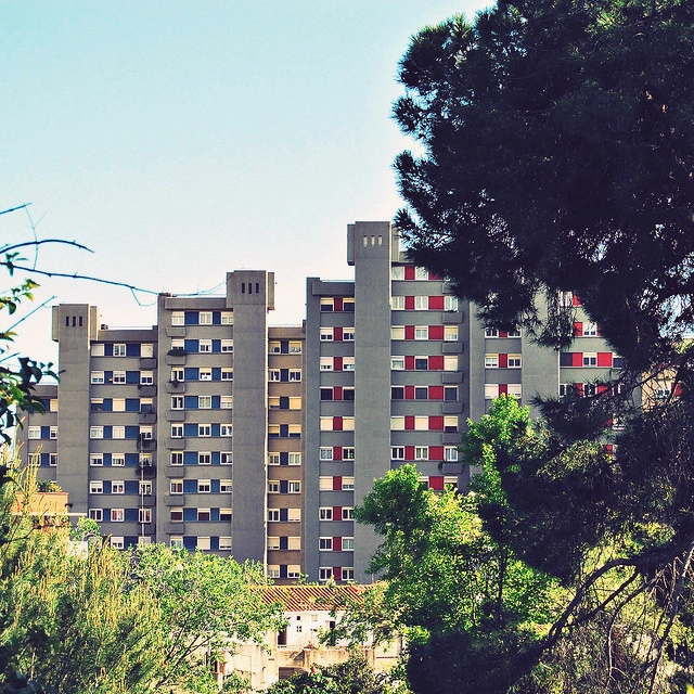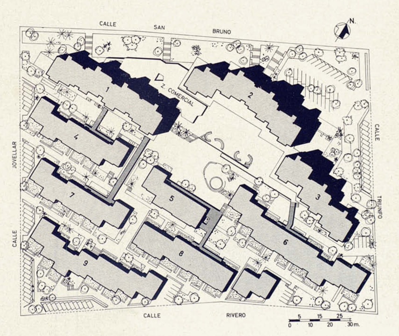 Así pues, dos zonas absolutamente diferenciadas. Entre ellas, se introdujero una serie de espacios de socialización, con el objetivo de facilitar los encuentros entre los vecinos, liberando también algunos espacios de planta baja, mediante porches que comunican calles o a través de espacios cerrados de uso comunitario.