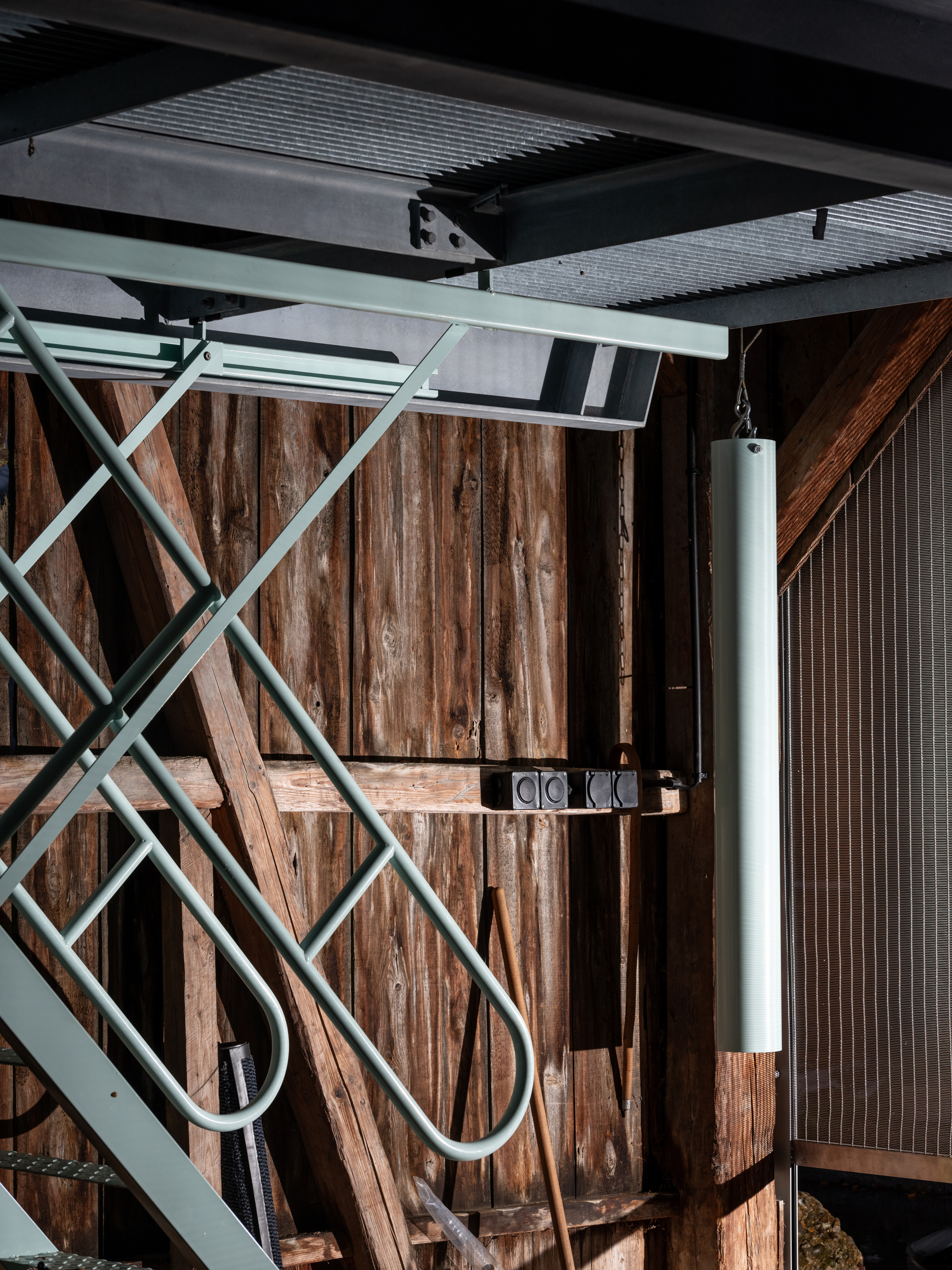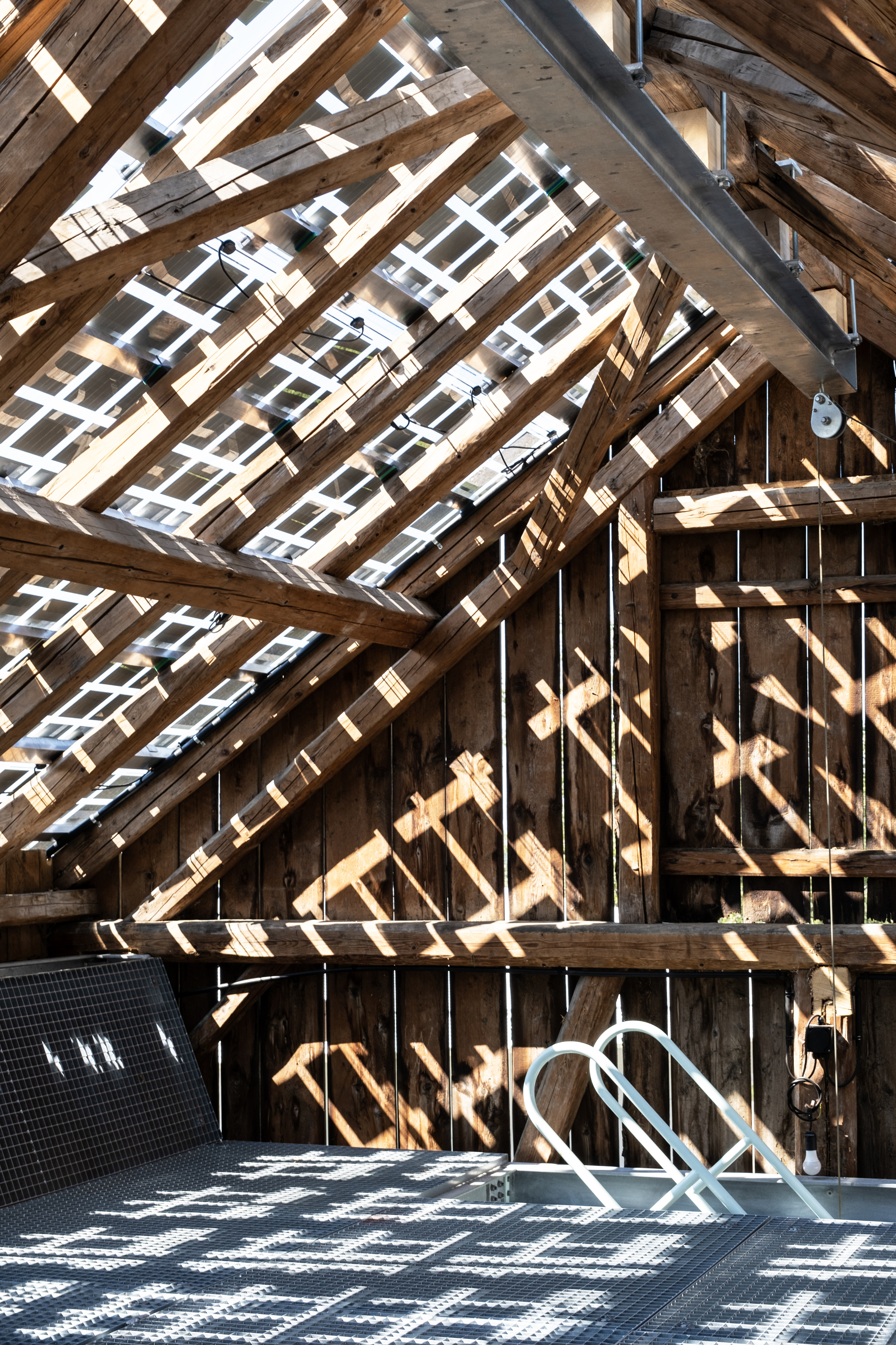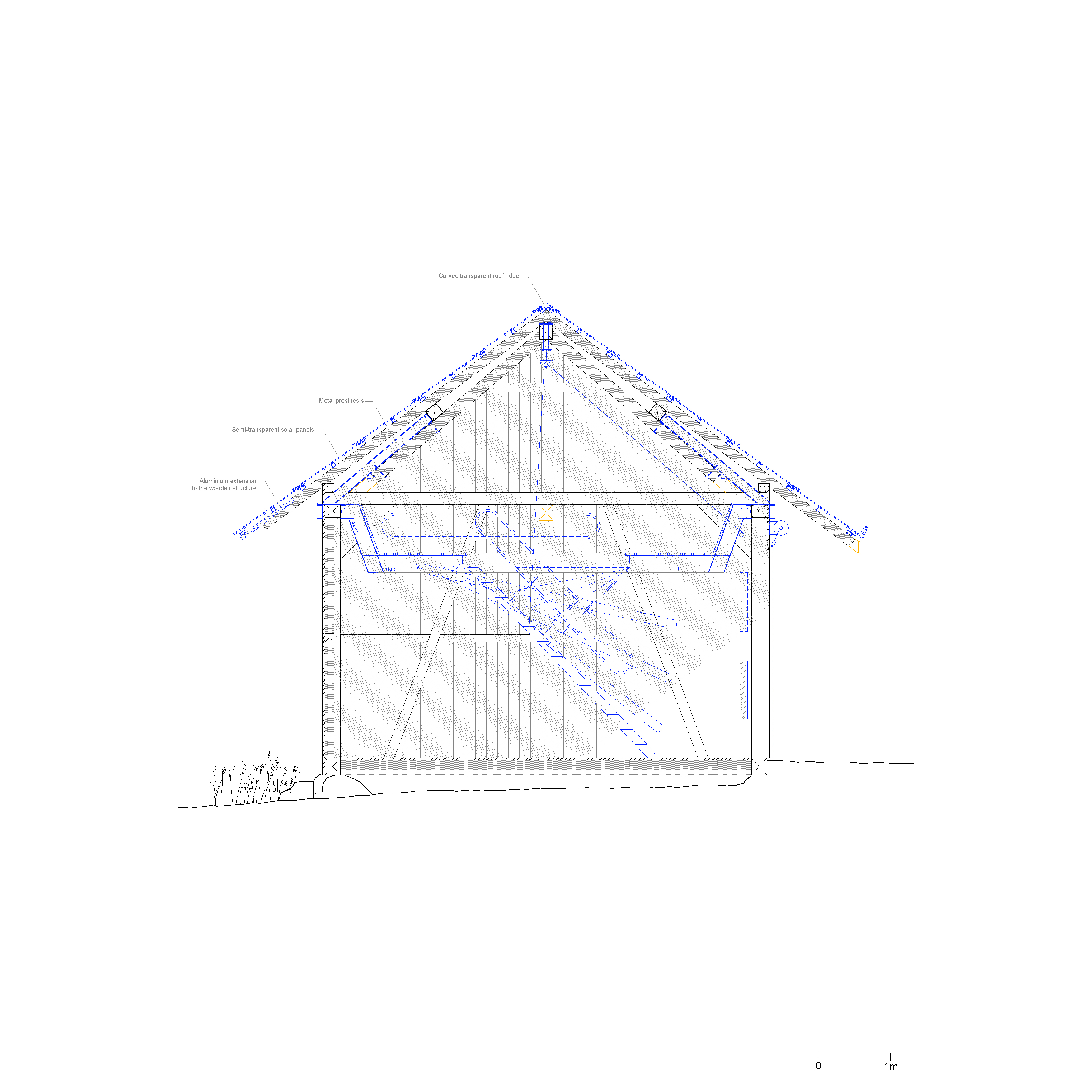 Originally intended to be dismantled, the neighboring wooden barn at the corner of the field was seen as an opportunity to extend the possibilities offered by the project. In this sense, all the interventions necessary to preserve the existing structure were twisted to increase the range of possibilities offered by the project. For instance, the new second-floor platform that strengthens the existing wooden structure, by being lowered, makes the upper level accessible, doubling the usable area.