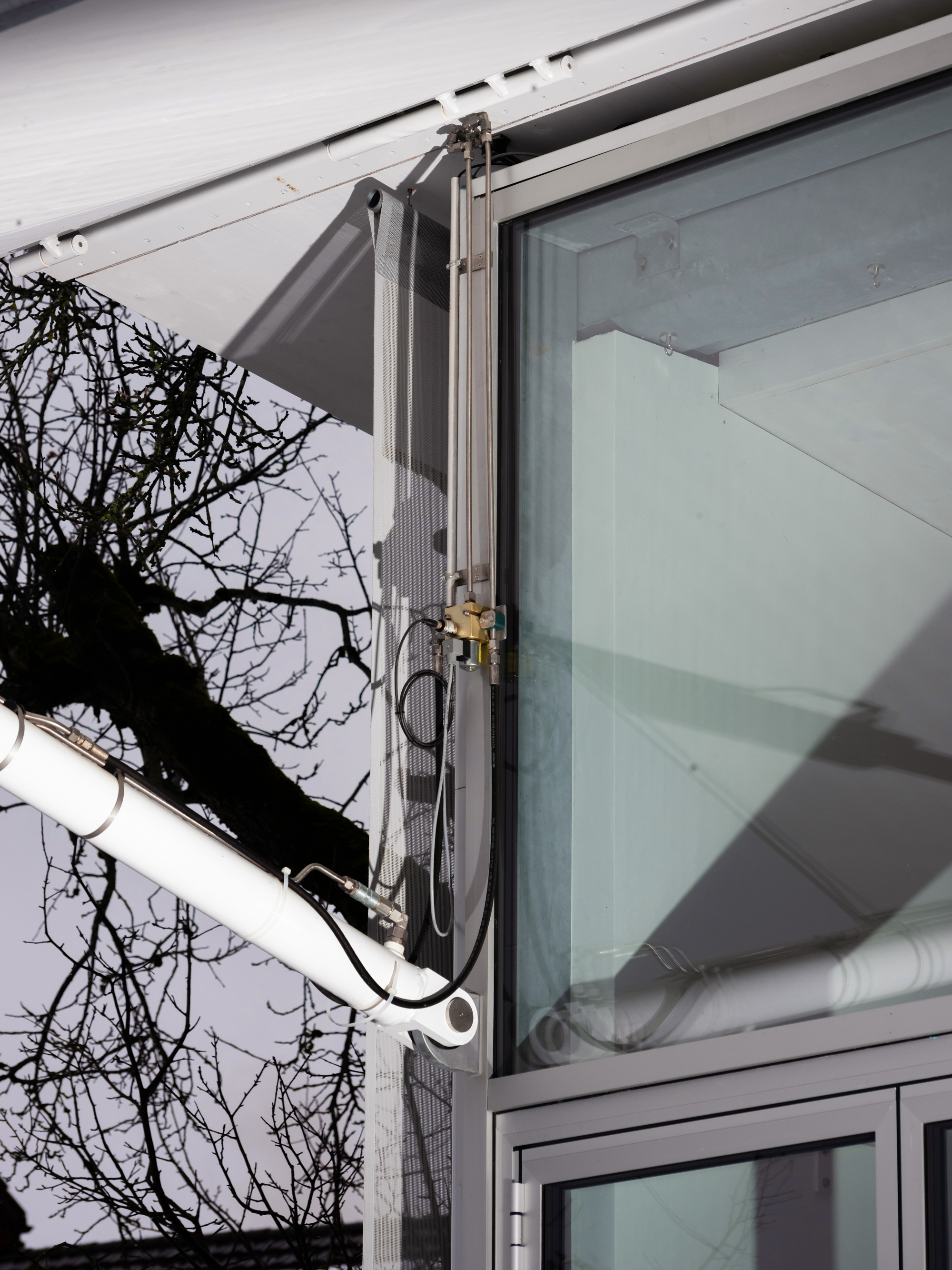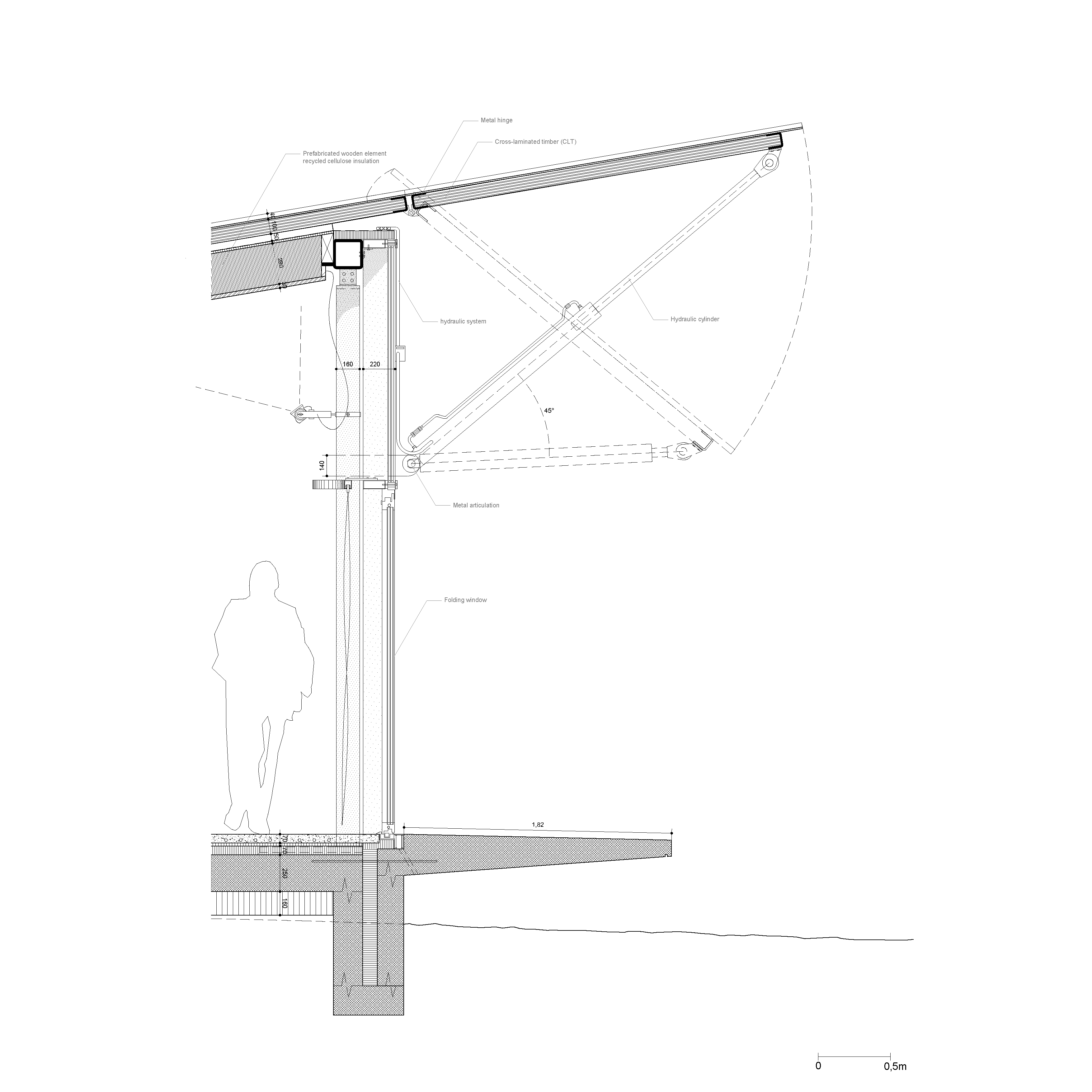 This versatility is achieved by a vast room overlooking the orchard to the south, which is freed from any constraining elements by a series of rooms with very specific functions on the other side: entrance hall, bedroom, bathroom, storage, and kitchen. A long pivoting roof, operated by hydraulic arms, allows the space to be fully adjusted. This device enables the house to react to the fluctuating and uncertain parameters of the environment, as well as to the different needs of the potential activities it hosts: from a very open space emphasizing the relationship with the surrounding landscape, capturing as much natural light as possible, to a much more protected space once the roof is tilted downwards.