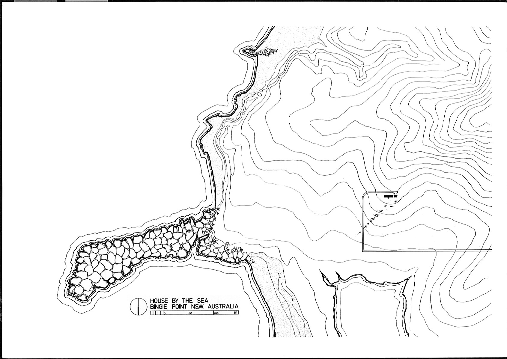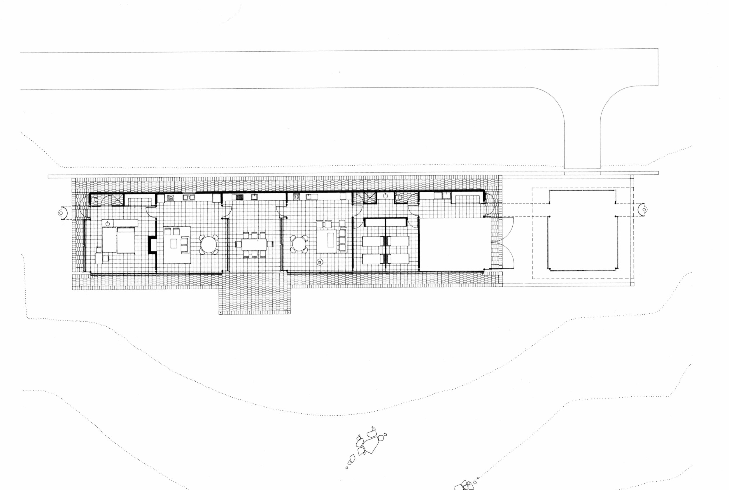 Situated on the southern coast of NSW, the site is a spectacular landscape between the ocean and western mountains with a nearby lake to the north. It is exposed, windswept and rugged. The clients had owned the land for many years using it for camping holidays and were interested in a house with tent like qualities. The building is a single pavilion divided by a central court and can operate as two self contained suites, one for the parents, the other for guests or family. Living areas open onto the shared court and a connection is implied between these adjacent spaces. The separate proposed garage bay in the plan illustrated was never realised.