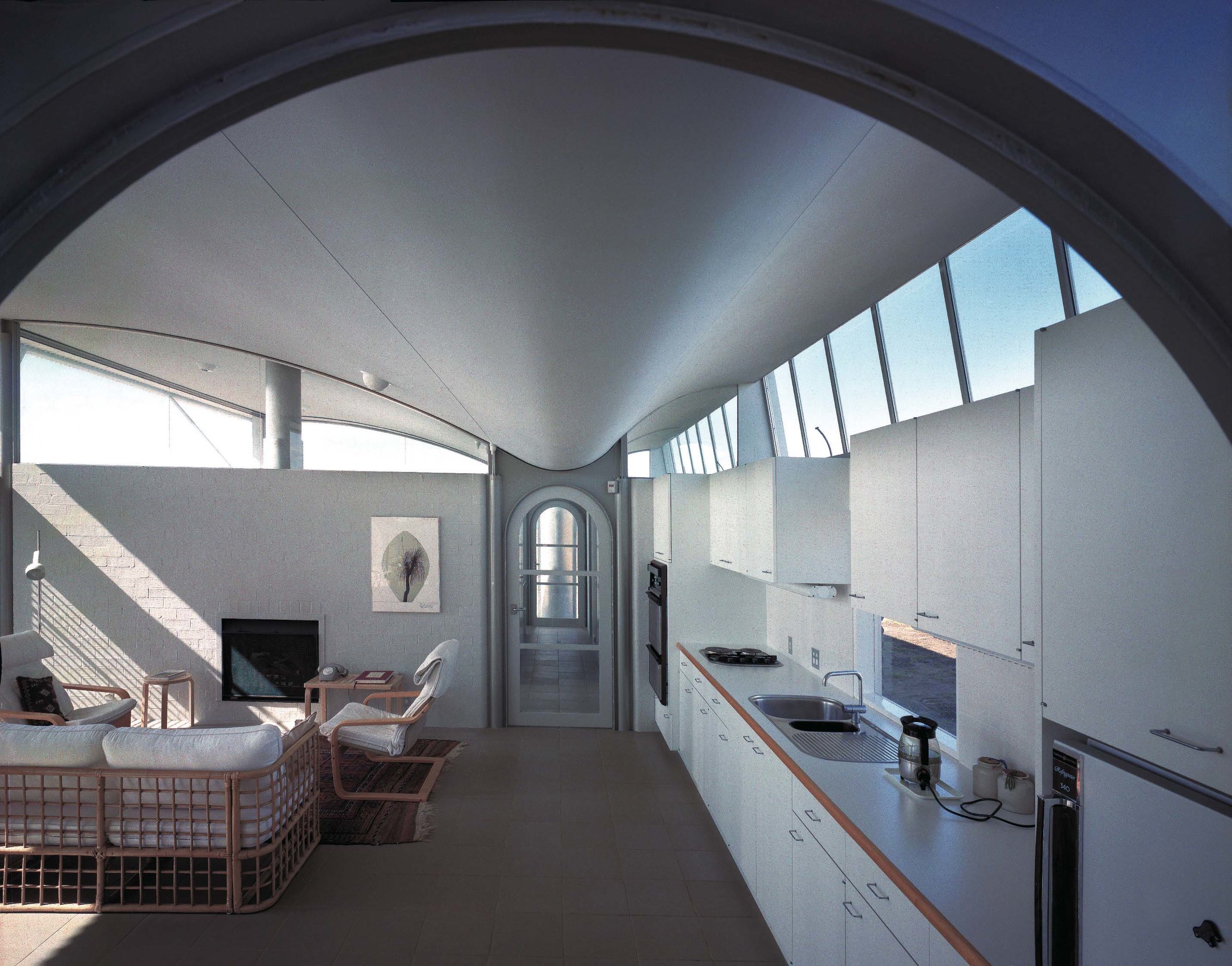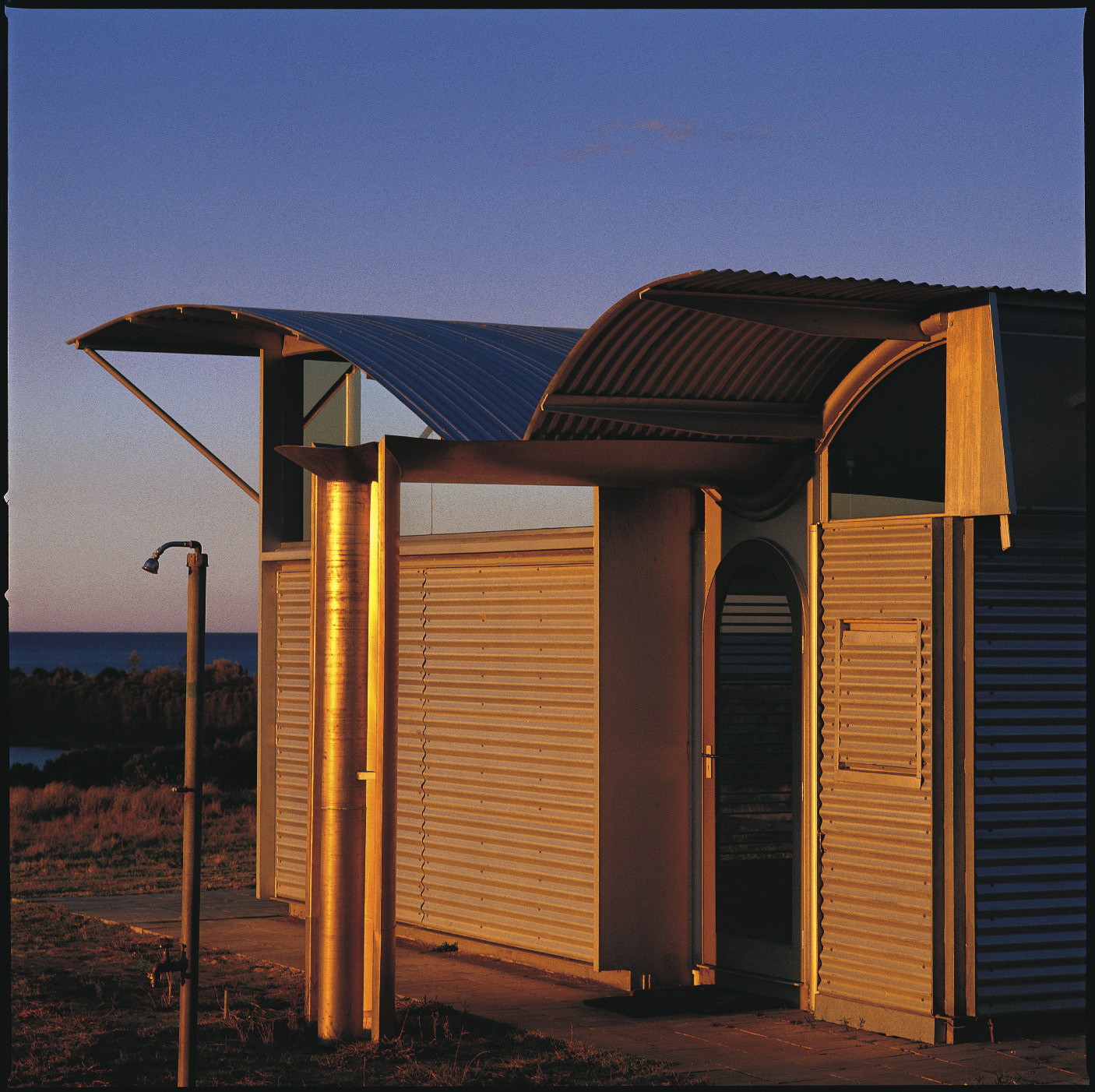 The striking roof form also registers the architect,s development of a pavilion type with a distinct front and back and this dominant spatial orientation is primarily developed in relation to climatic considerations. The open northern face is treated as a glazed sliding screen with individually adjustable and retractable external louvres. The large angled roof overhang shades the building from summer sun and allows winter sun access. In sharp contrast, the lower rear wall facing the predominant southerly winds is largely closed and is constructed of reverse brick veneer. Continuous upper fixed glazing along the southern façade admits light and sky views. These glass panels slope away from the wall to accommodate continuous adjustable horizontal vents at door head height.
