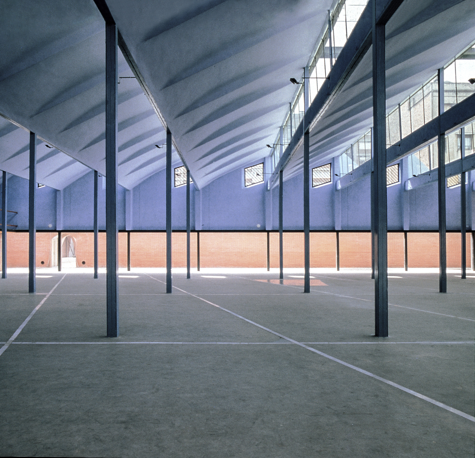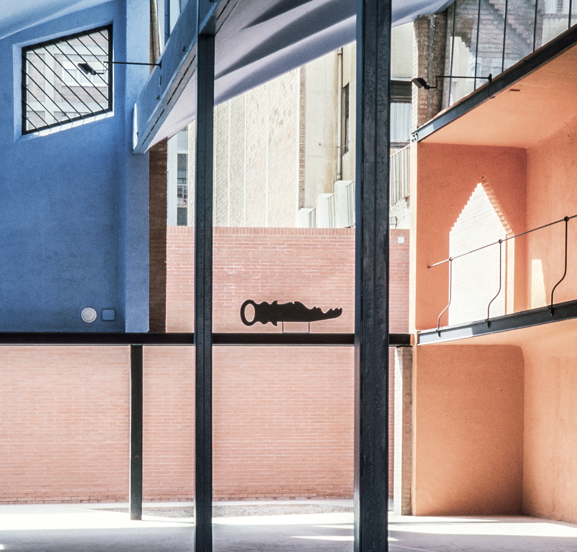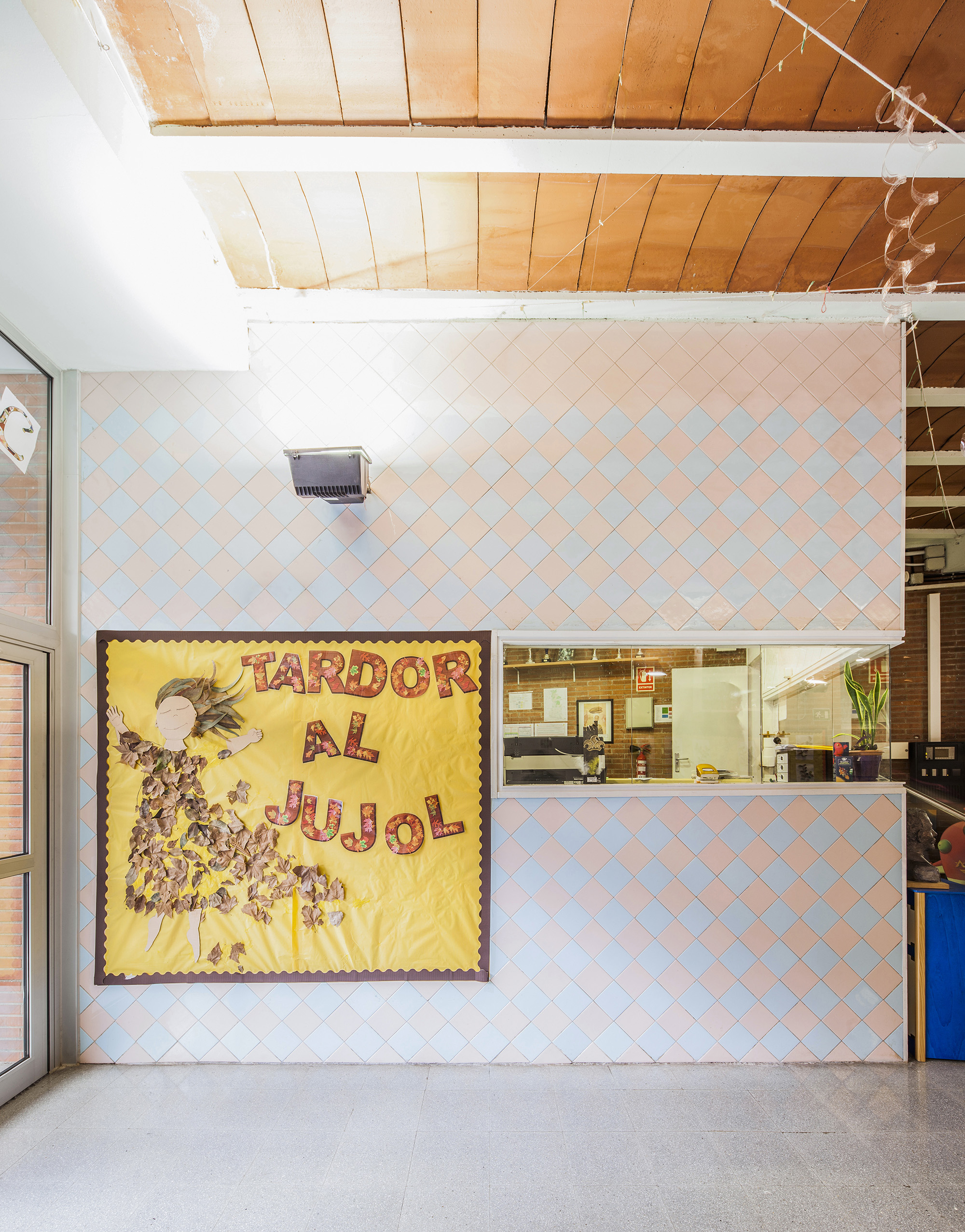 The new façades of Jujol’s factory, separated from the school by the cutting-off of two bays, are shored to make them permeable. It is also painted in the architect’s favourite colours, much like an objet trouvé in the middle of the patio.