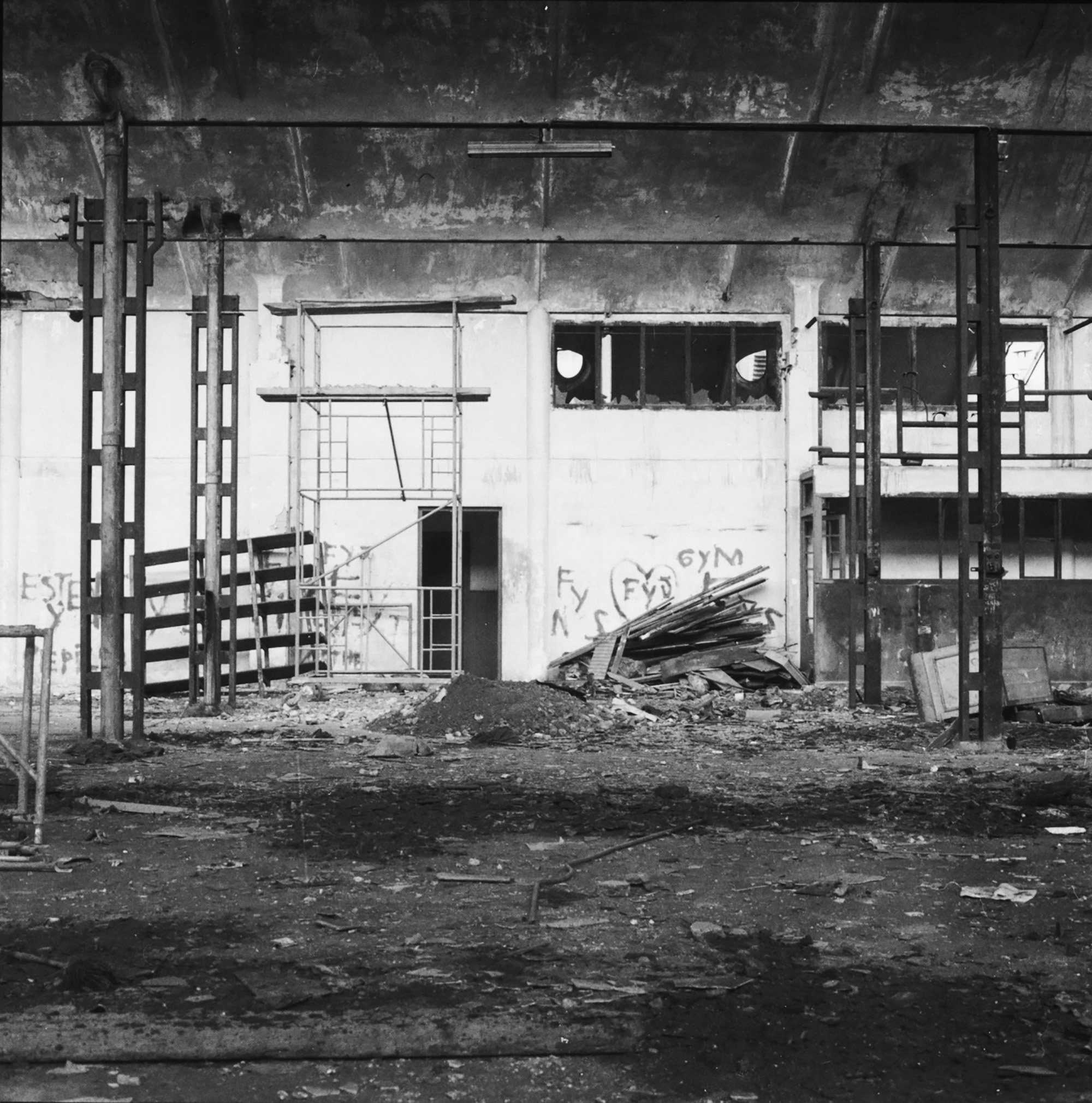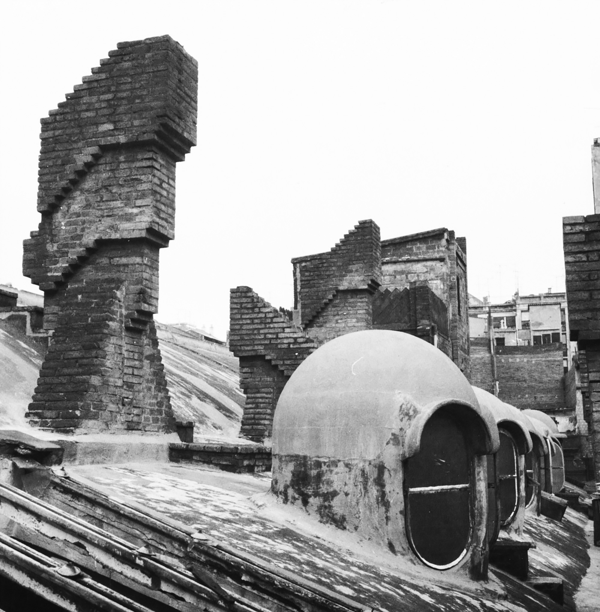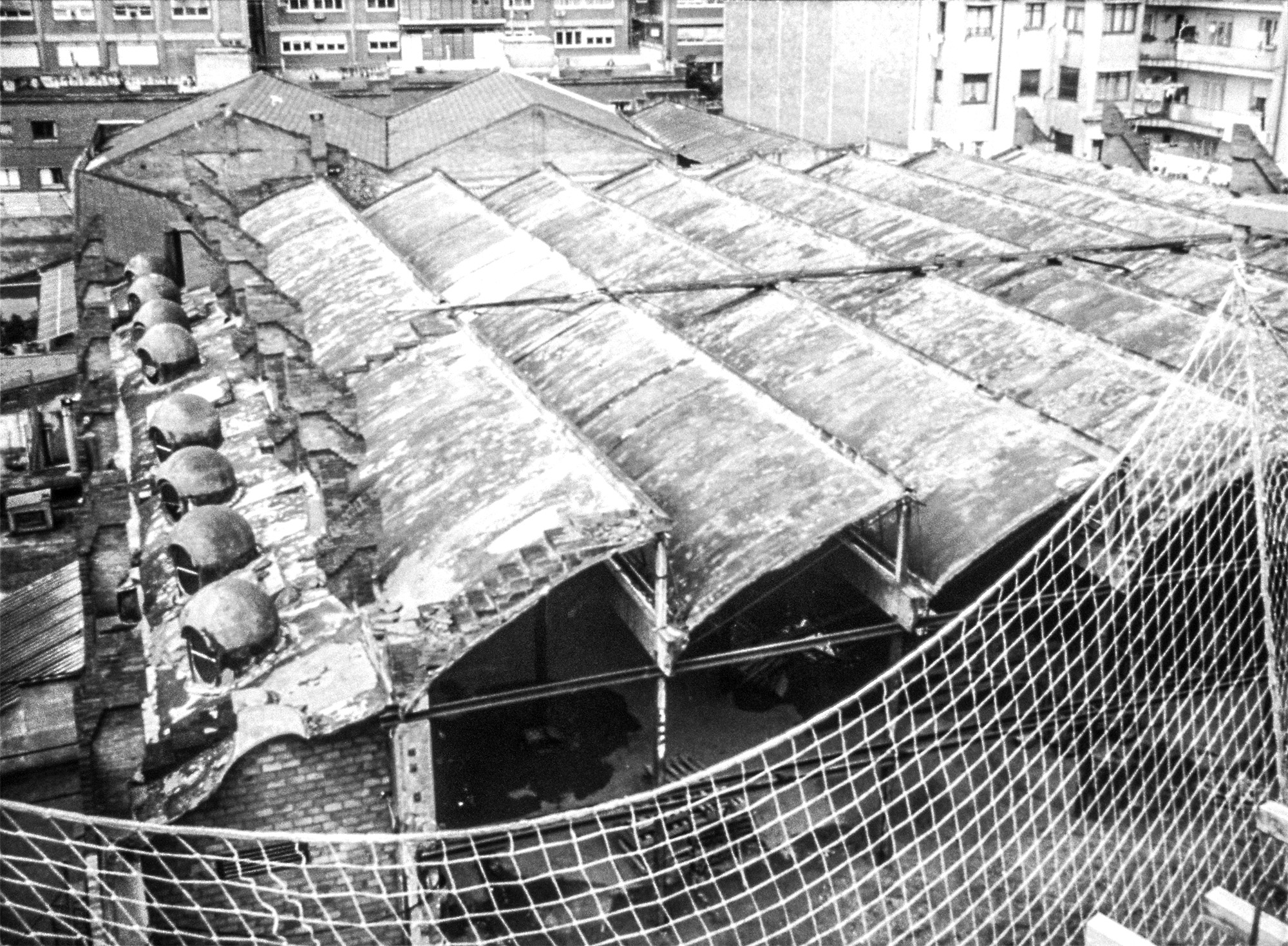The new façades of Jujol’s factory, separated from the school by the cutting-off of two bays, are shored to make them permeable. It is also painted in the architect’s favourite colours, much like an objet trouvé in the middle of the patio.