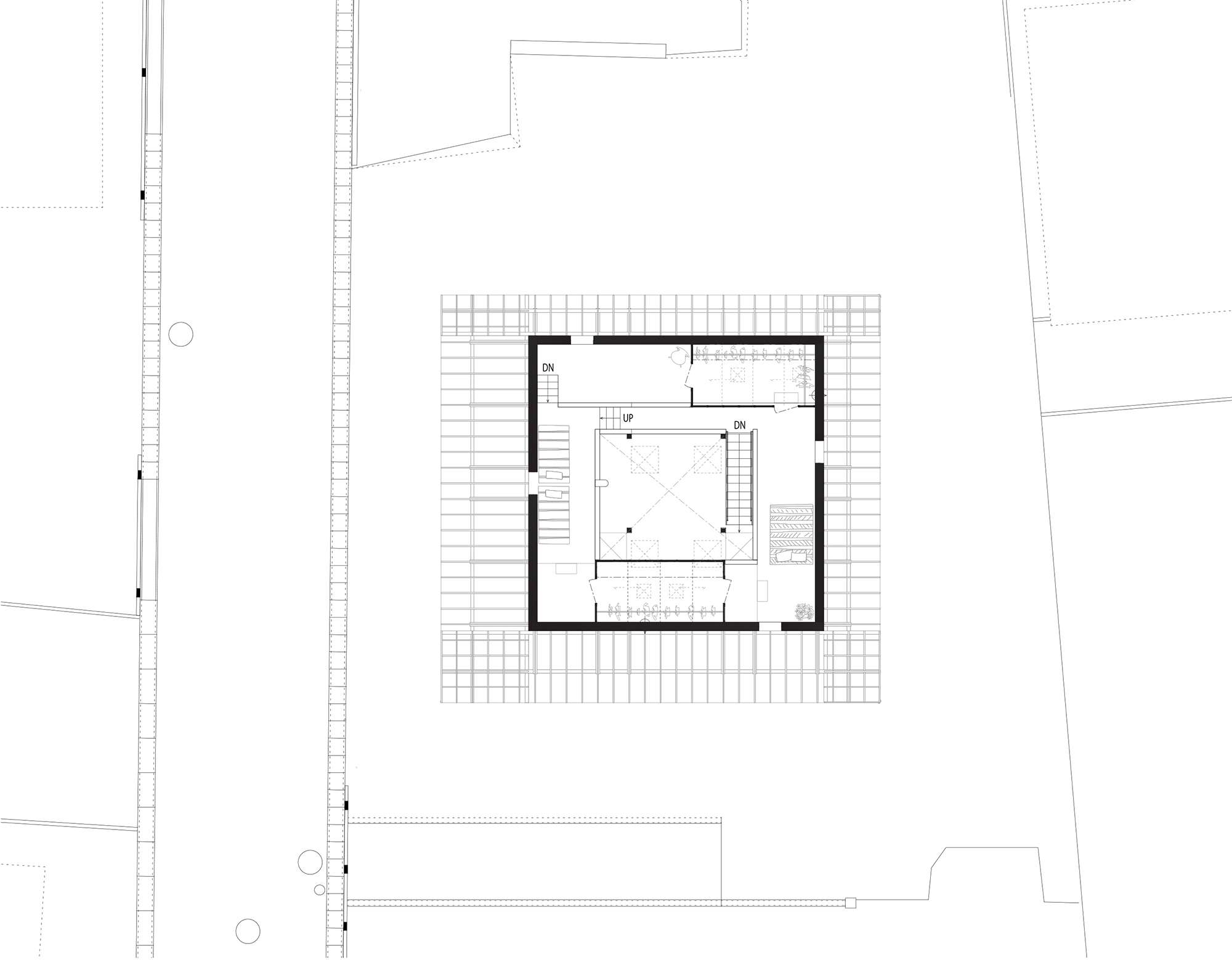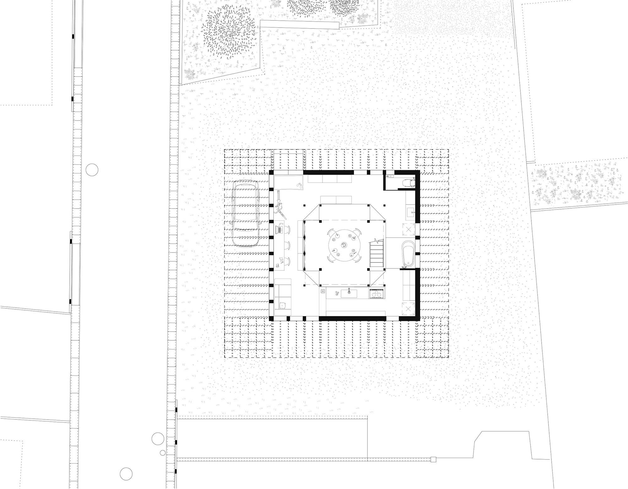 Now, I am considering the possibility of “a middle area not only to protect”. It is to aim not only the severity of winter but also the middle area where you can enjoy all the conditions by thinking about the way of “between” from both inside and outside. In this plan, we placed a building in the center of the site. This is one option when setting a small footprint architecture in a limited residential section of a rural district, with limited conditions including cost. Although some hierarchy occurs depending on the direction and the neighboring state, “vacant lands” are born equally to the four sides of the building. When designing from the inside towards the vacant land (outside), the feeling of the person in the vacant land seemed important. I attempted to create a “between” from both directions that would not only be a large eaves as a base from the inside but also as a stronghold of humans from the outside. There are “four areas” in “four rectangles”. The first rectangle in the center of the building is the space in the most stable state. The second one is a semi-underground rectangle surrounding it, which is a thought and continuity space from the airlock entrance.