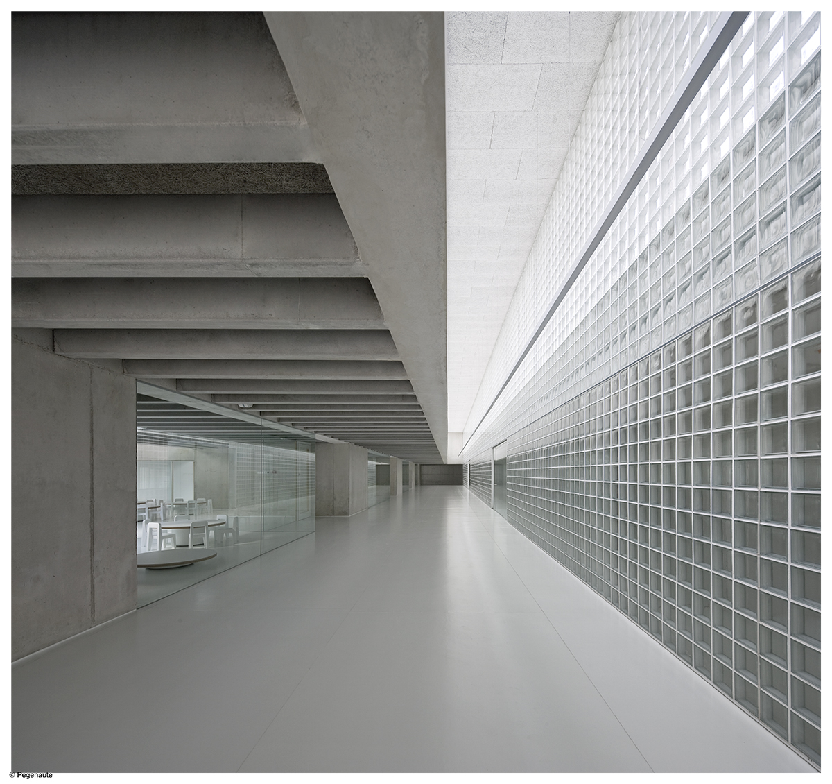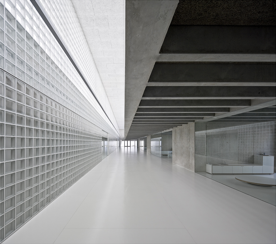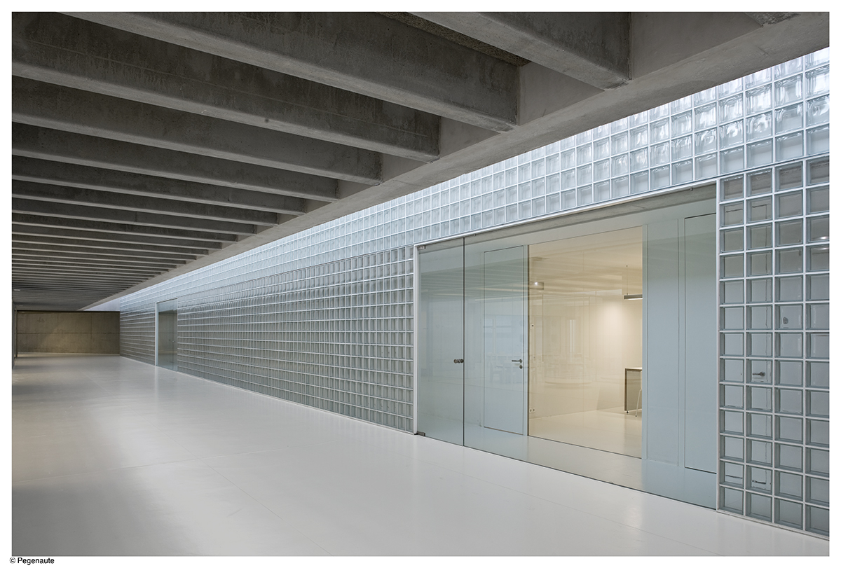 El edificio enfatiza su concepto de zócalo de los volúmenes ya construidos y se vuelca a su lado Sur, orientado a una plaza.