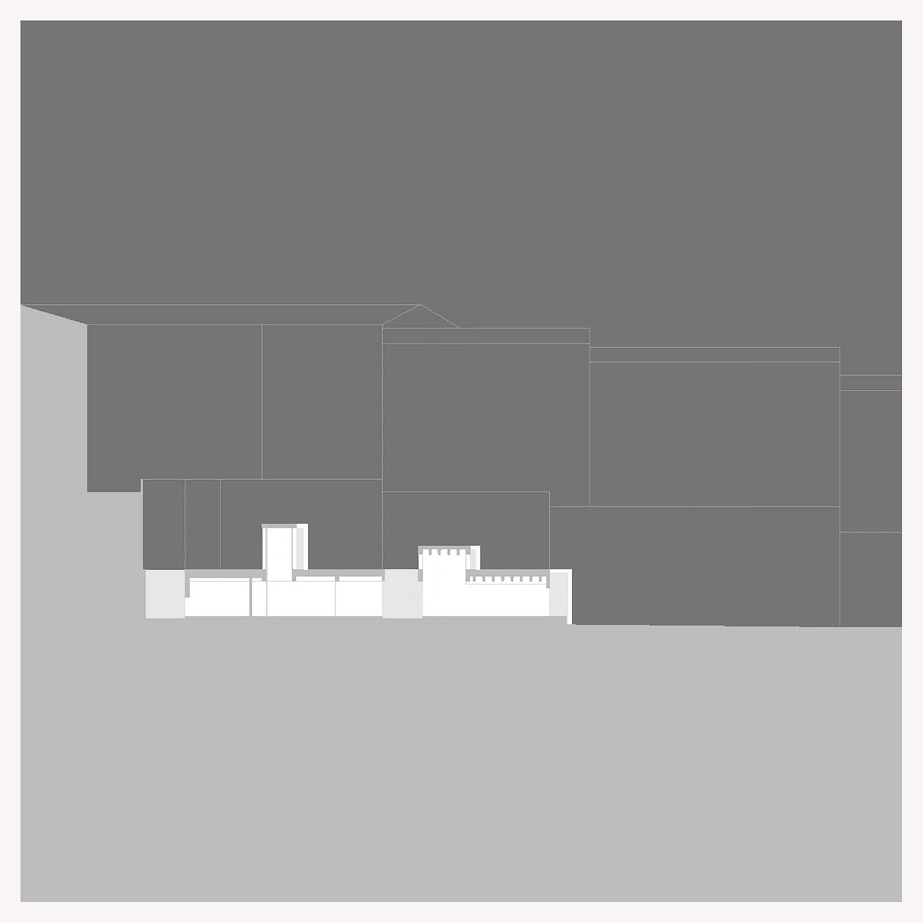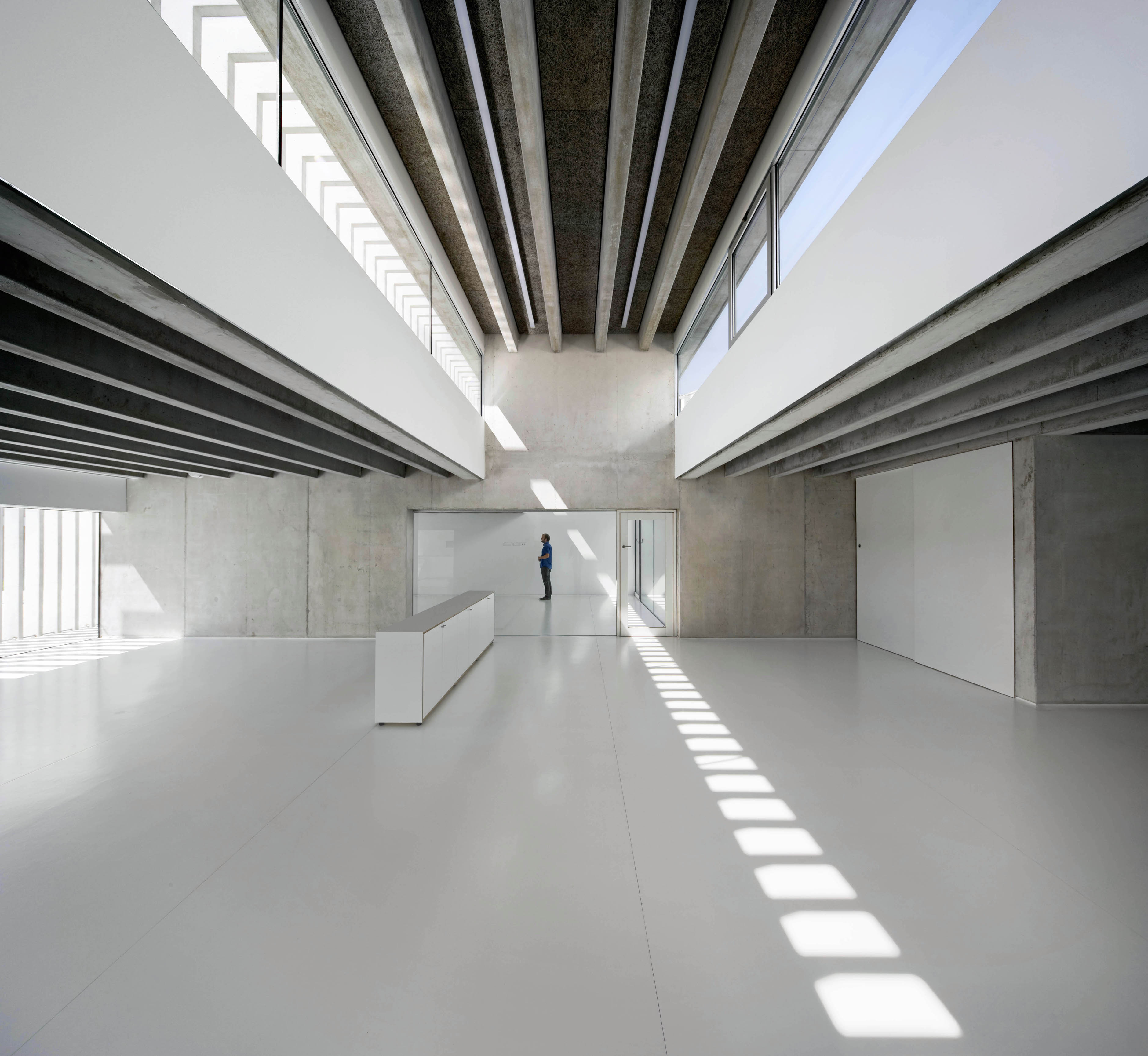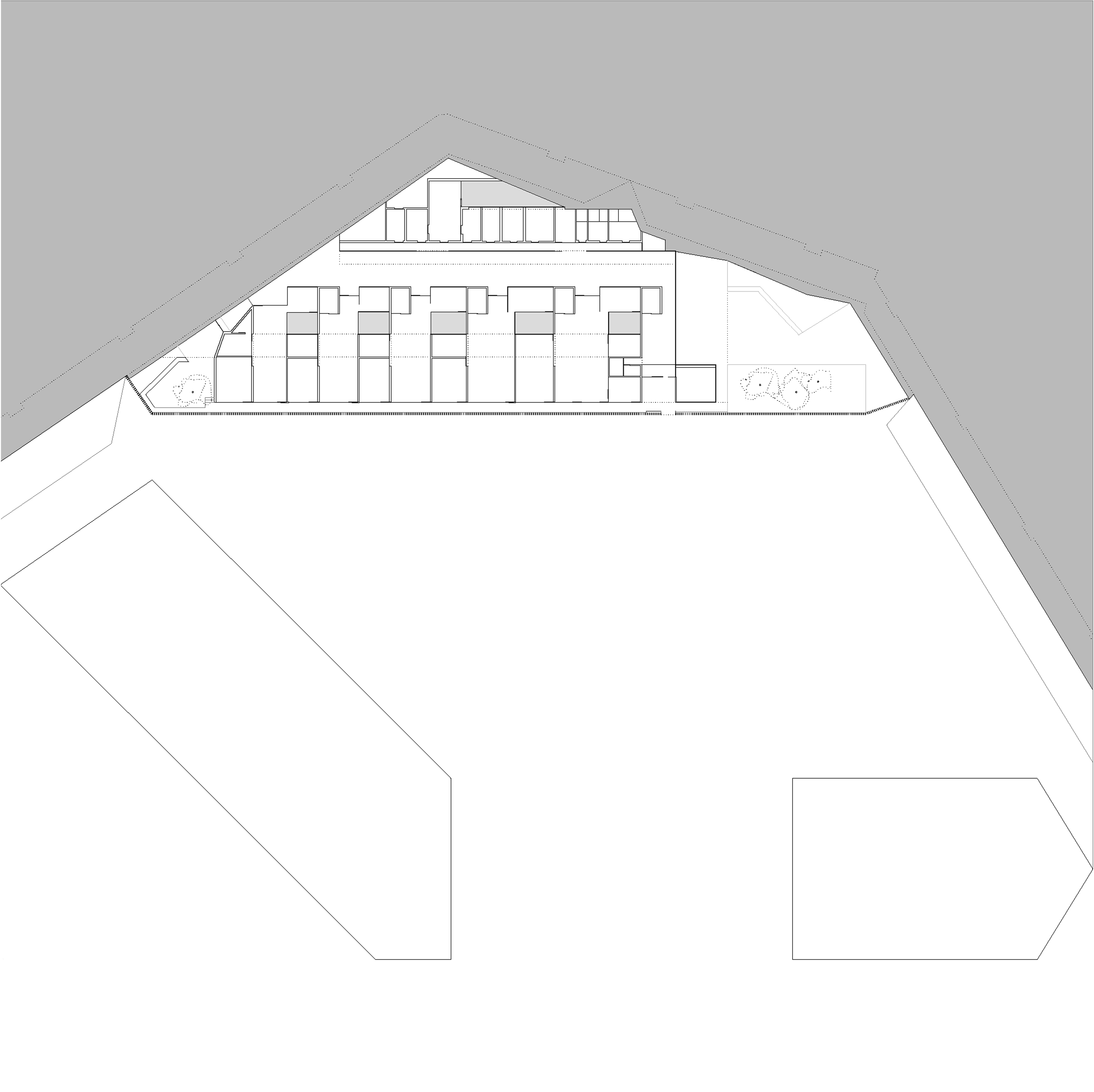 El edificio enfatiza su concepto de zócalo de los volúmenes ya construidos y se vuelca a su lado Sur, orientado a una plaza.