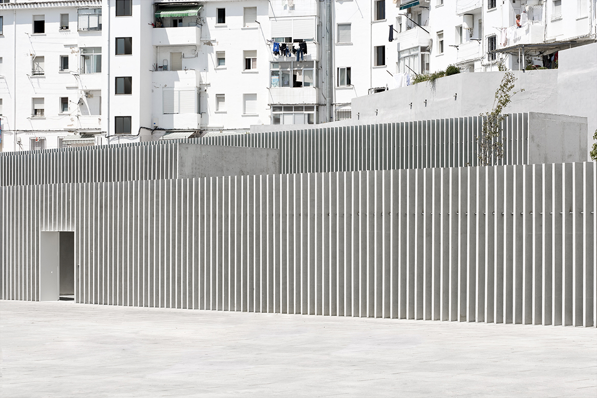 Finalmente y como acabado formal del proyecto, una celosía de hormigón prefabricado marca el límite con la plaza, dotando de mayor privacidad y control solar al edificio al mismo tiempo que matiza la relación entre el espacio público y el privado, rompiéndose solamente en el punto de entrada a la escuela.