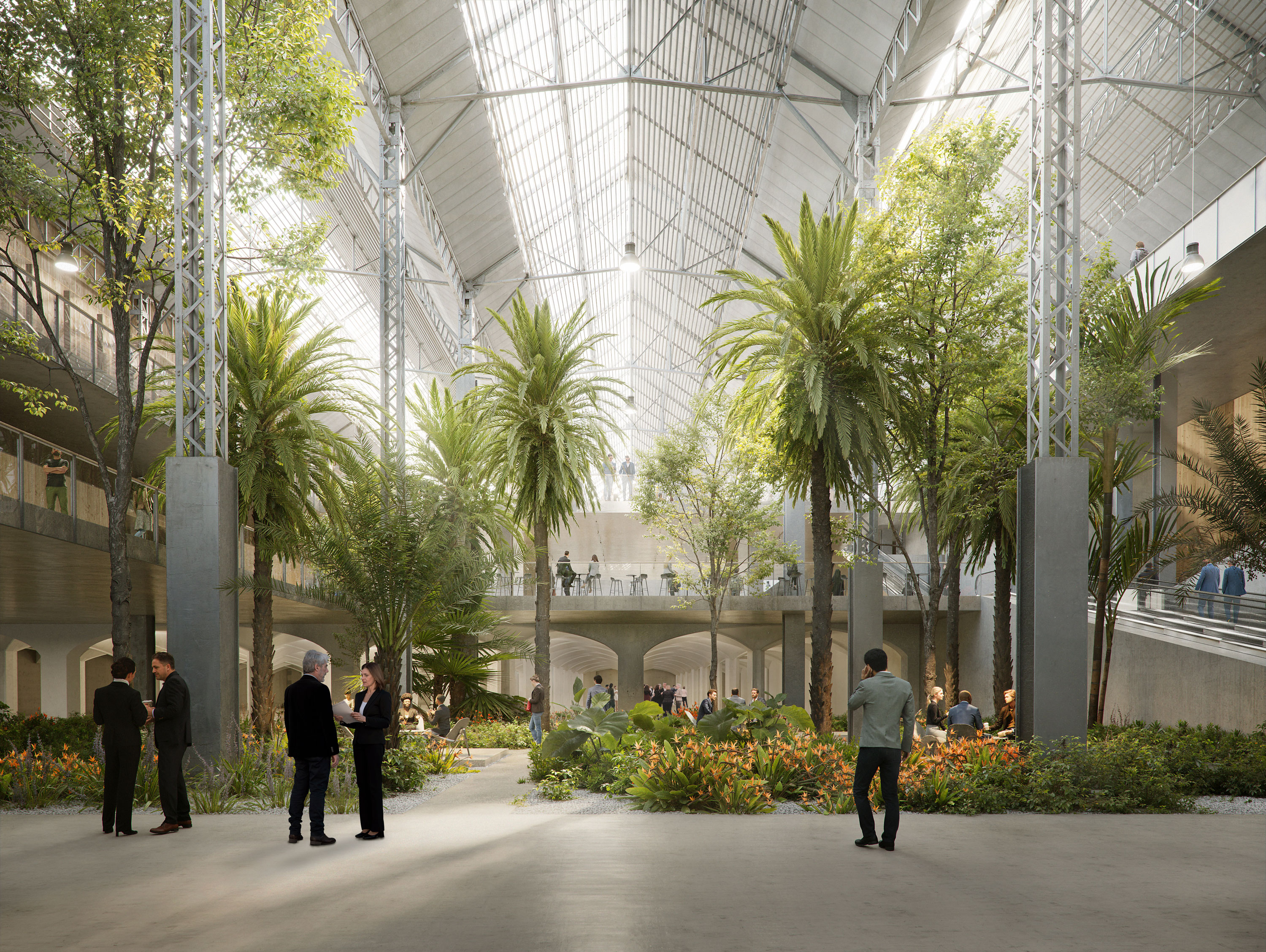 - Enhancing and maximizing natural lighting through the restored and expanded skylights, incorporating intelligent interior screens to prevent overexposure and allow automated lighting control. Below the existing structure, a network of slats improves light diffusion, provides solar protection, and enhances the umbracle effect.