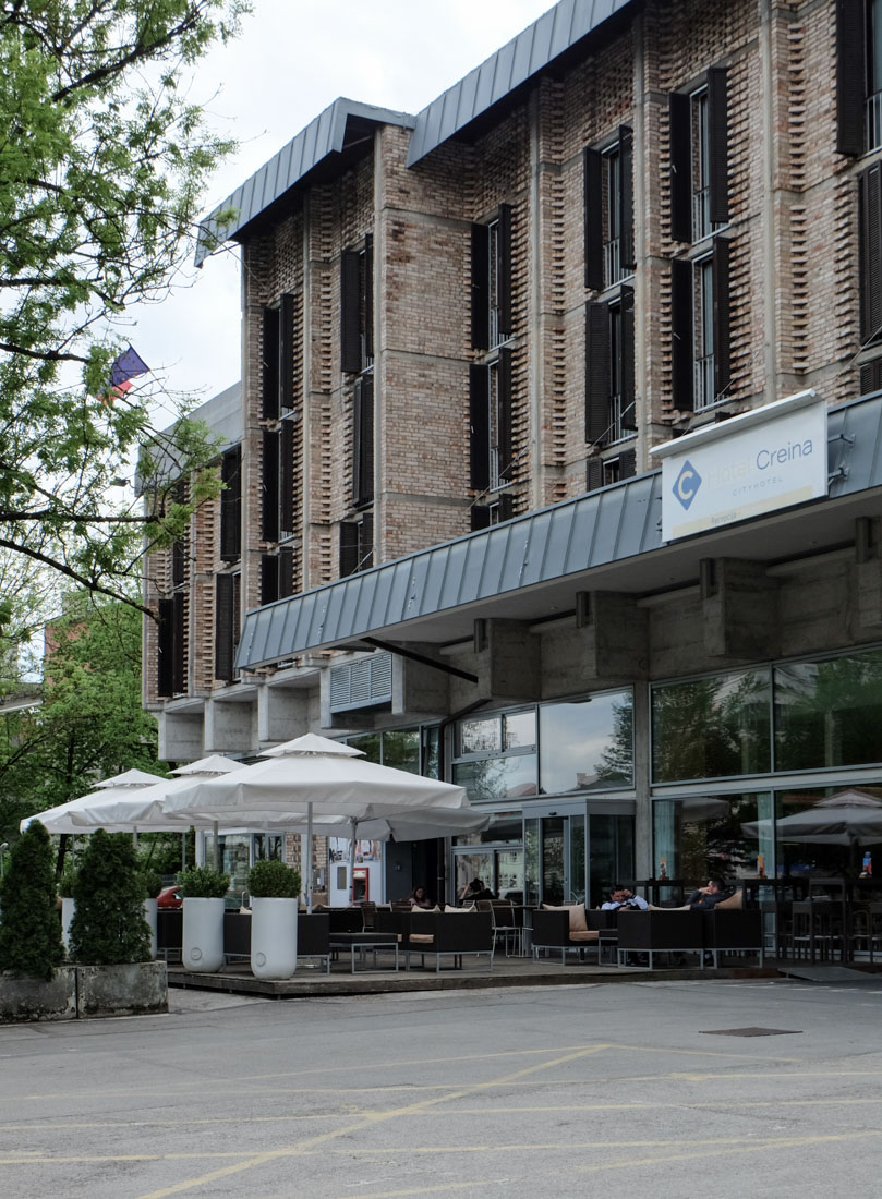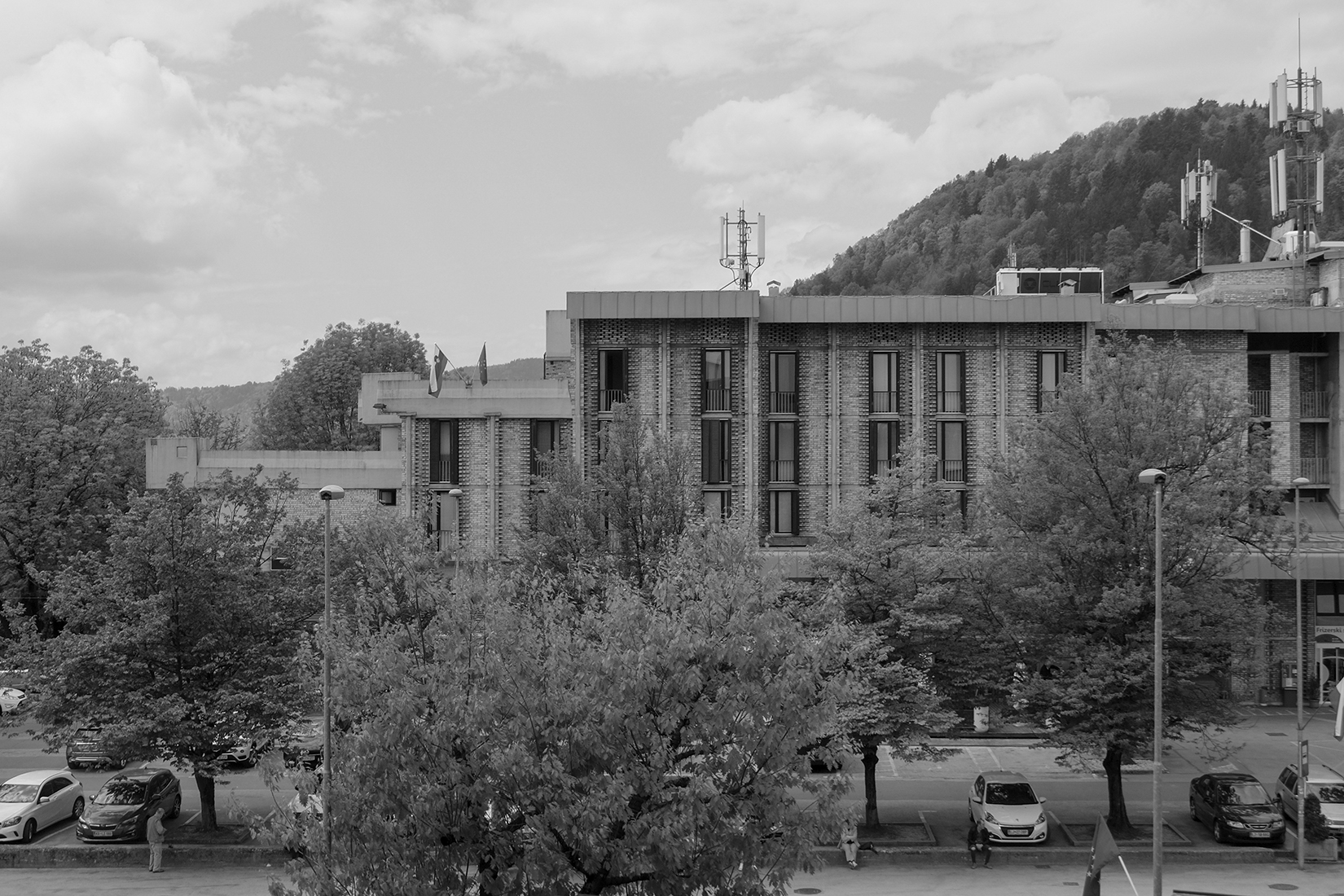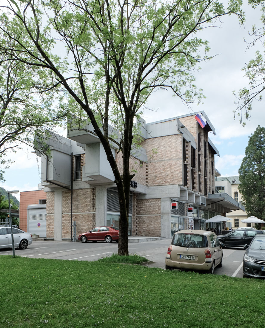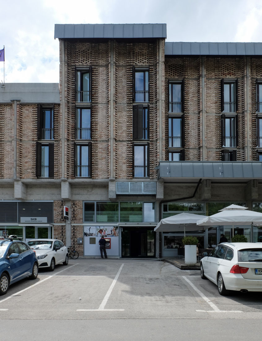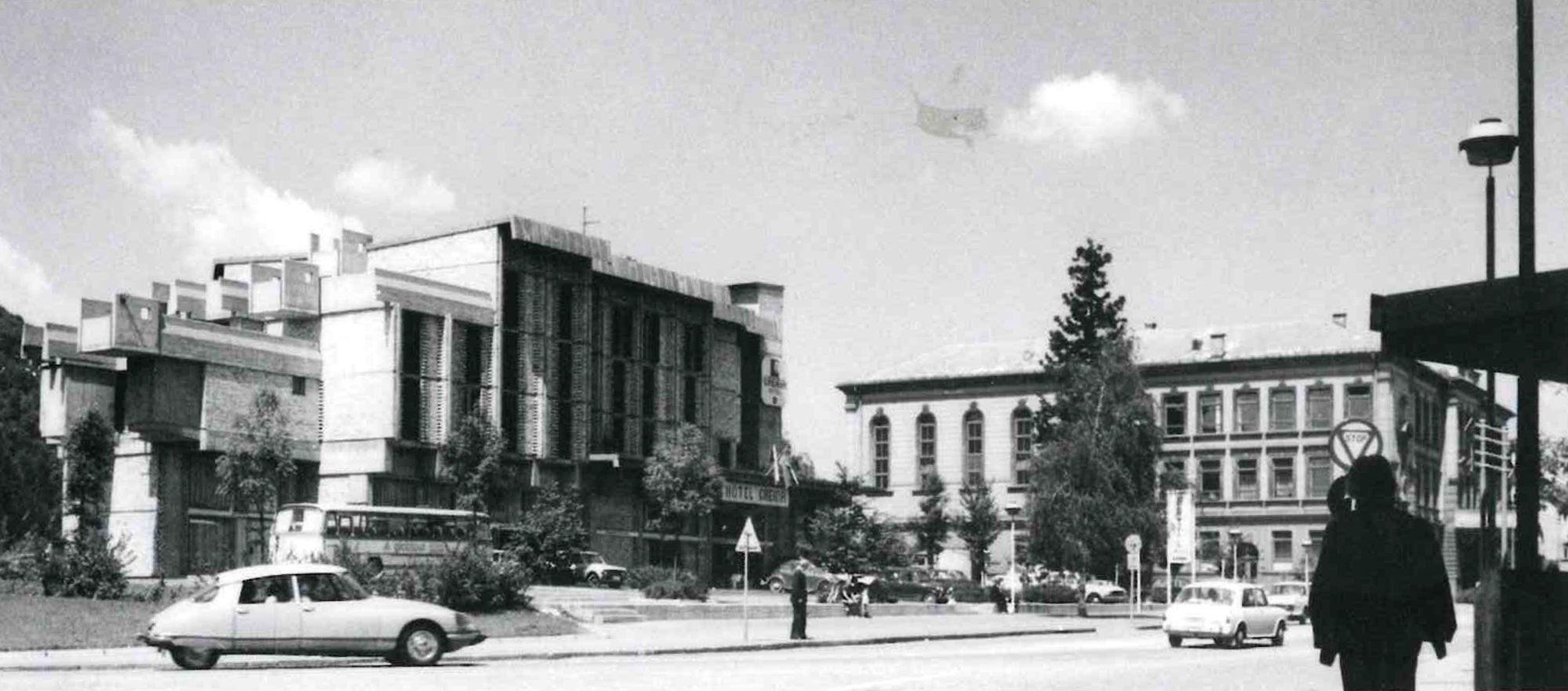 After the municipal office and the adjacent bank building, Ravnikar designed a hotel in Kranj, which he placed above a rocky cliff, defining the western face of the new Revolution Square. The hotel building recedes from the Koroška street heading to Jesenice, pushing as close as possible to the rock overhang while revealing the historical building of the gymnasium to the square. Thus, a square was created in front of the hotel, which is now used for parking hotel guests.