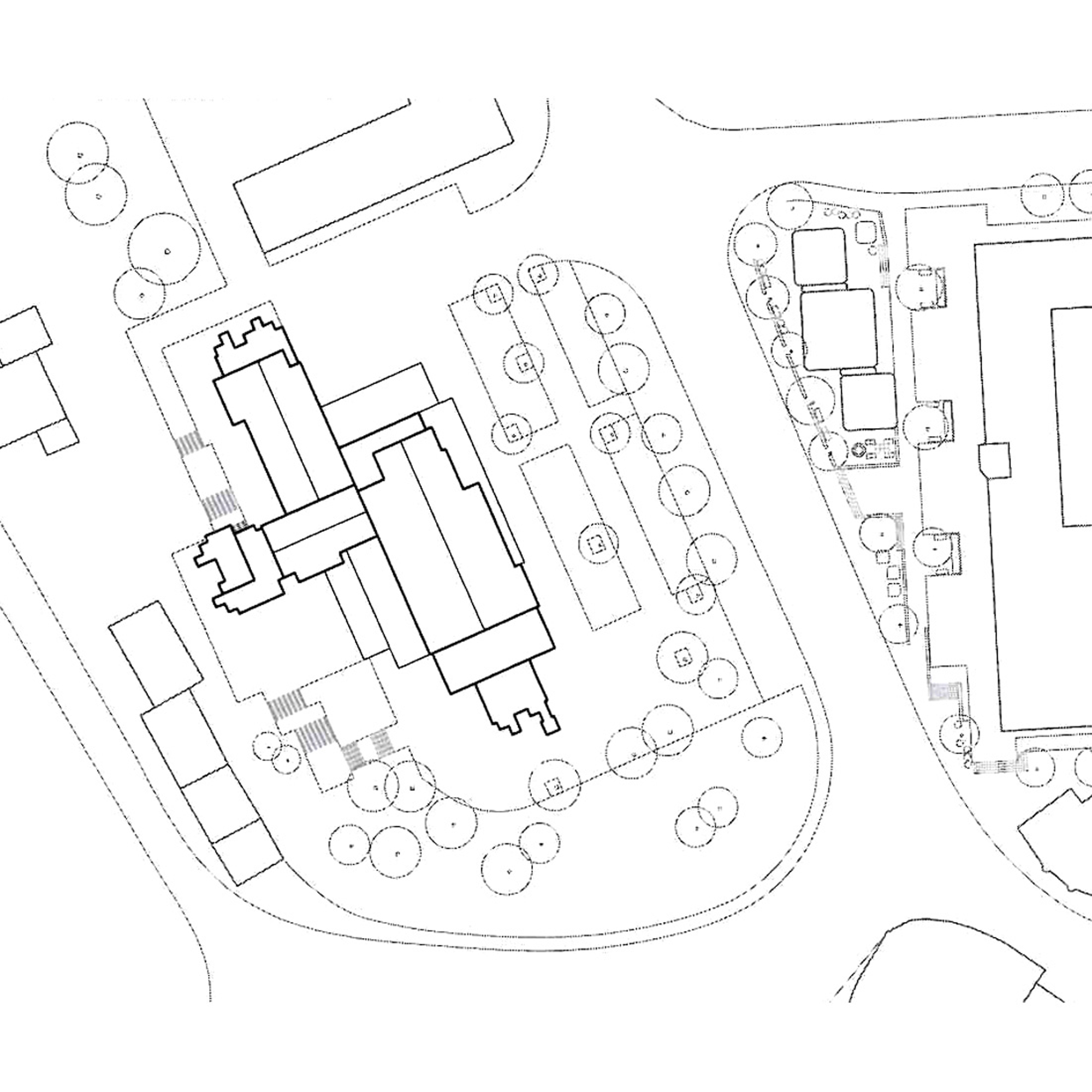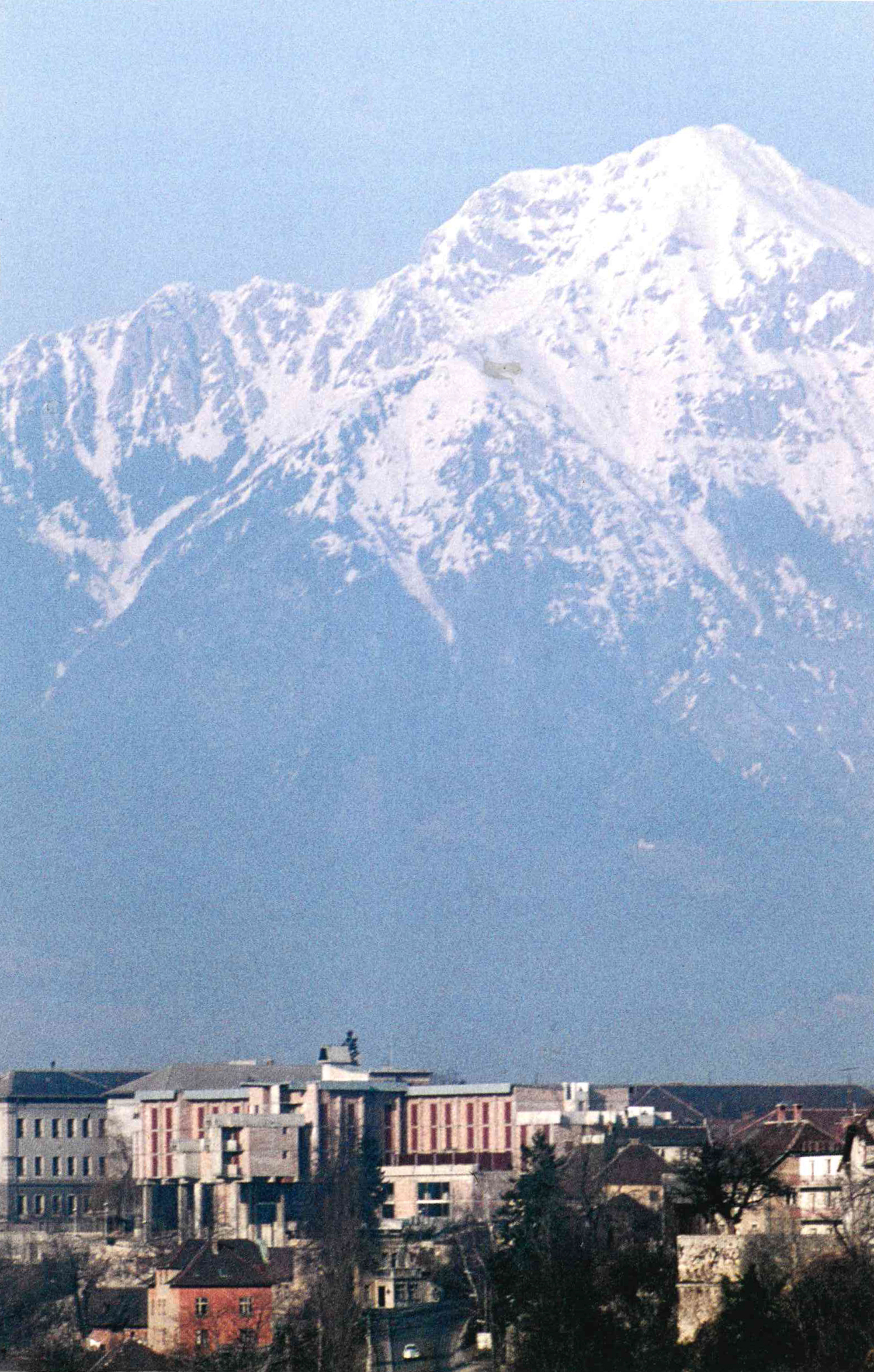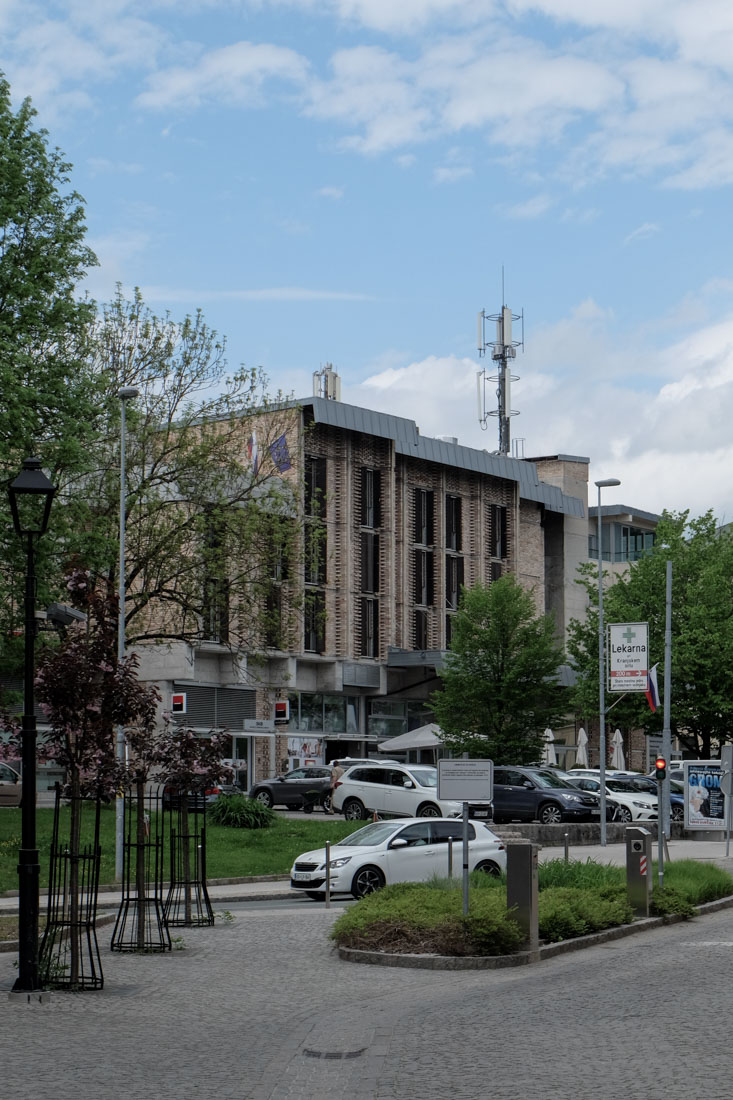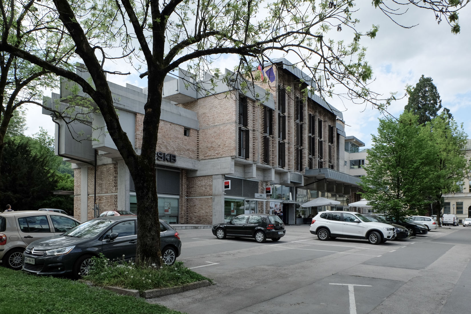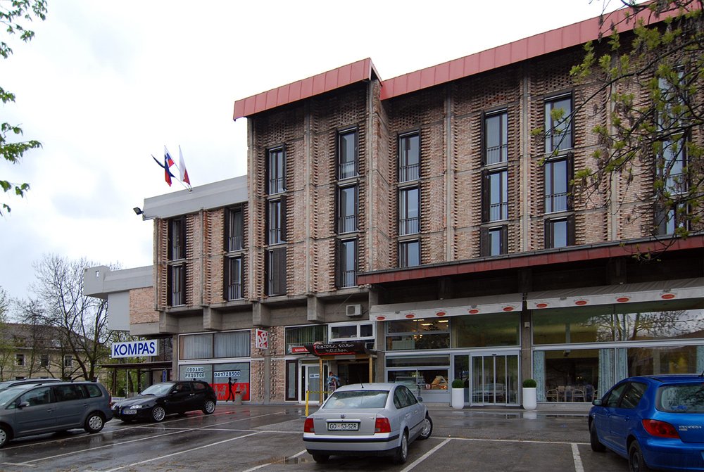 After the municipal office and the adjacent bank building, Ravnikar designed a hotel in Kranj, which he placed above a rocky cliff, defining the western face of the new Revolution Square. The hotel building recedes from the Koroška street heading to Jesenice, pushing as close as possible to the rock overhang while revealing the historical building of the gymnasium to the square. Thus, a square was created in front of the hotel, which is now used for parking hotel guests.