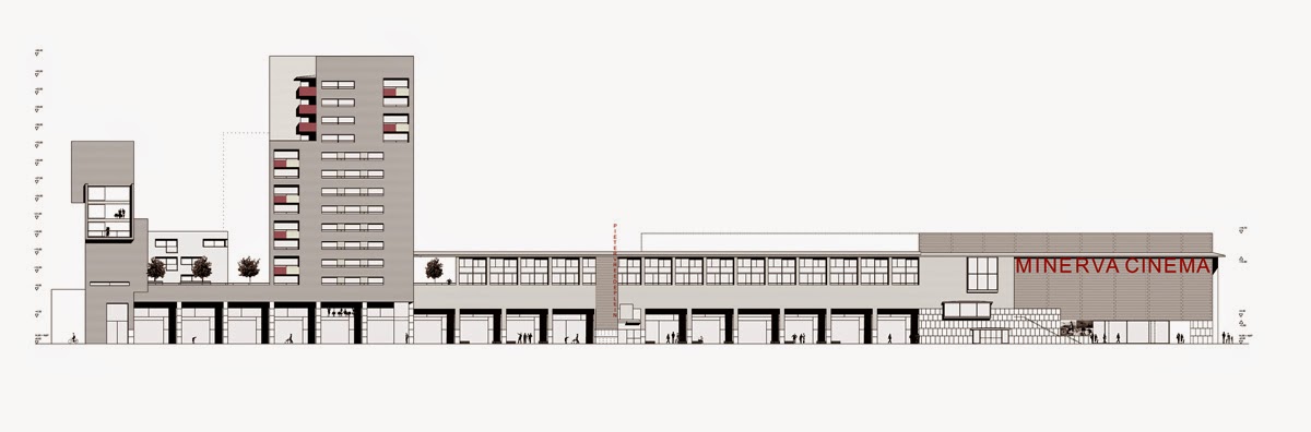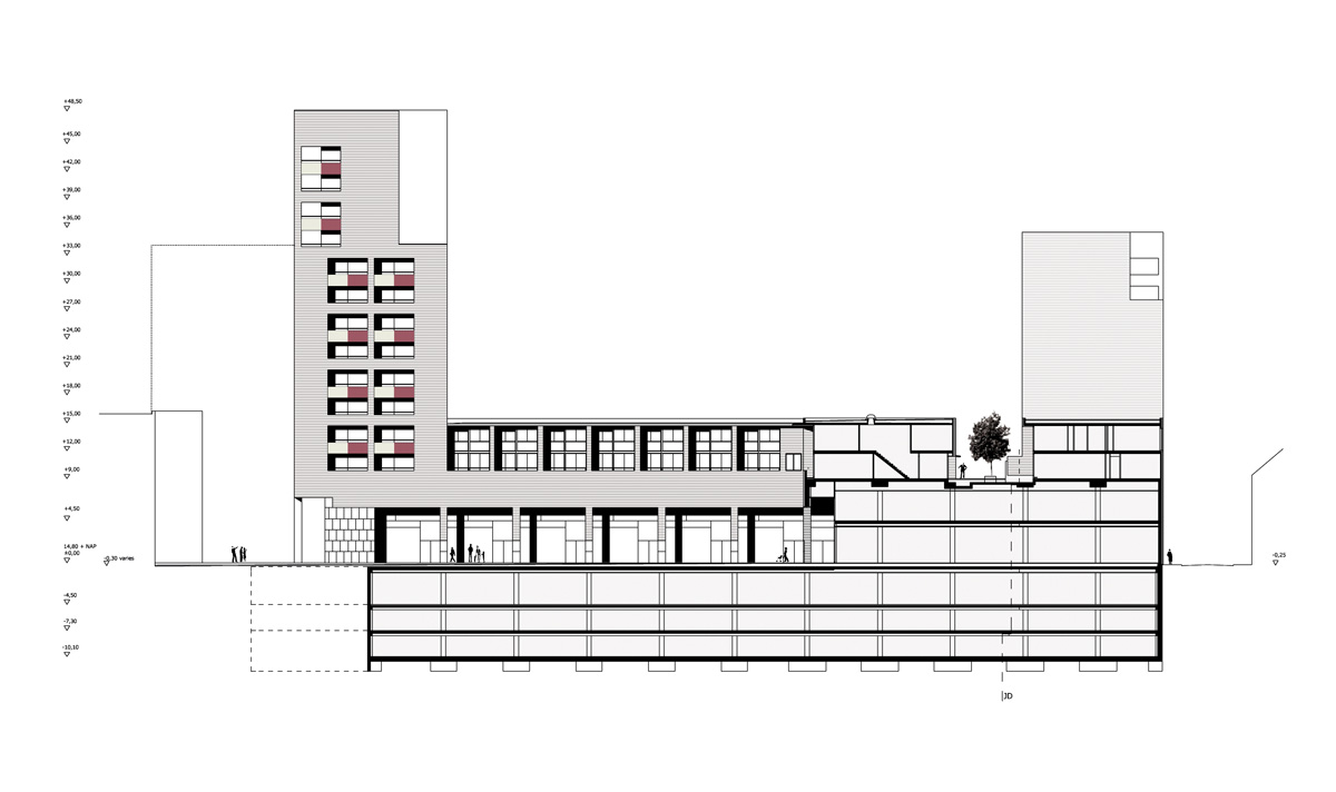 Dichas plazas quedan ‘cerradas’ por dos fachadas que acaban en dos puntos singulares: el acceso a los cines y una torre de viviendas que marca la identidad de las nuevas construcciones. Nueve metros por encima de la plaza, sobre el zócalo comercial, se sitúa una plataforma que da acceso a las viviendas.