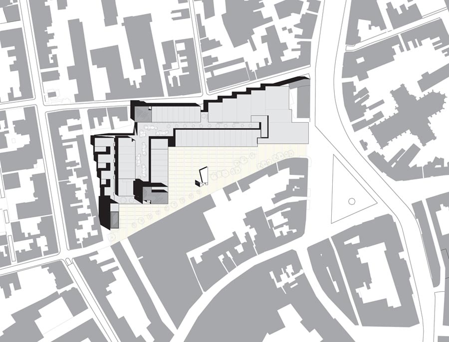 El proyecto del espacio público se encargó al estudio barcelonés Bonell y Gil, quienes resolvieron darle un carácter fuertemente urbano, sustituyendo la forma curva propuesta en el plan director de Jo Coenen, por un conjunto de dos plazas concatenadas de forma triangular que unifica la diversidad del programa (125 viviendas, 26.000 metros cuadrados de uso comercial, un complejo de minicines con 7 salas y un aparcamiento subterráneo para 800 vehículos).