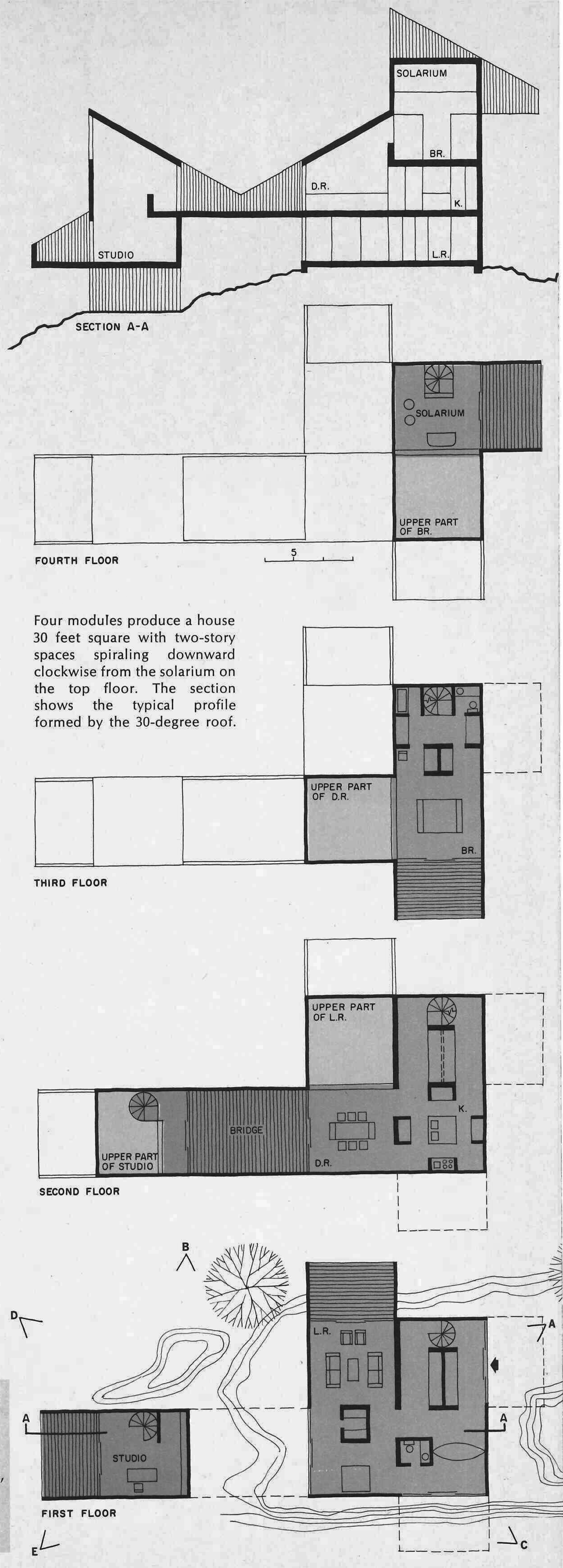 Four modules produce a house 30 feet square with two-storey spaces spiraling downward clockwise from the solarium on the top floor. The section shwos the typical profile formed by the 30 degree roof.
