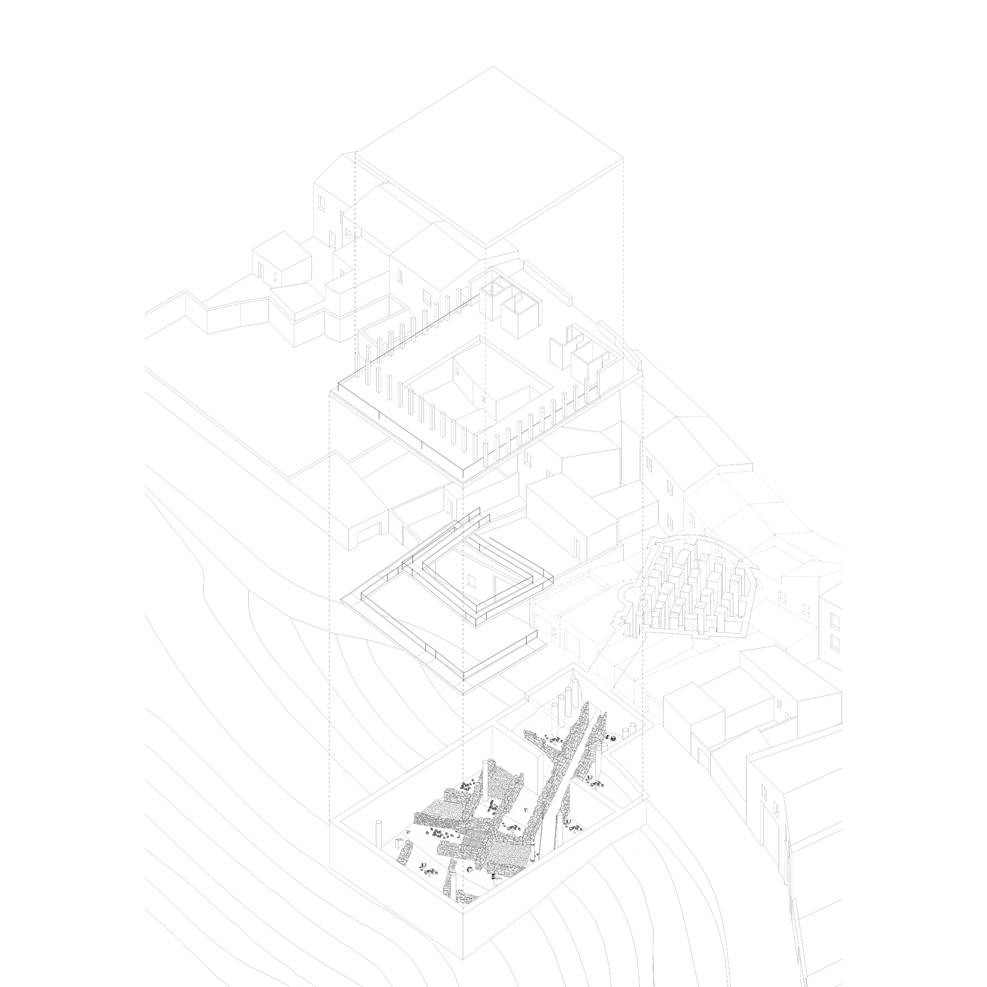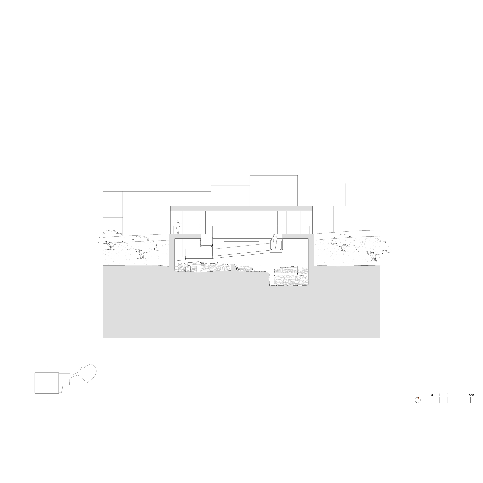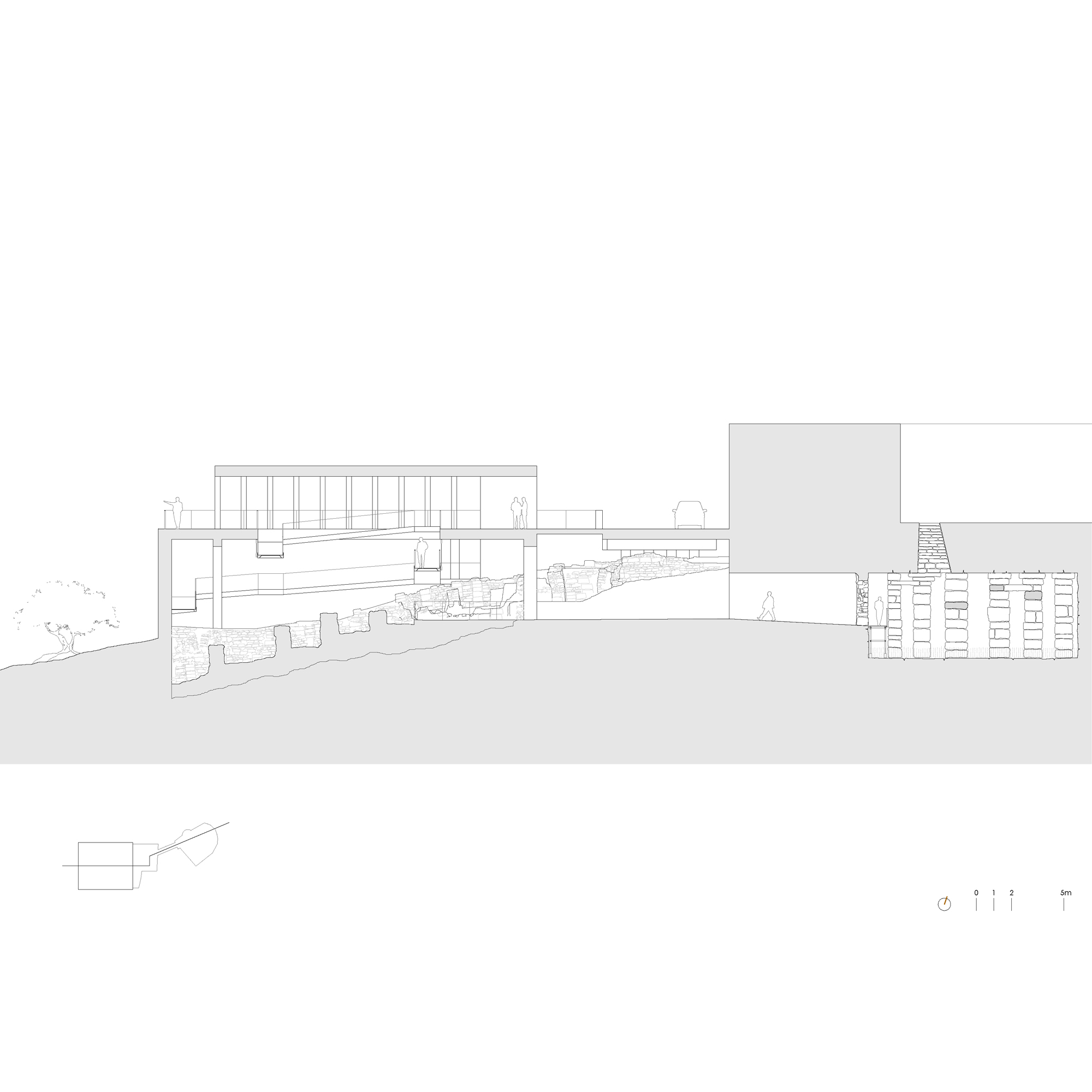 The land on which the development project is located is on the edge of the urban municipality, on a slope of what was once the epicentre of this ancient Roman city. There, the new building opens out towards the slope, forming a space which, at the same time, offers a clear reading with respect to the context in which it is situated. It serves as an iconic reference to the cistern monument itself, displayed on the lower level. The construction is closed to the domestic architectures of the area, which have irregularly formed an area devoid of the sense of heritage, inherent to the architecture of the stratum. Thus, with a clear structure, a space for light is configured as a preliminary step, before accessing the heritage world of the shadows.