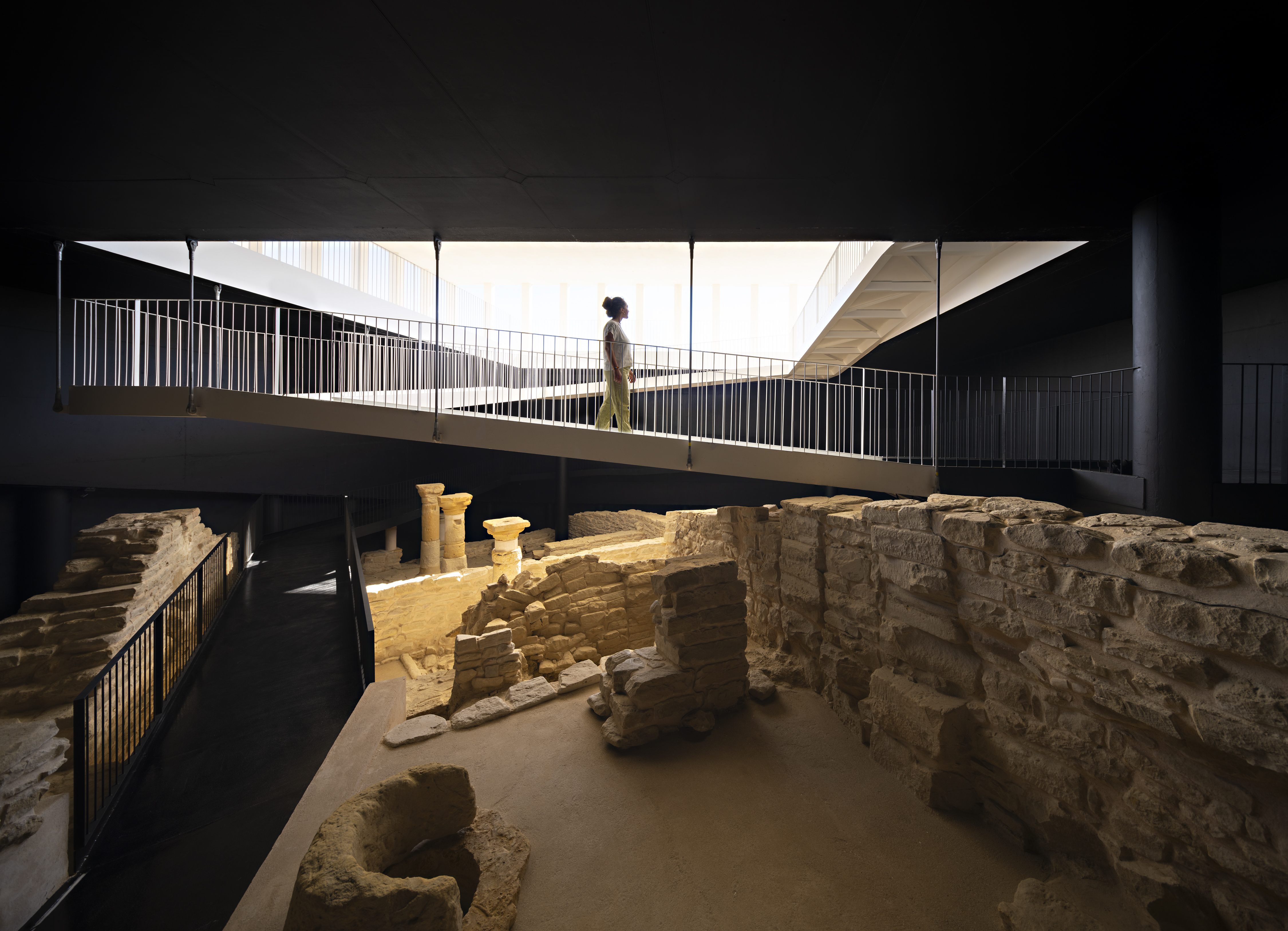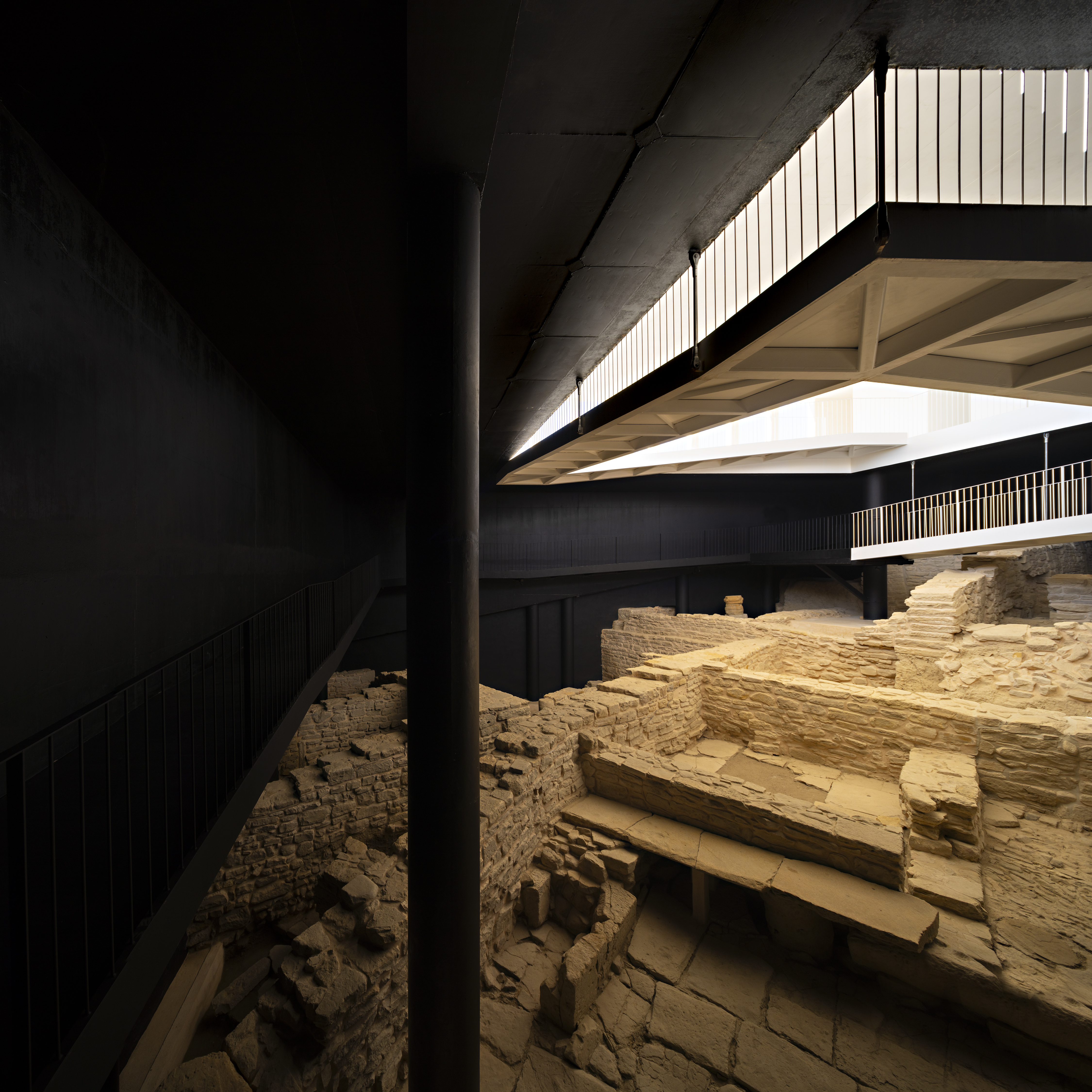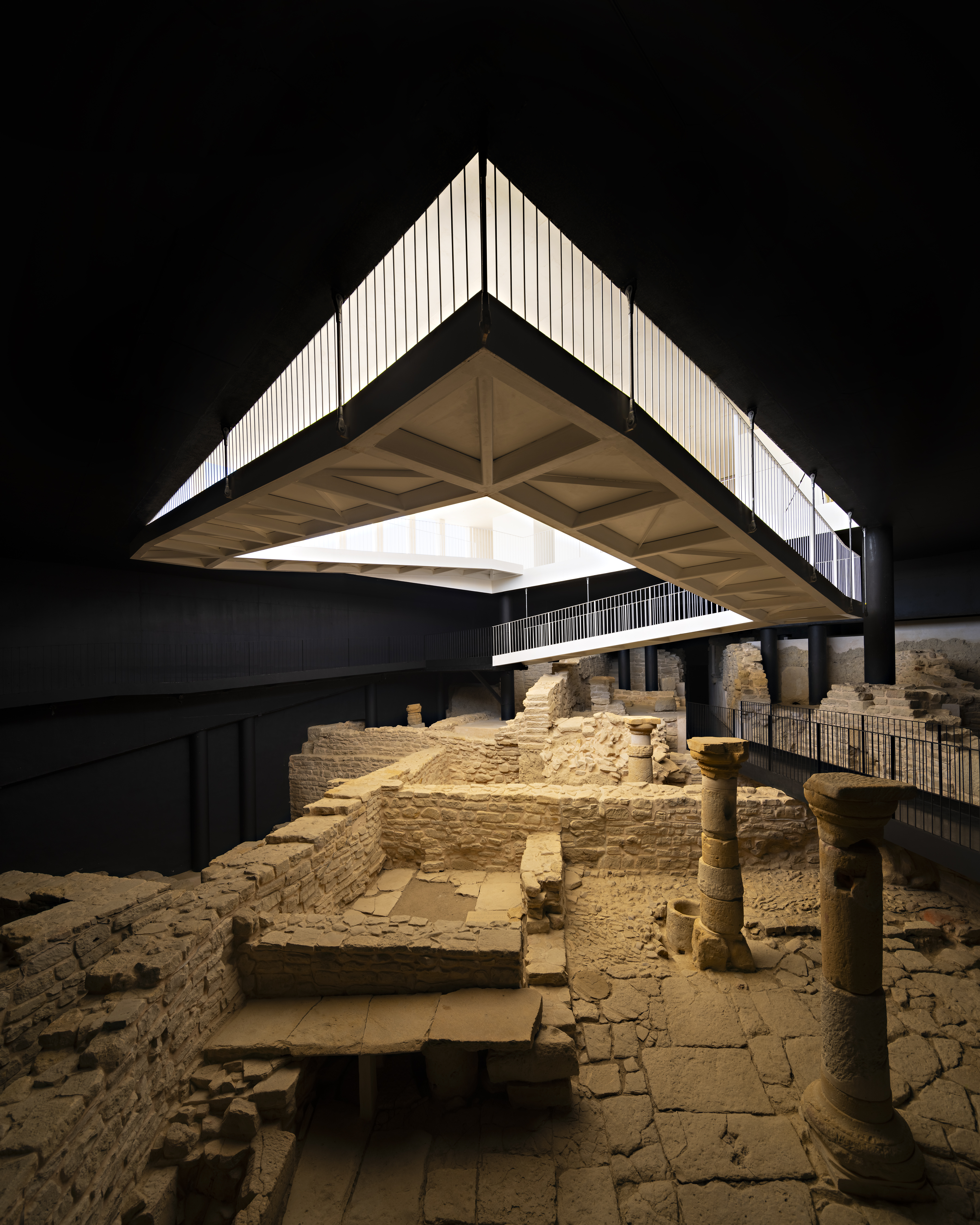 On the contrary, the return to the surface is proposed as a dynamic, a key to the final ascent from the darkness of the interior of the cistern, to the light of the exterior. Over the suspended walkway, the visitor passes through an open space that is suspended above the ruins. Part of the Roman city can be observed and toured without disrupting it. Perhaps, without being aware of it, this tour updates the Platonic allegory of the cave, reaching knowledge (in this case, the understanding of a part of the history of an ancient land) after journeying through the centuries, culminating in the welcoming peristyle.