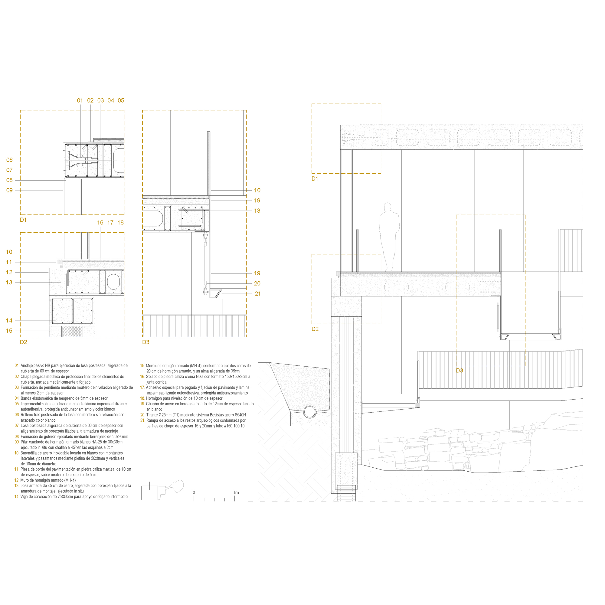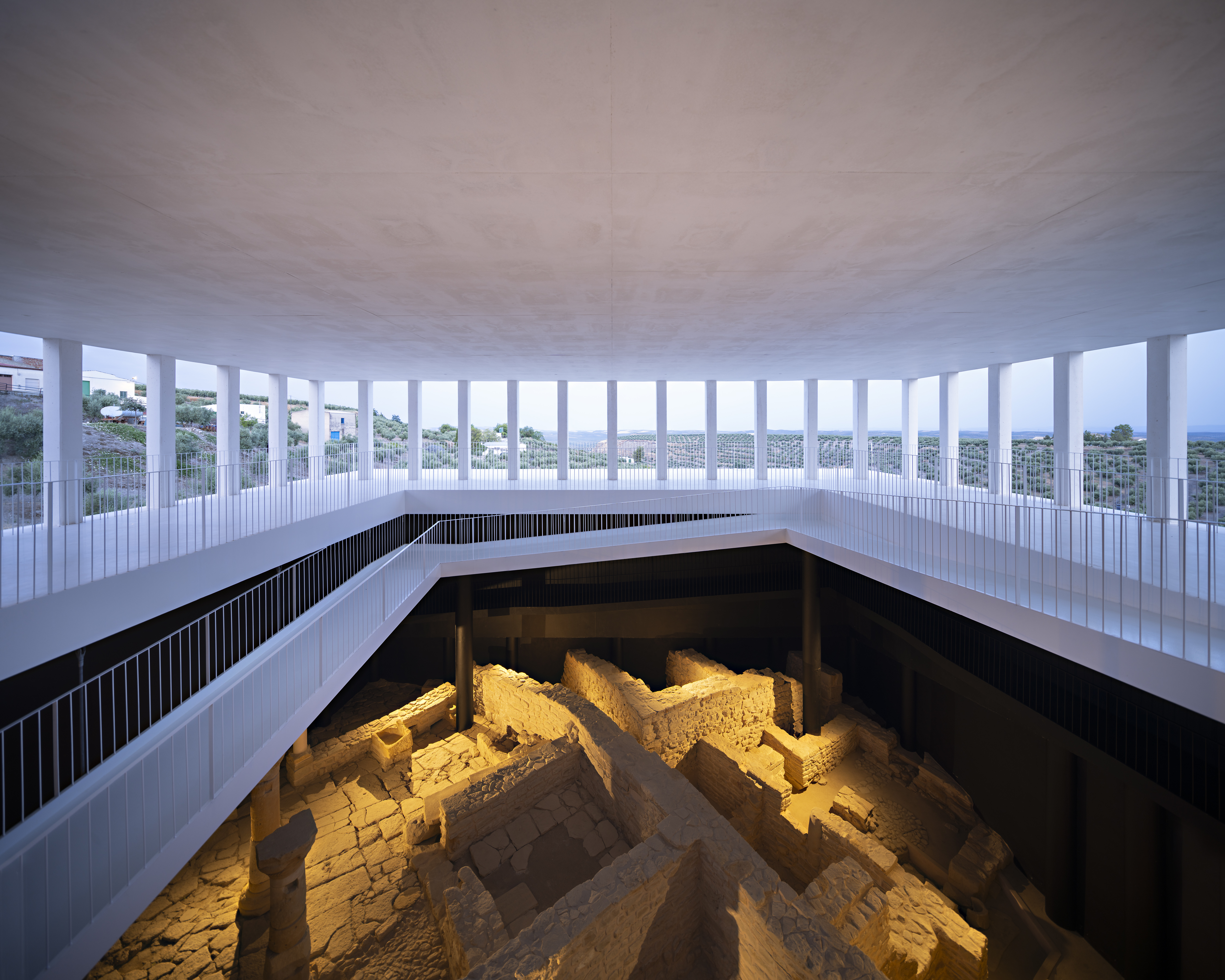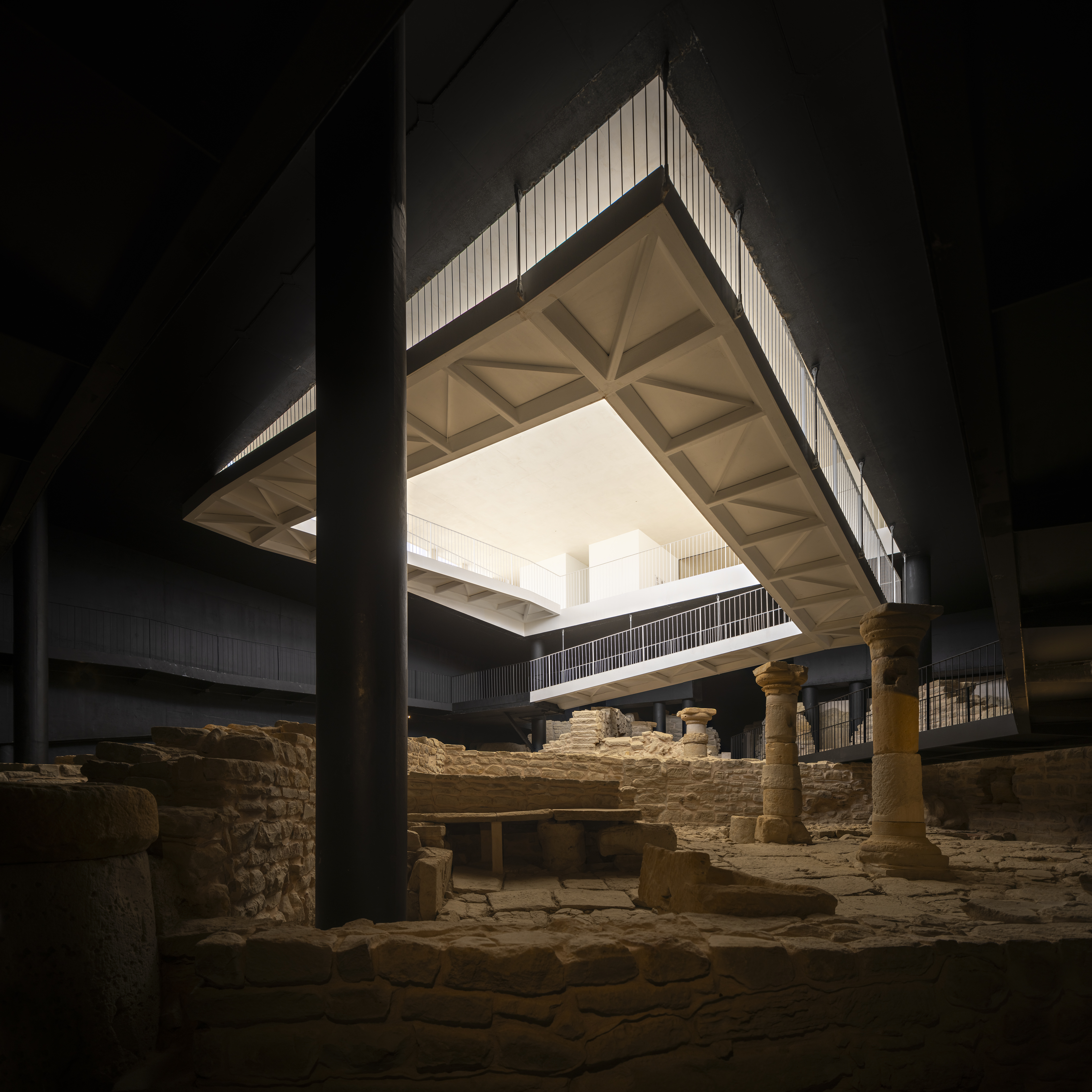 On the contrary, the return to the surface is proposed as a dynamic, a key to the final ascent from the darkness of the interior of the cistern, to the light of the exterior. Over the suspended walkway, the visitor passes through an open space that is suspended above the ruins. Part of the Roman city can be observed and toured without disrupting it. Perhaps, without being aware of it, this tour updates the Platonic allegory of the cave, reaching knowledge (in this case, the understanding of a part of the history of an ancient land) after journeying through the centuries, culminating in the welcoming peristyle.