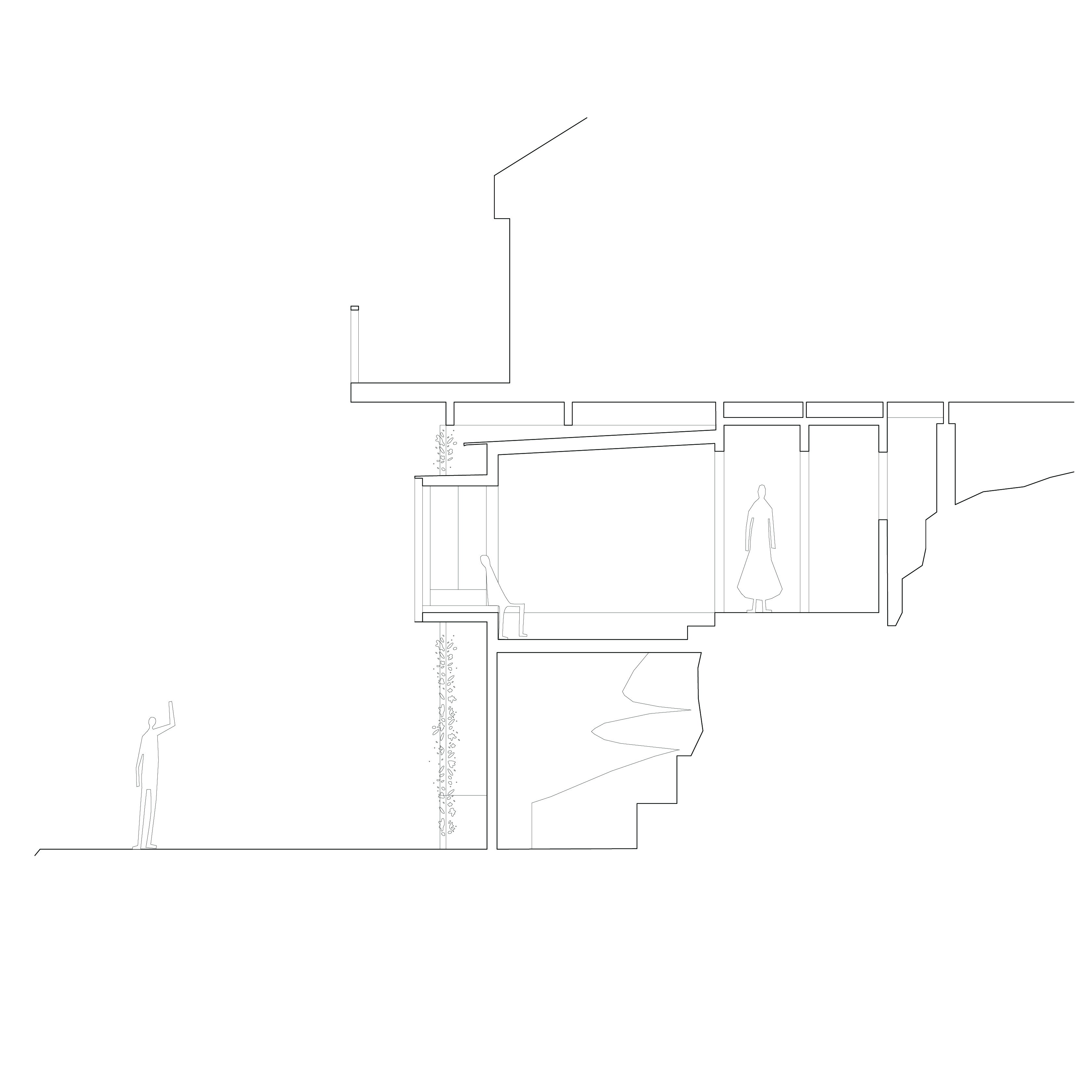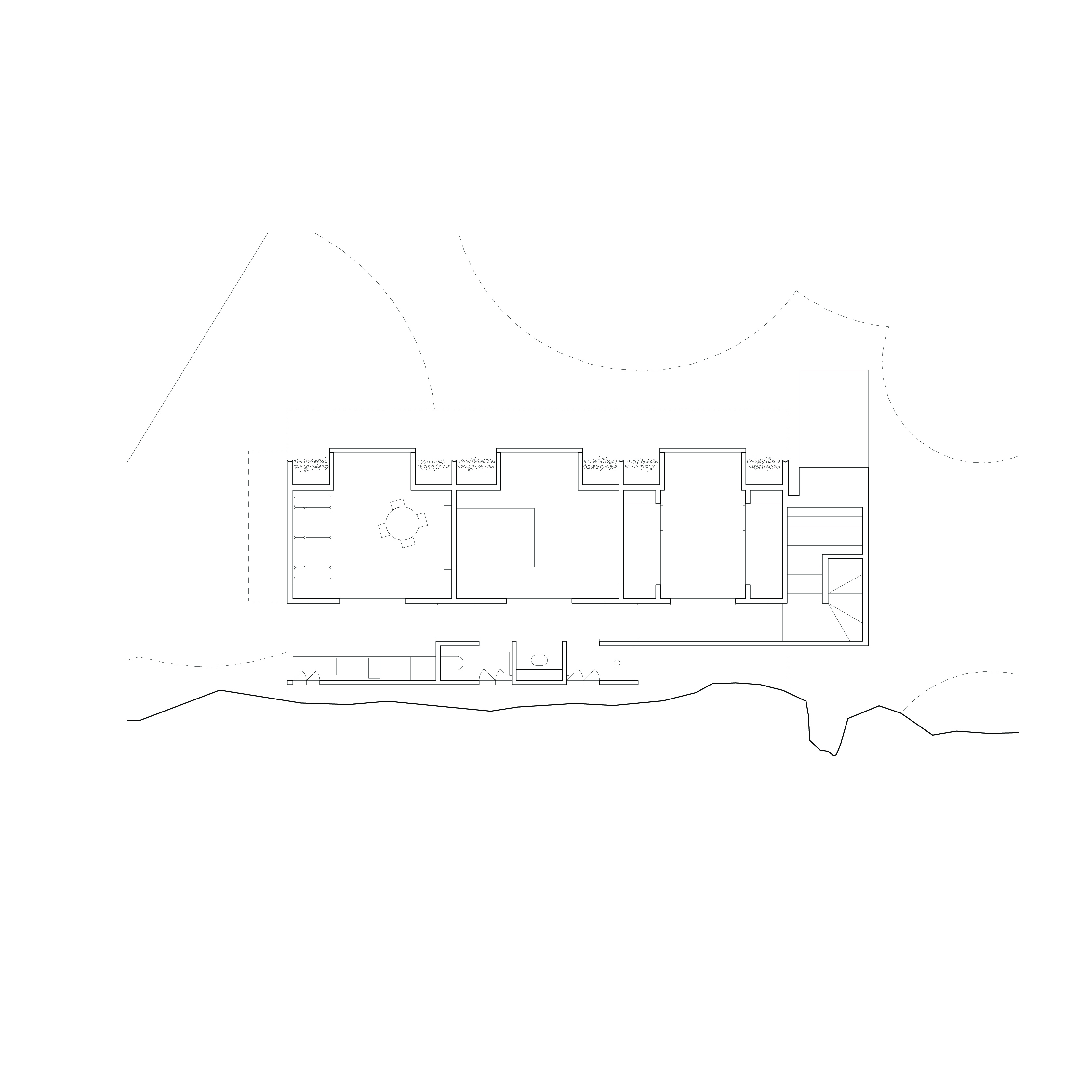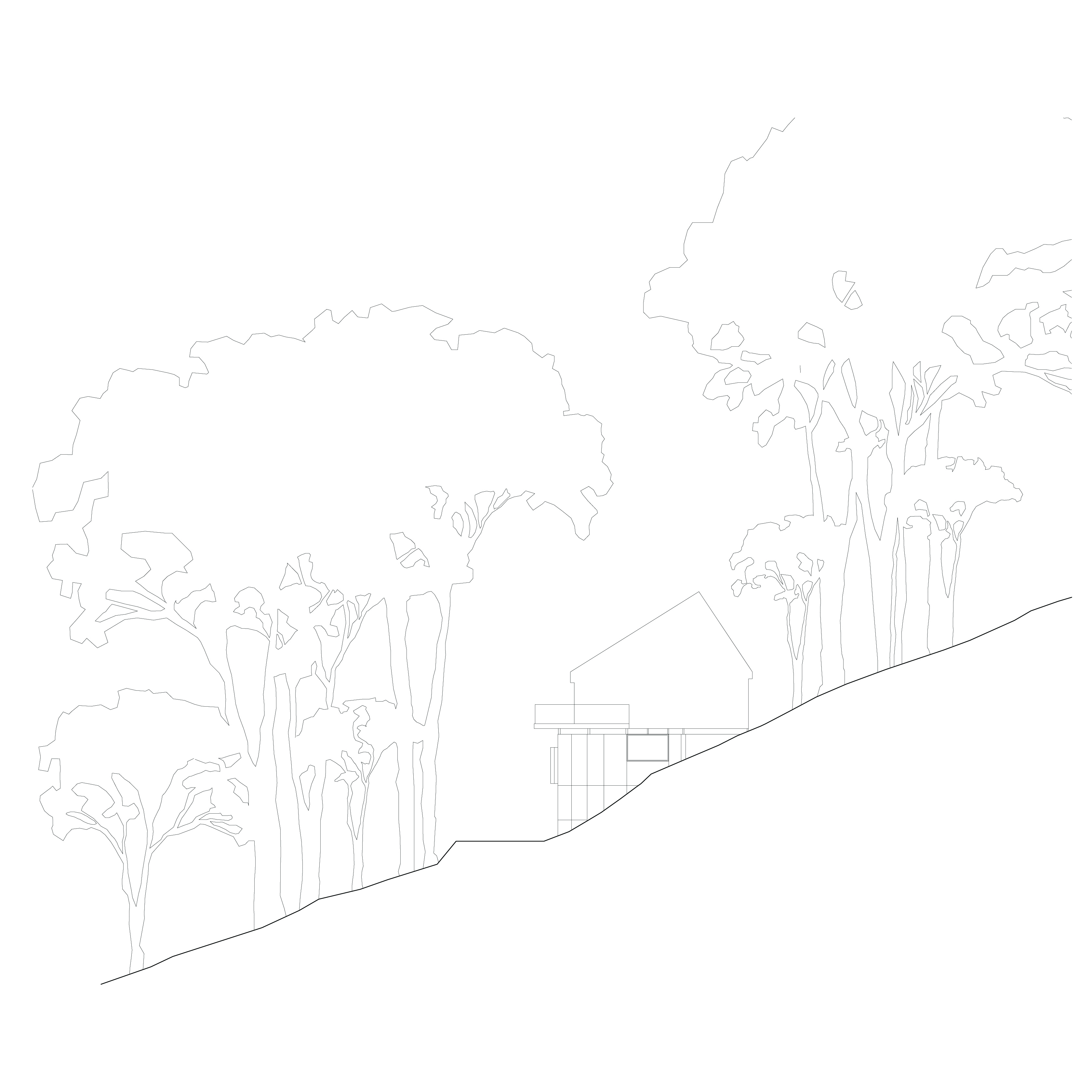 The room feels slightly too small – not uncomfortably so – but still there is something about the space. The combination of the threshold head height, the steps down from the hall and the slope of the ceiling give a vague feeling of pitching forward, an insinuated disquiet. The internal finishes are neutral, timber below white painted plaster. Curiosity is focused, everything leads to the window that pushes further forward into space above the garden. Within the bay window, right at the edge, there is a place to stop – at the scale of a person, or to share intimately with another. It is a place to notice life in the canopy, the scallop pattern of the crashing waves in the bay, movement on the ridge, or the whoop of approaching guests. In working deliberately with proportional juxtapositions and heightened bodily experience, we had in mind the architectural technique employed at the Laurentian Library.