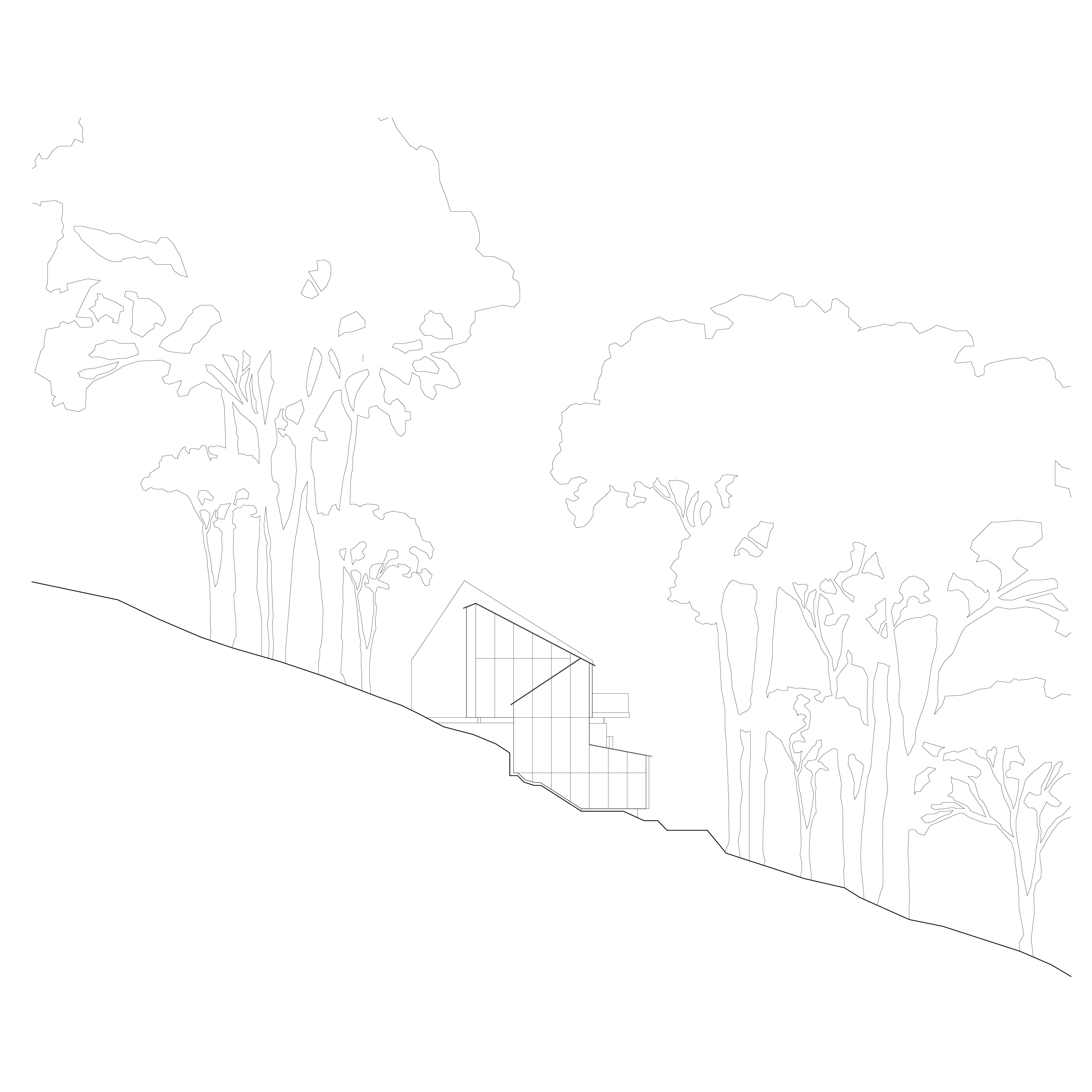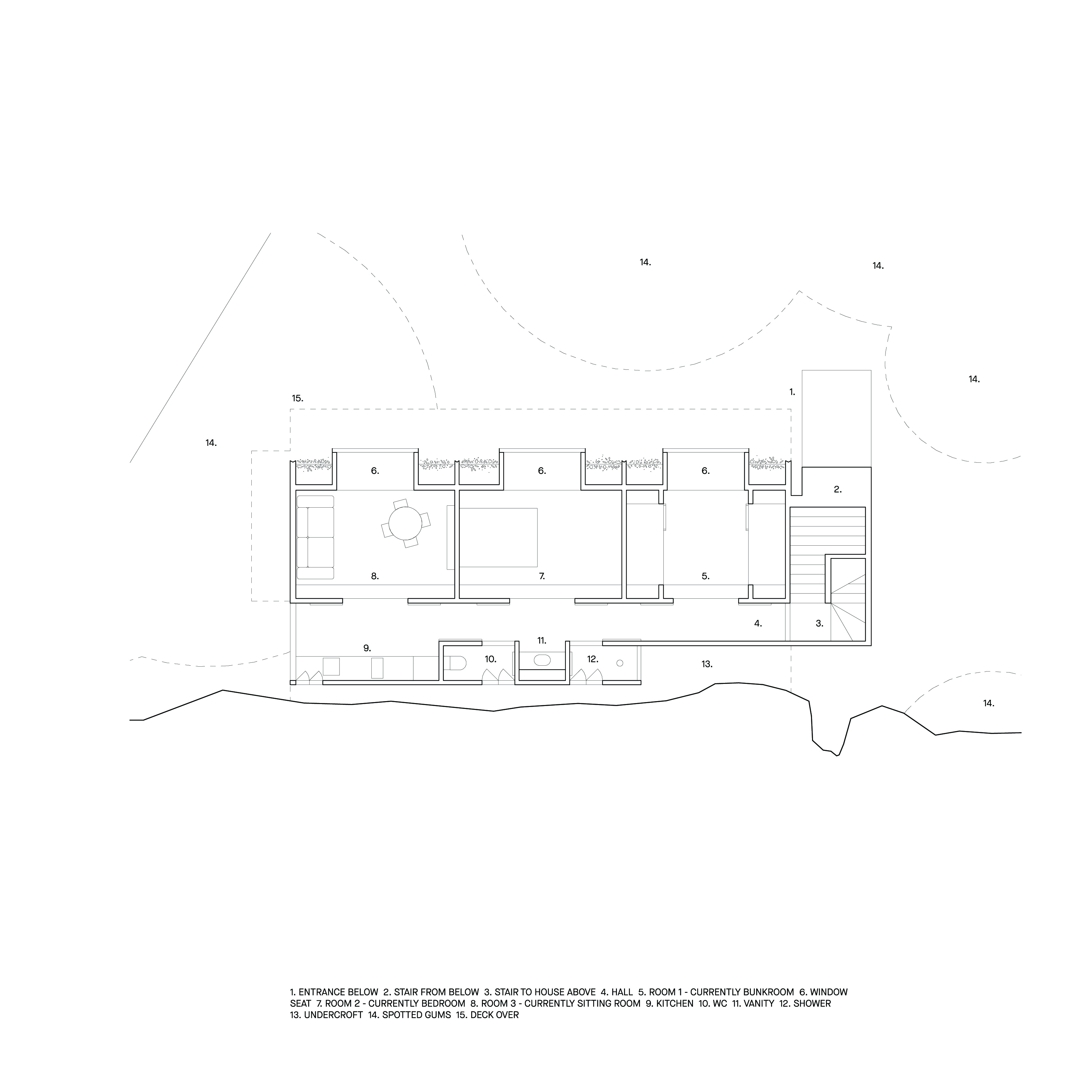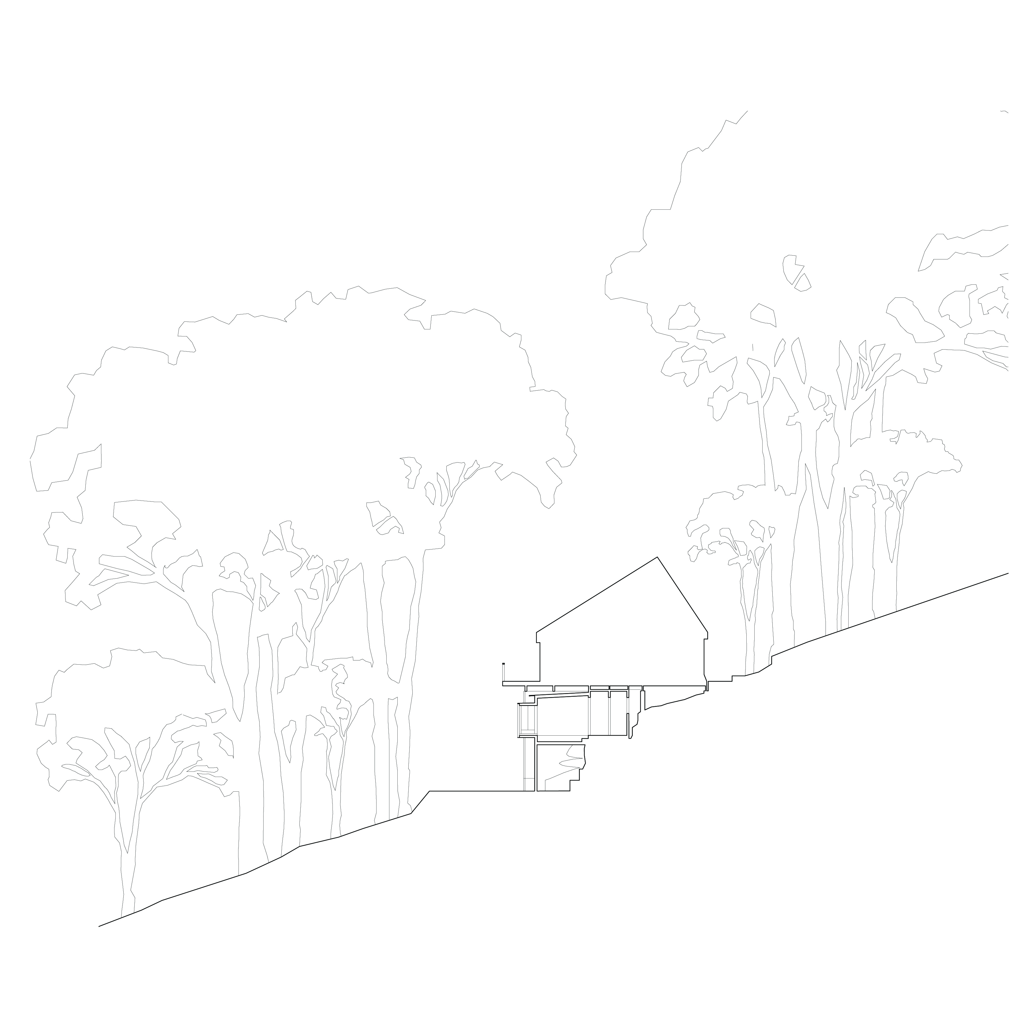 There, before a grand stair within a foyer somehow too small, a slight discomfort is evident. Once ascended though, this feeling sweetly dissipates before the serene beauty of the long reading room, made more impactful by what went before. This project called for three additional rooms and a new entrance stair to an existing house by the beach for extended family and guests. The existing two bedroom house had evolved over the years to establish generous internal and external living spaces; the great Australian deck within the trees. The site slopes steeply with an aspect to the northeast, access is from the street below with outlook afforded through the established front garden and over the bay. To the south is national park with the house located below the narrow ridge of Green Point; this ridge protects from southerlies and limits the potential for severe bushfire.