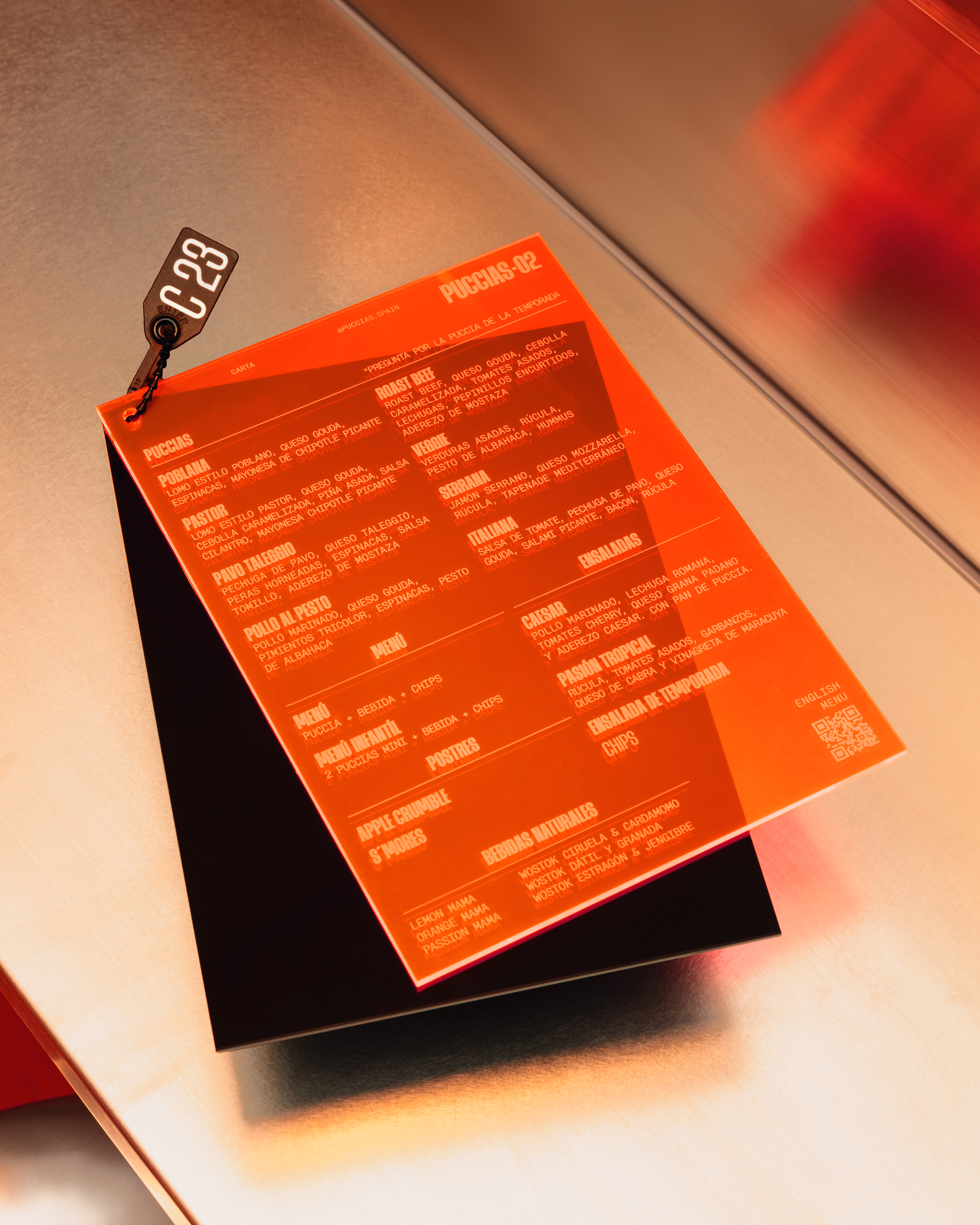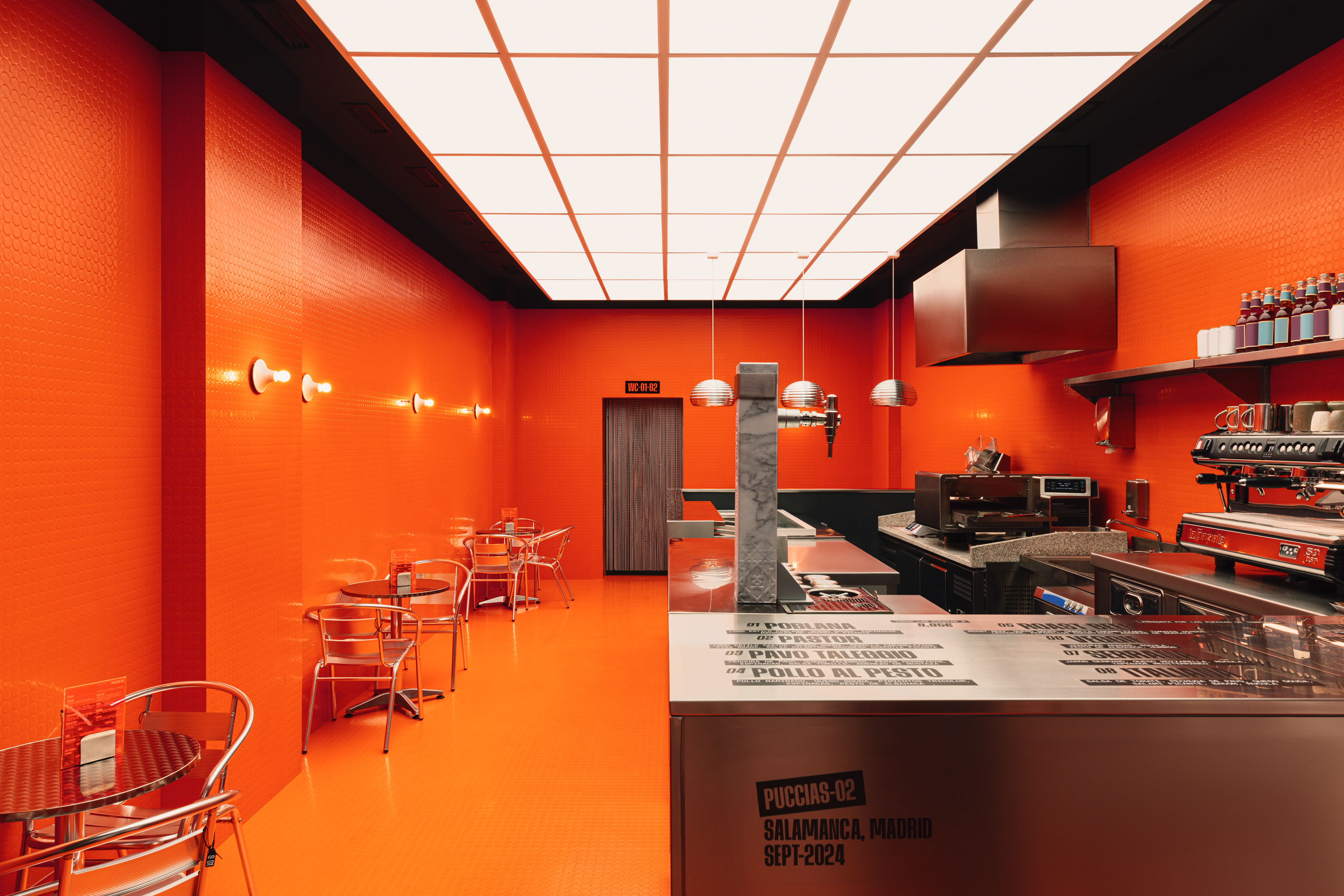 Un material y un color perteneciente a la identidad de la marca (el naranja) predominan y caracterizan este espacio de claras connotaciones pop, que se ha pensado desde un comienzo como un proyecto potente, contundente, muy claro y decidido, donde la luz es abundante y proveniente del falso techo “como en un estudio fotográfico”.