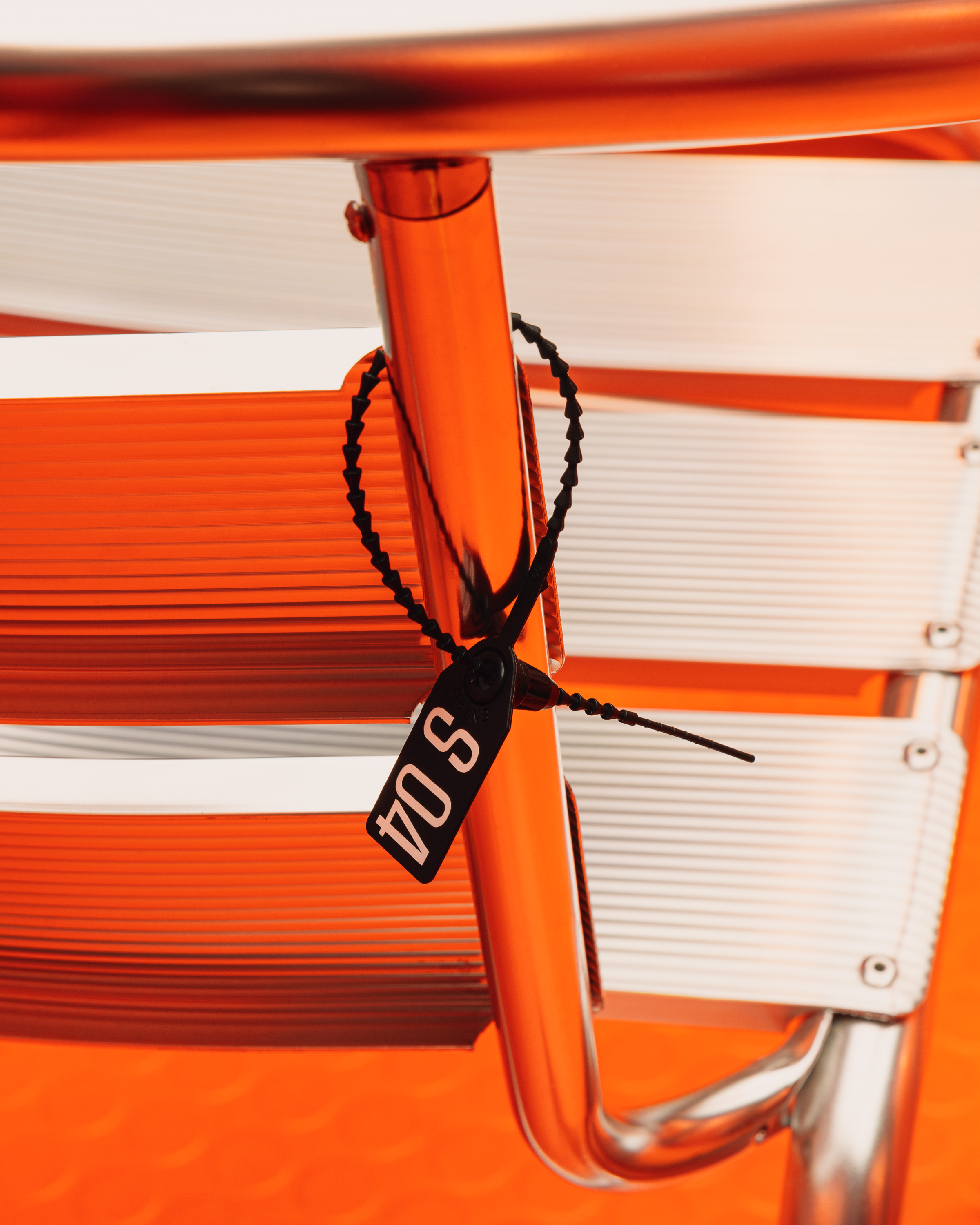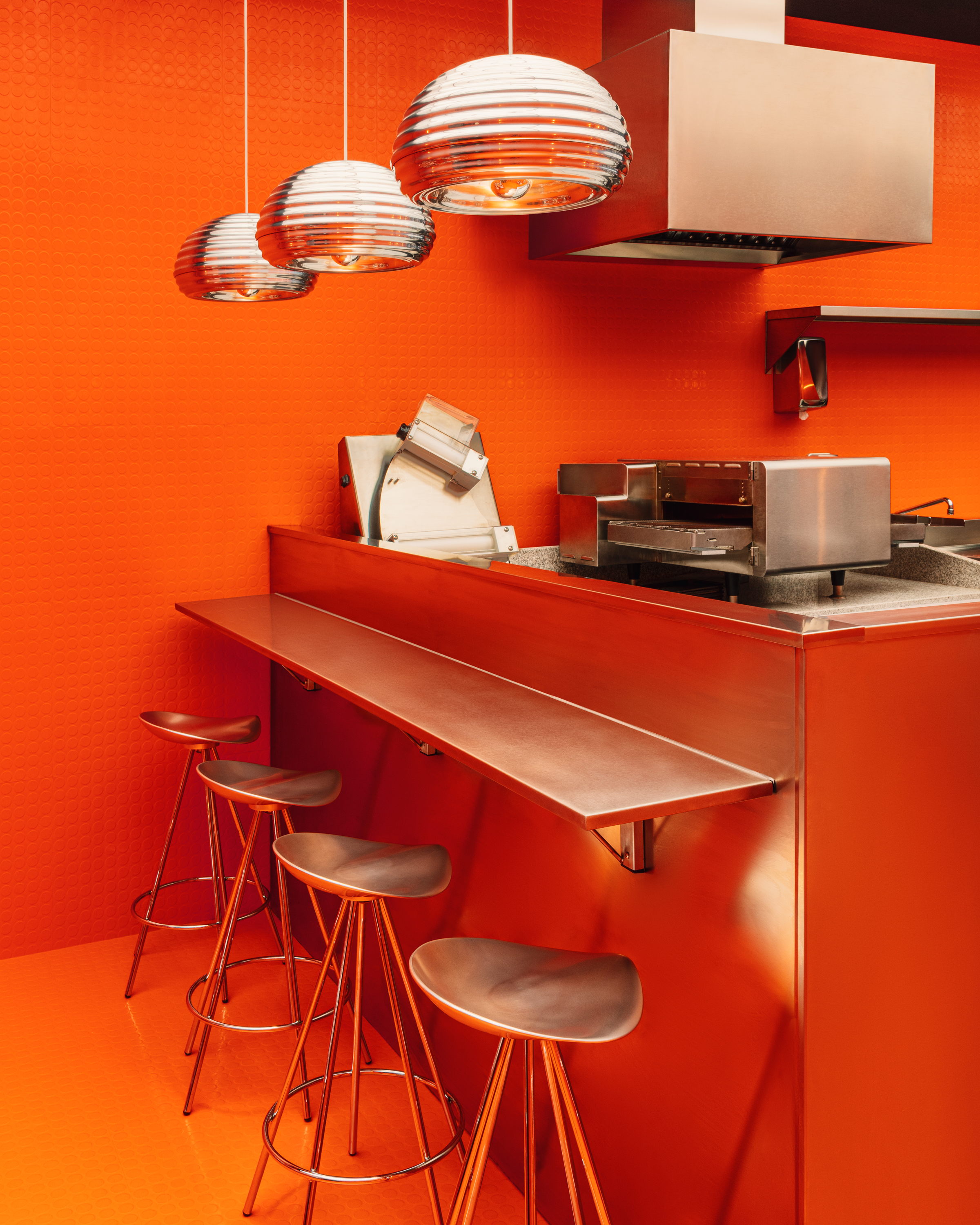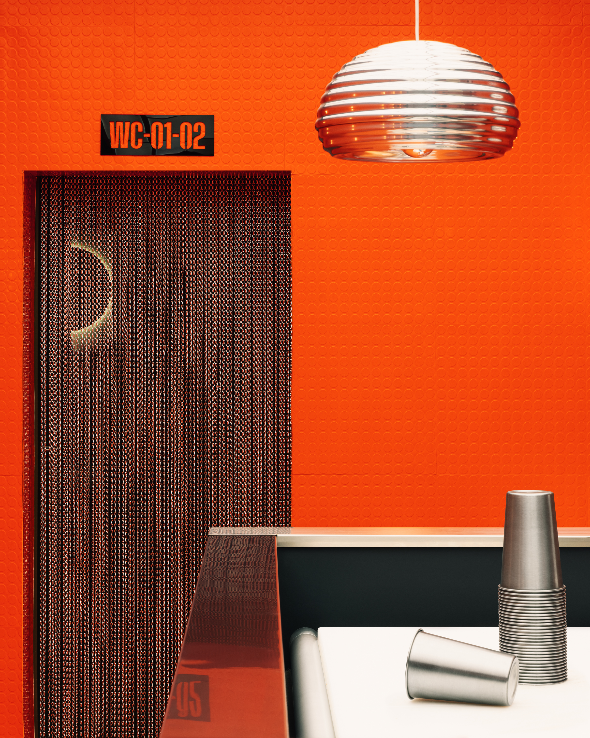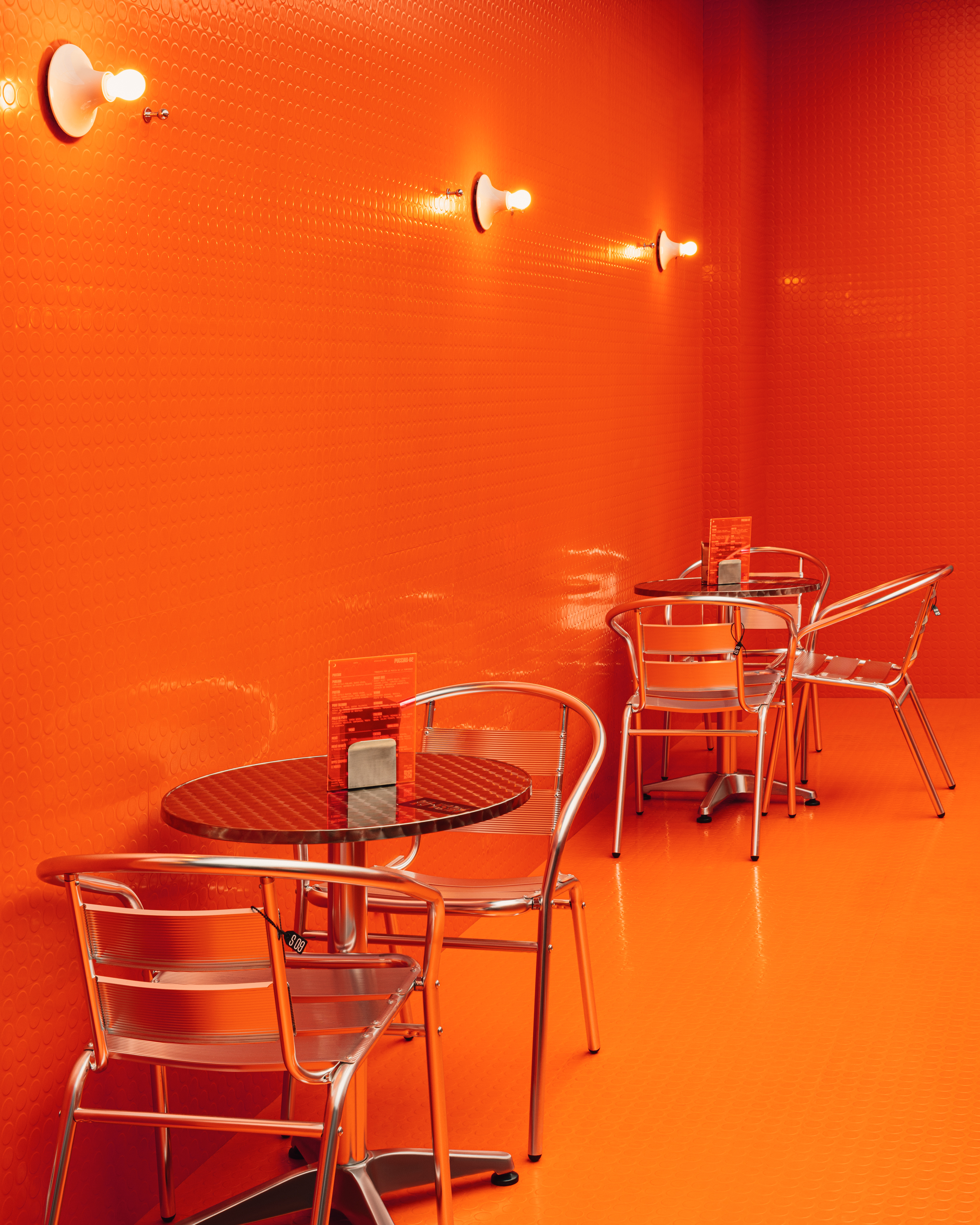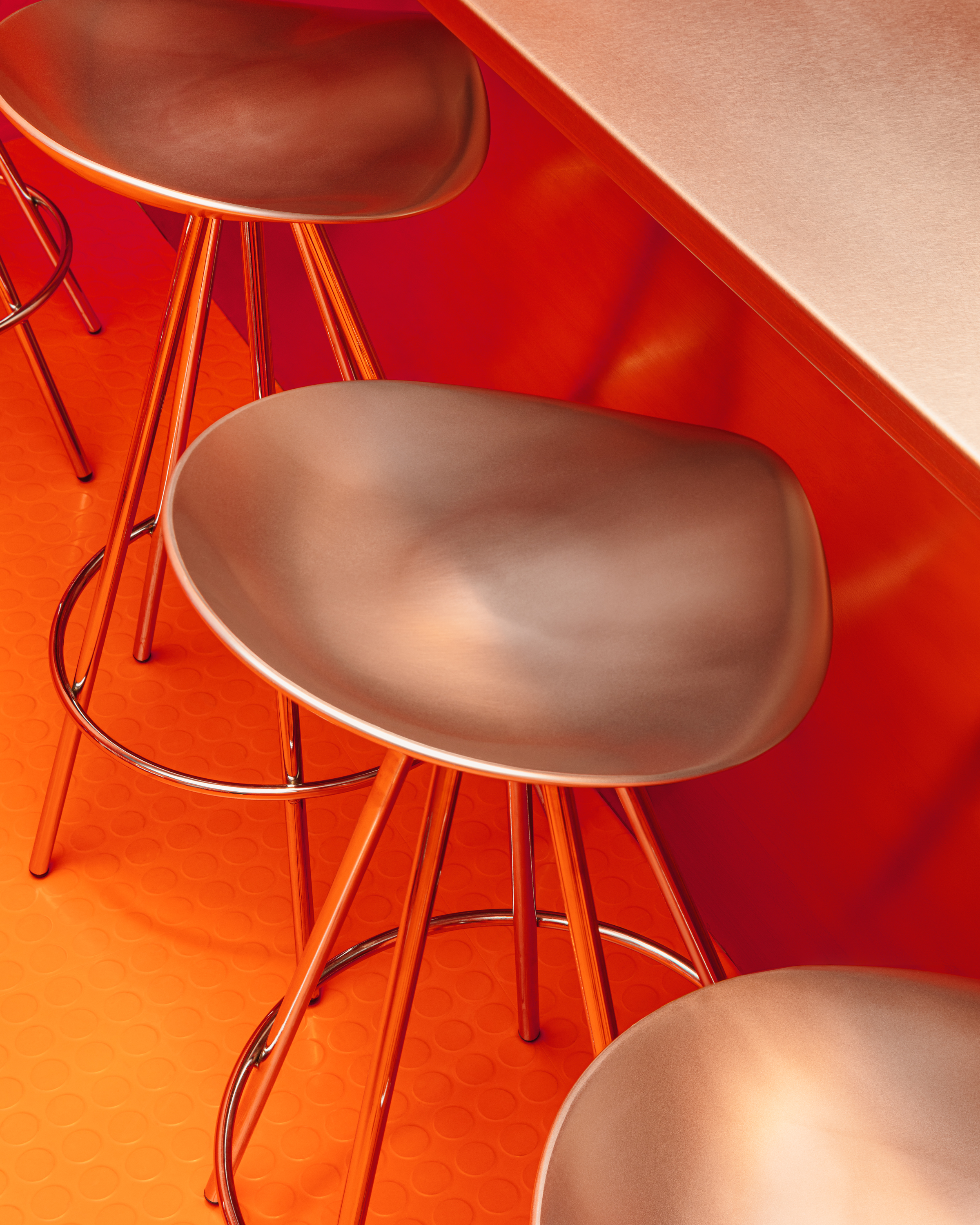 Junto a la goma naranja que sirve como revestimiento vertical en las paredes y para los suelos, se usaron algunos elementos auxiliares en acabado metalizado para enfatizar el valor eminentemente aséptico del espacio gastronómico. Las barras (en acero inoxidable) y el mobiliario destinado a usuarios y clientes (de aluminio en crudo) se resuelve con elementos anónimos, muy conocidos, típicos para decorar las terrazas de los bares.