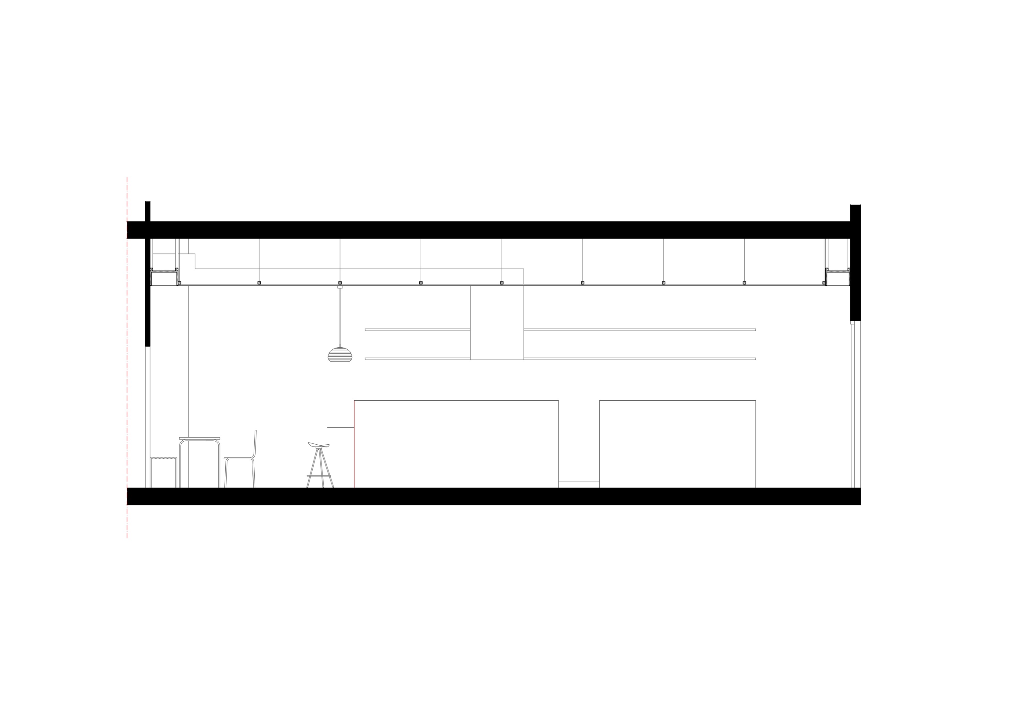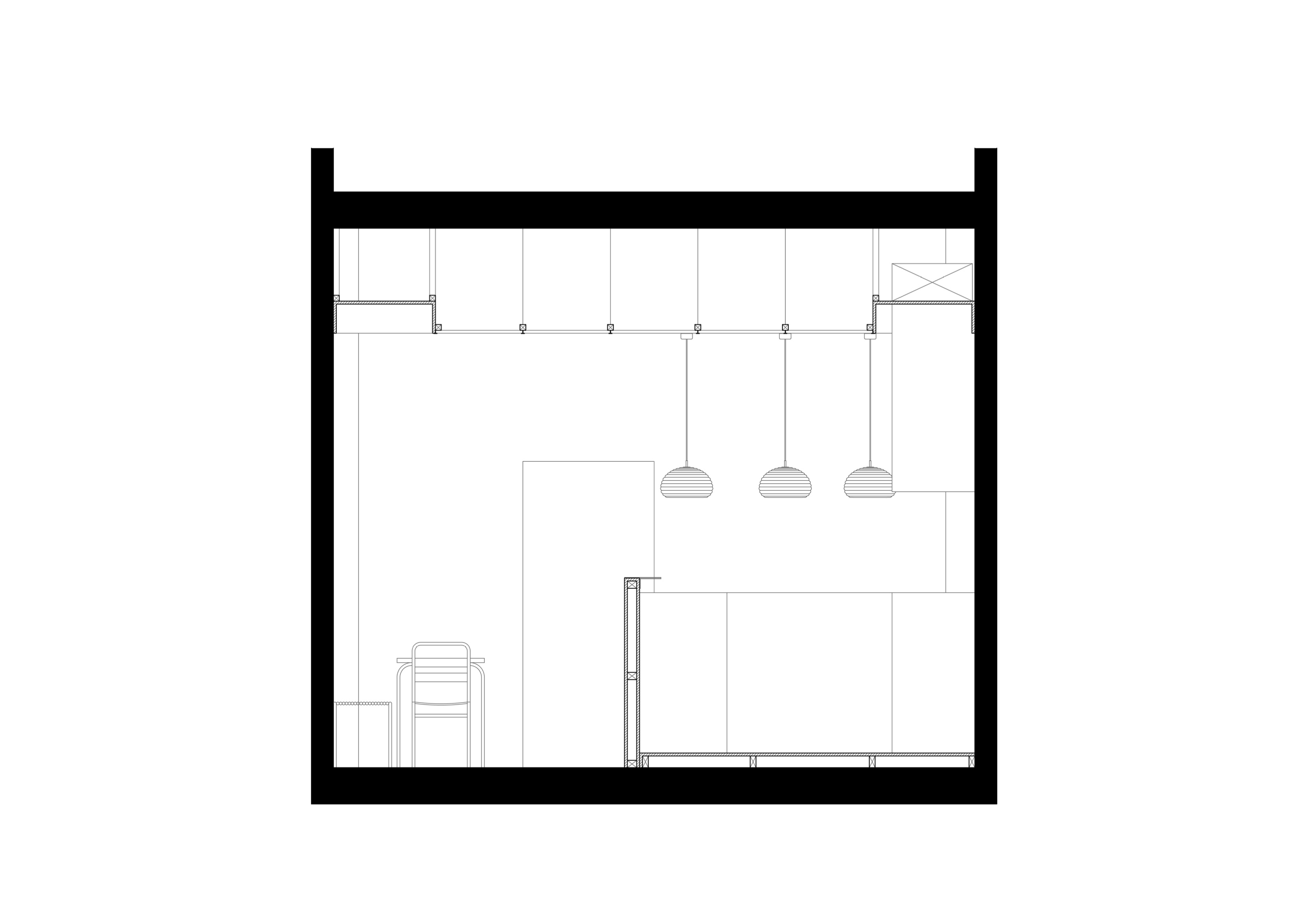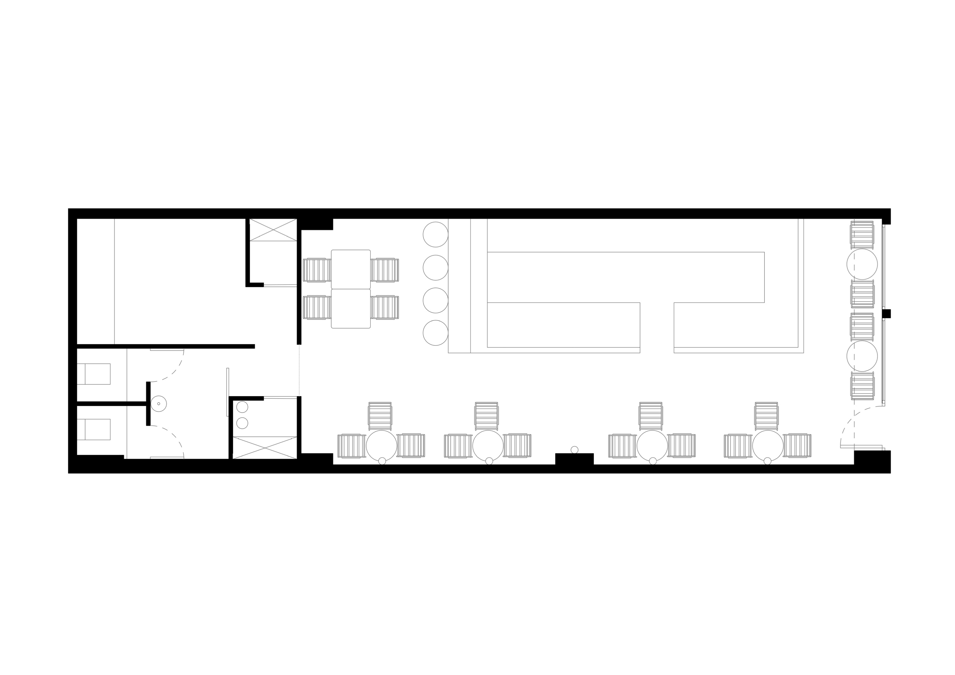 Un espacio dedicado a los clientes que deciden disfrutar de una vista privilegiada de la cocina y de la preparación de la especialidad de la casa. Al fondo una zona de servicio se delimita con una cortina metálica de cadenitas, otro elemento anónimo del imaginario común pertenecientes a todos. En todo caso se trata de dar valor a cosas comunes, sencillas y muy importantes para dar carácter al espacio.