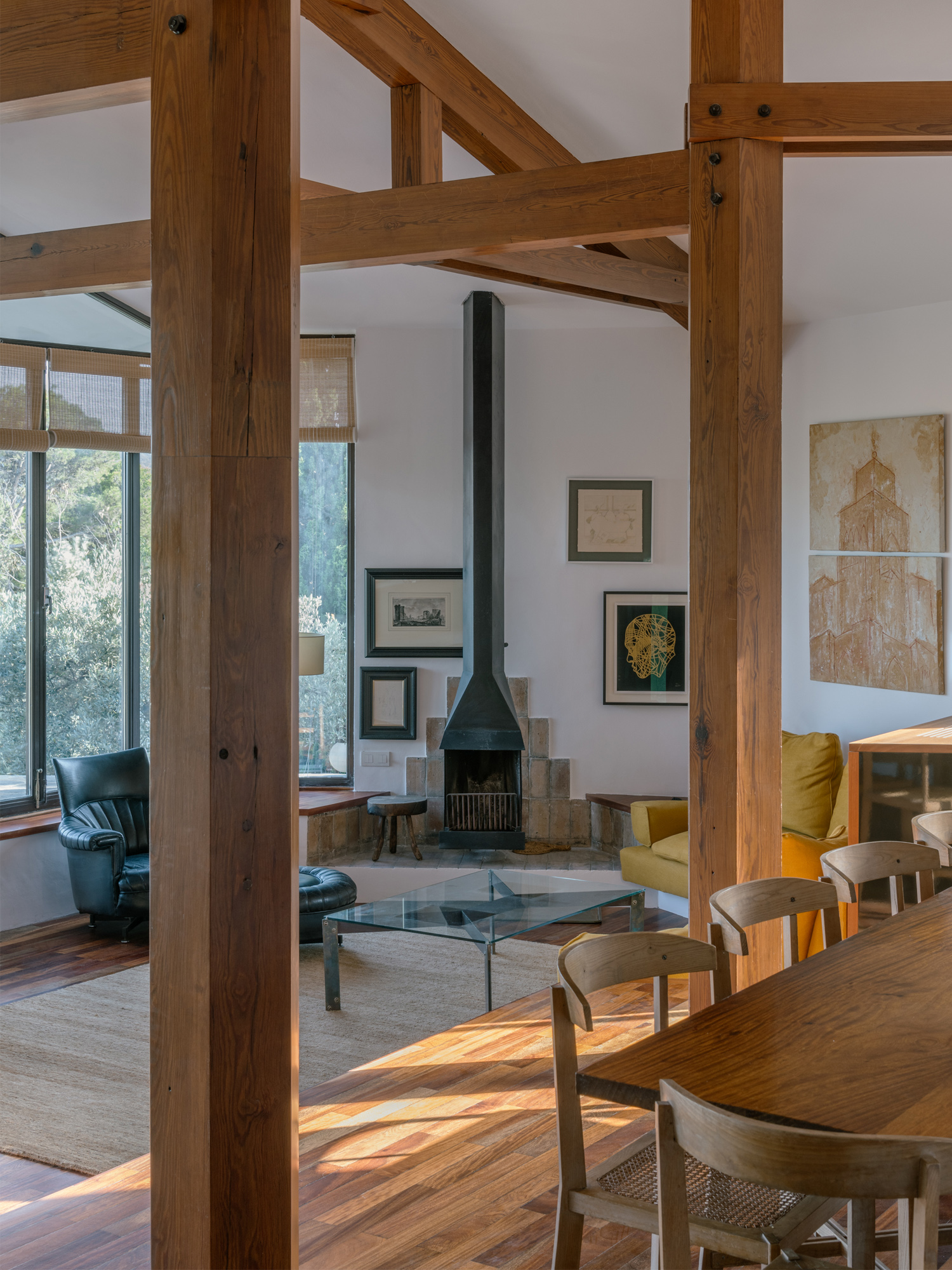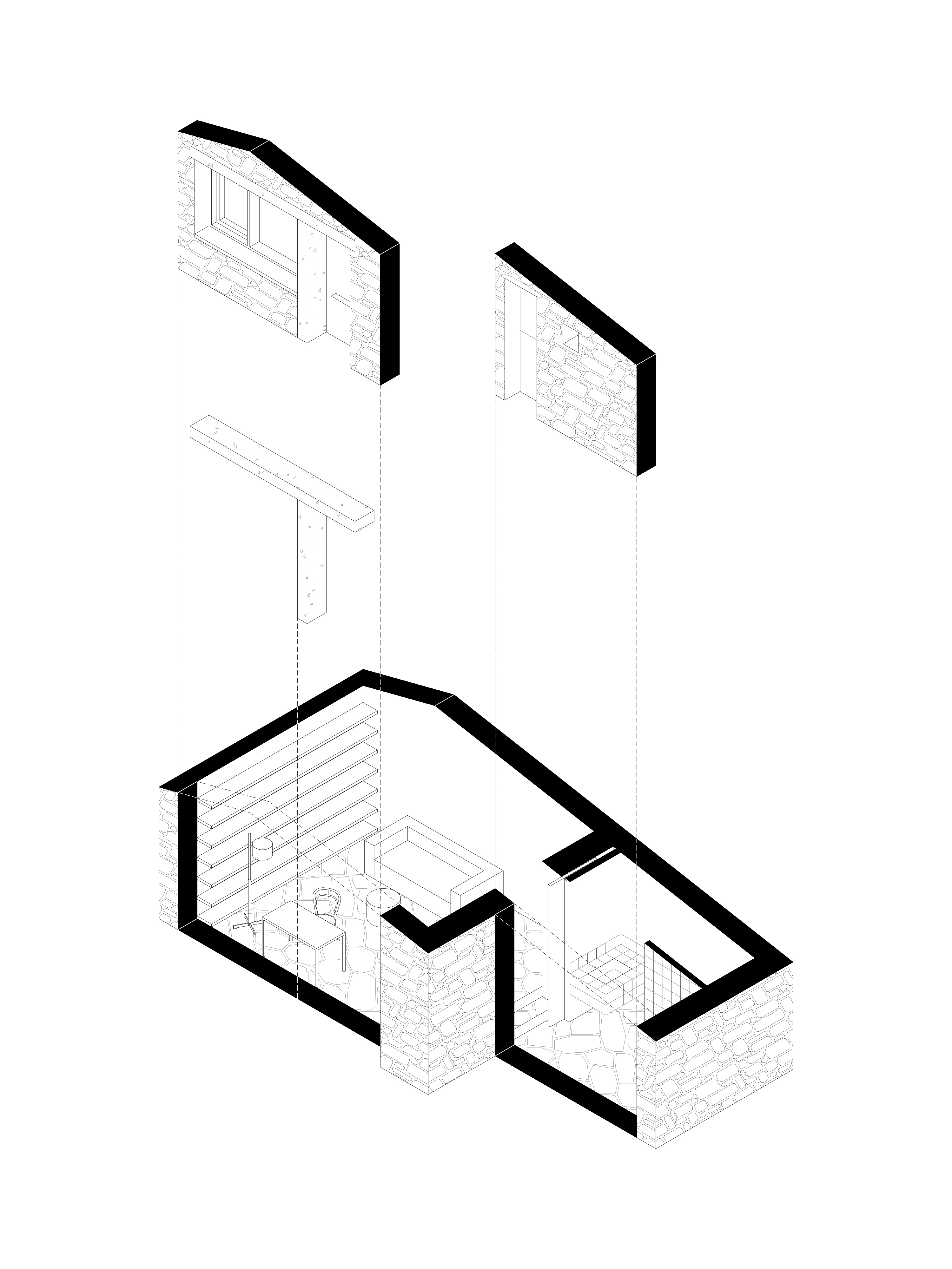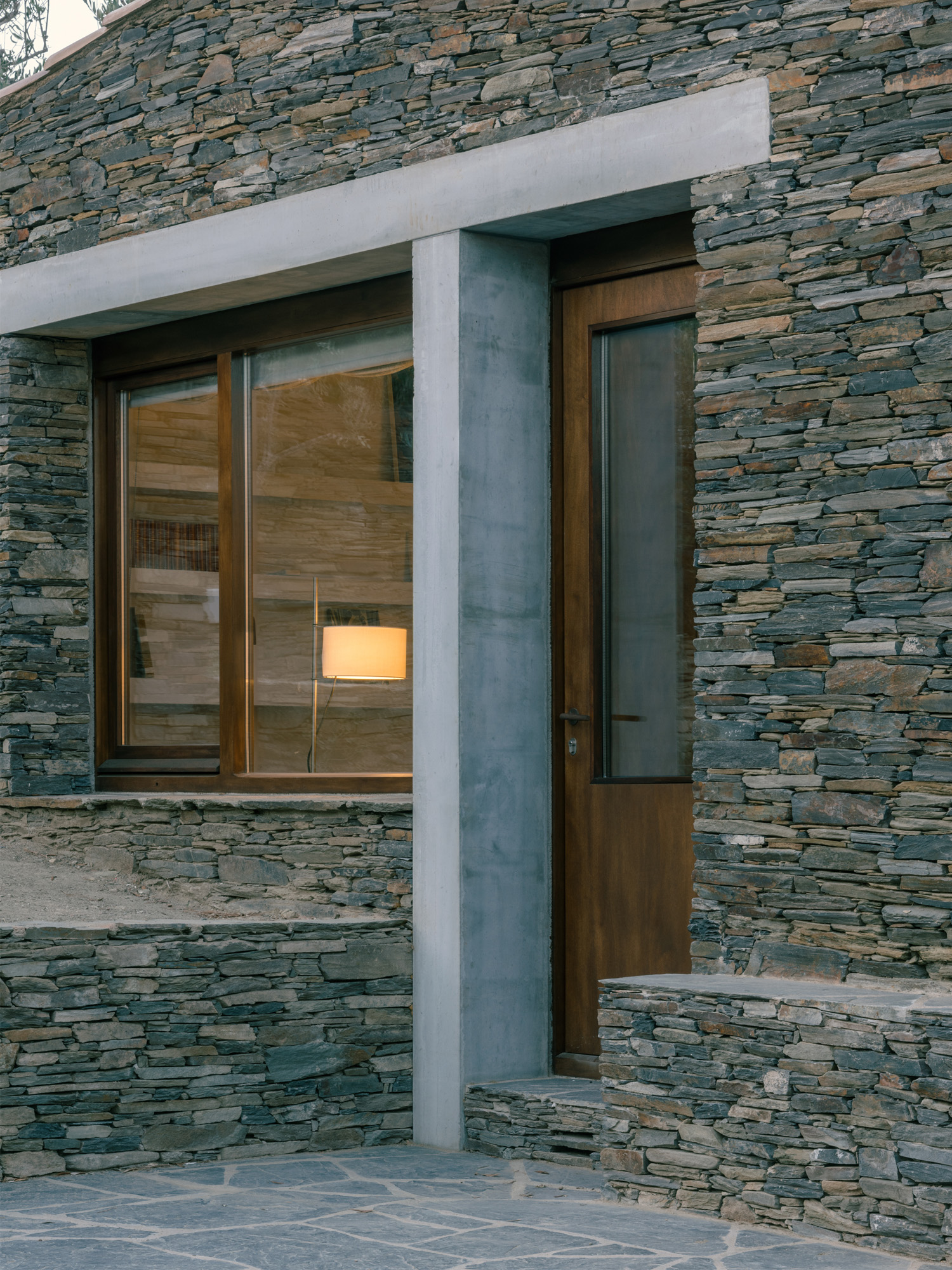Built entirely of local stone and employing vernacular, low-tech solutions, the house distinguishes itself from its context only through its hexagonal plan, a clear expression of experimental intent. This geometric design contrasts with the organic nature of the landscape’s terraces and rural constructions built upon them. The tension generated between its tectonics and form allows the house to blend into and stand out from its surroundings simultaneously.