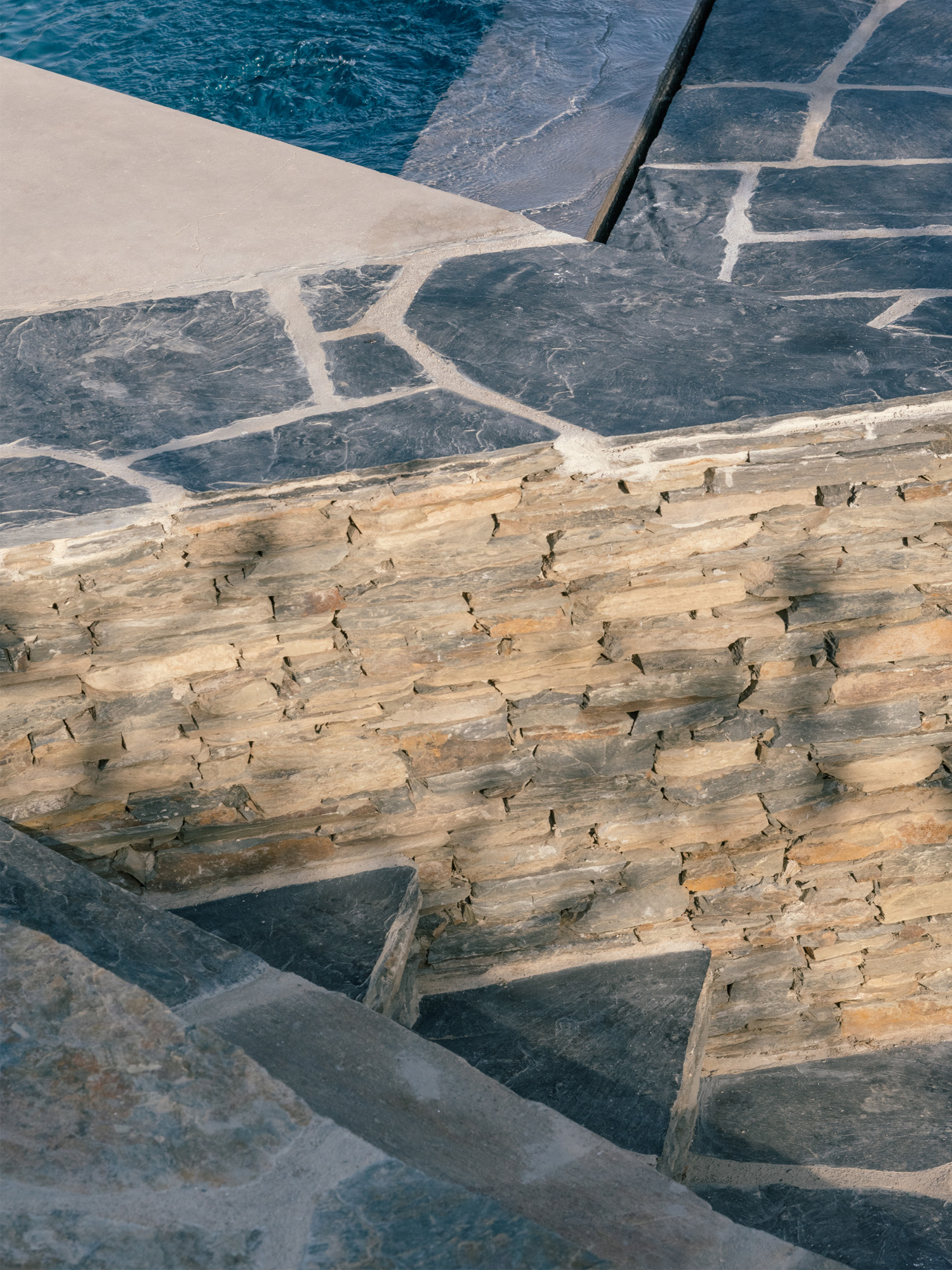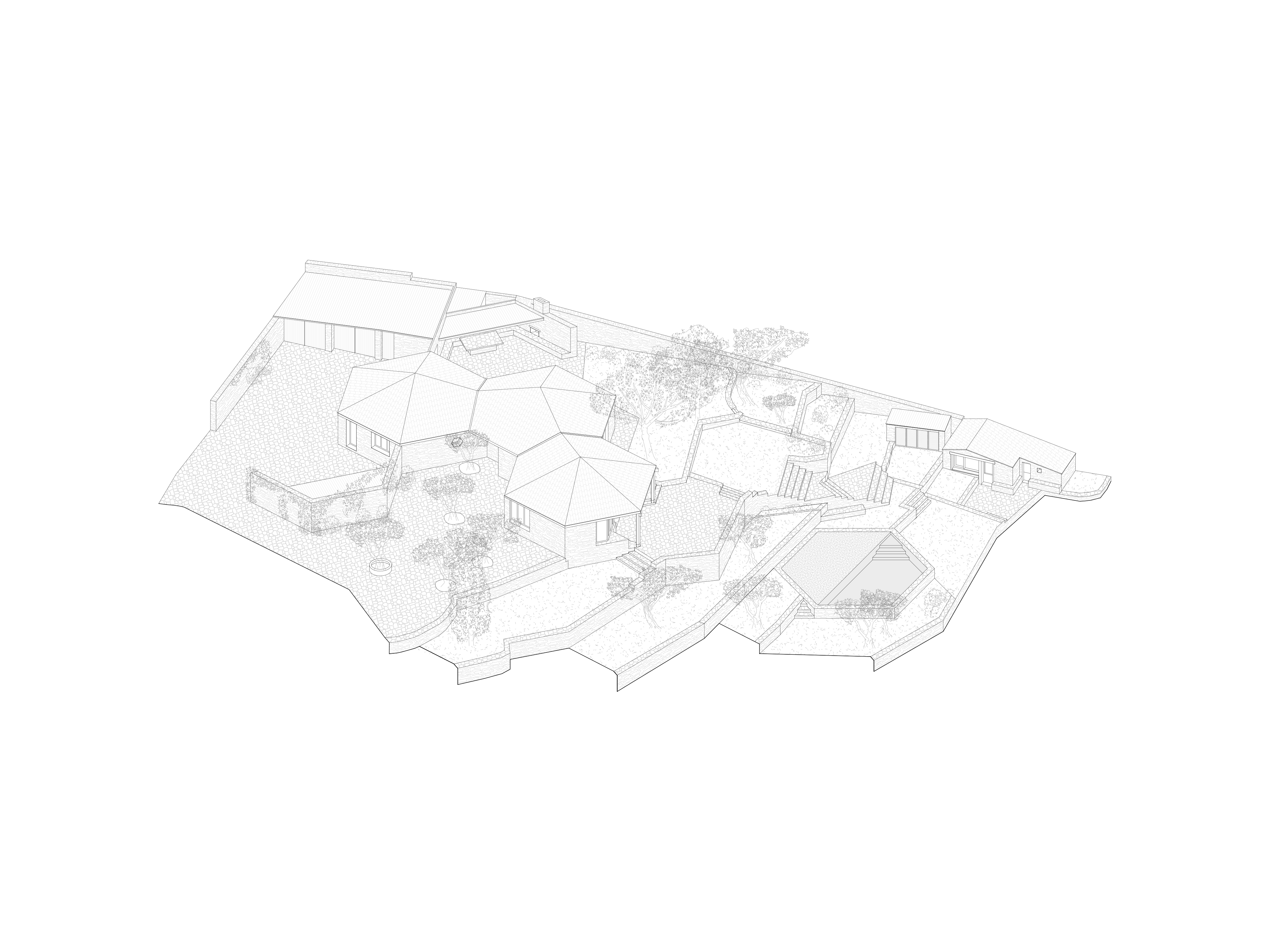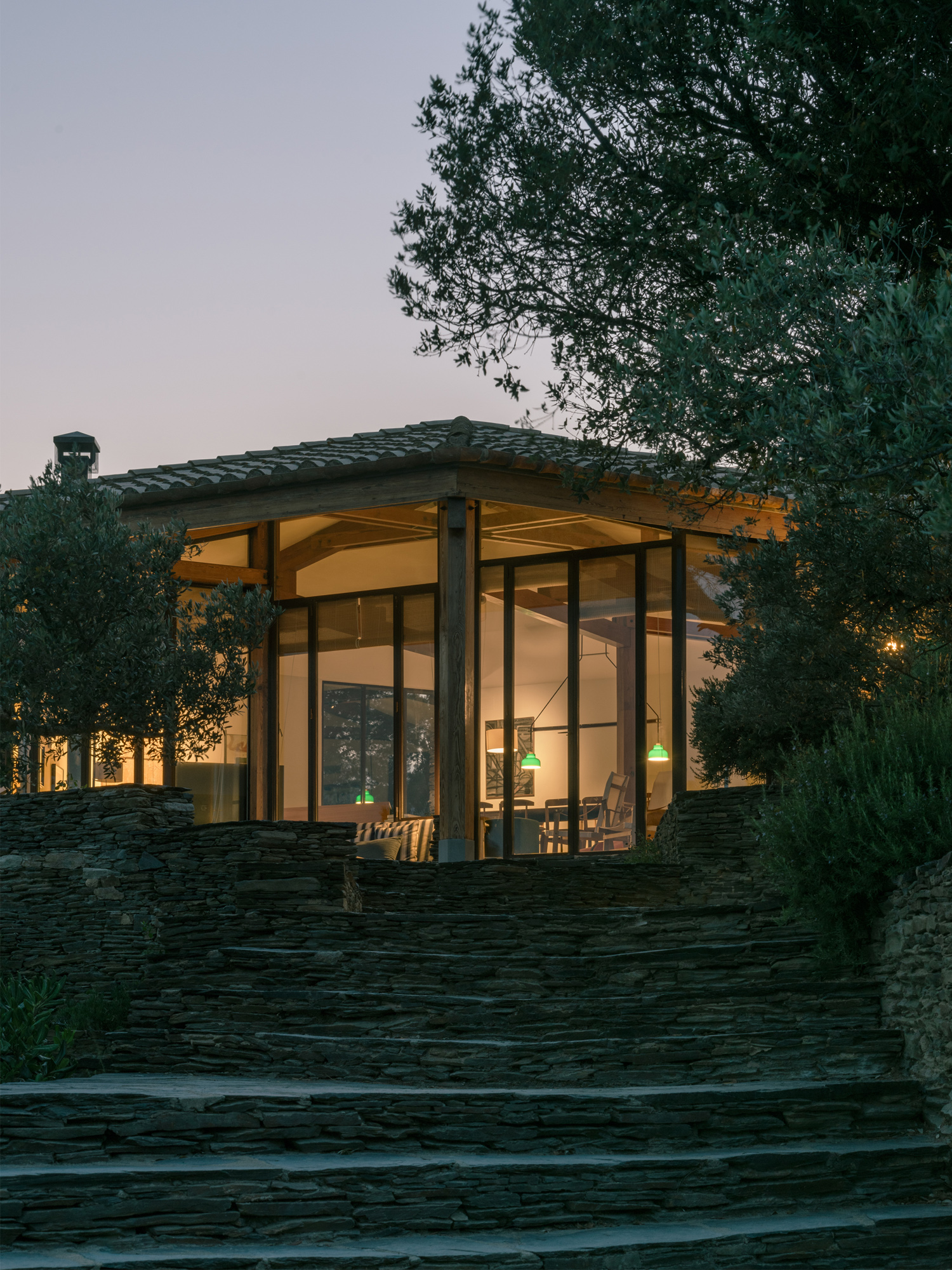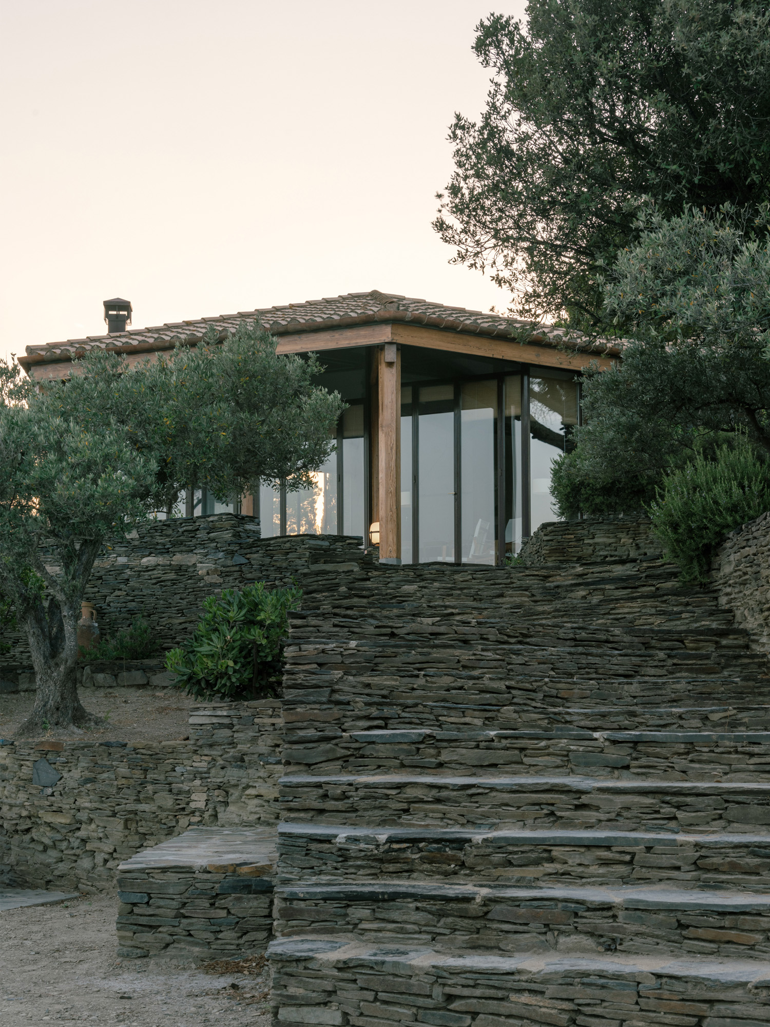 An irrigation pond and a terrace have also been added to the landscape, following the sinuous path of the house and adapting the hexagonal form to the orientation of the existing terraces and views of the sea. The materiality and attention to detail in this construction, enclosed by a new perimeter of dry stone walls, make it seem as if it had always been there.