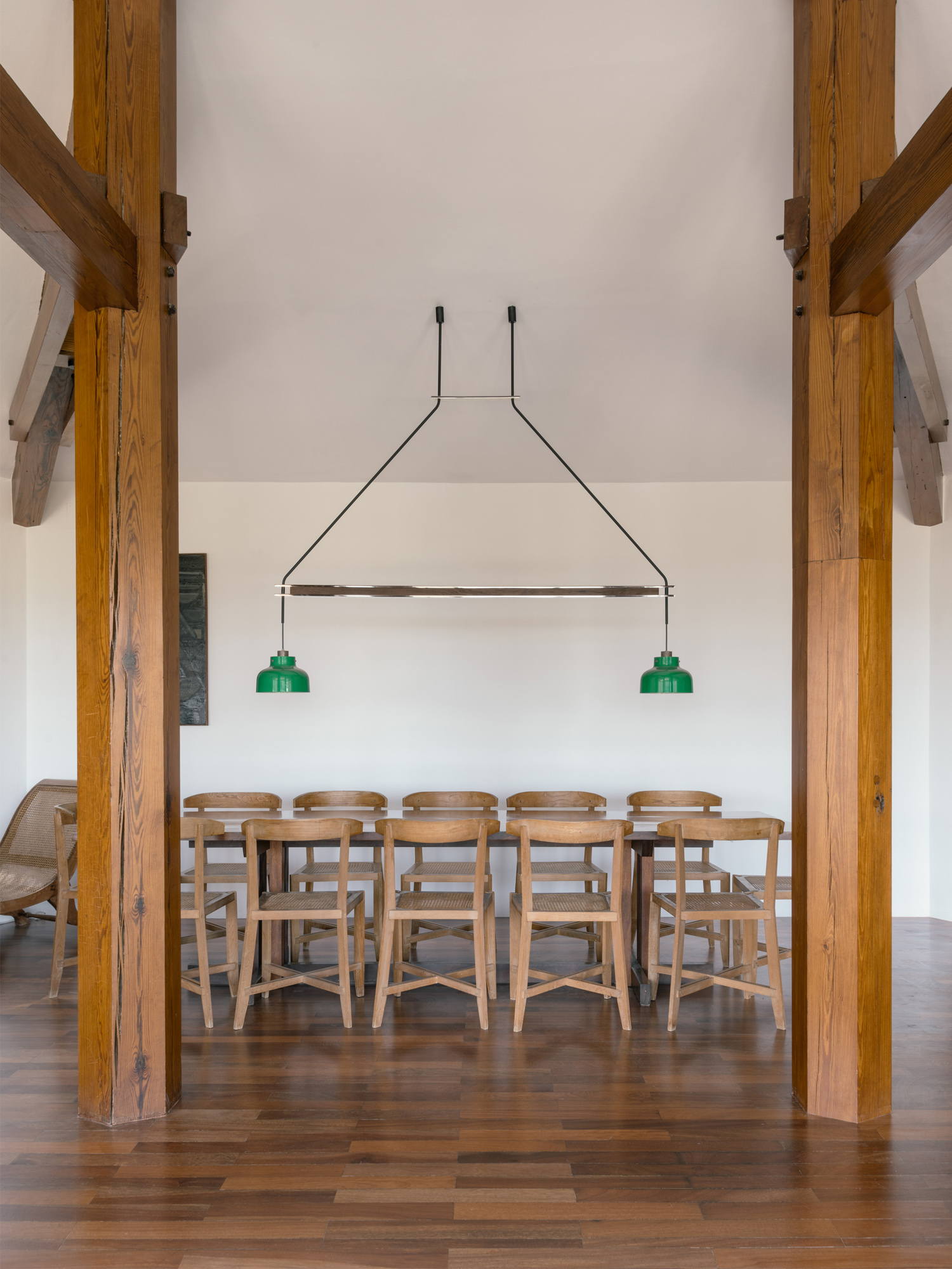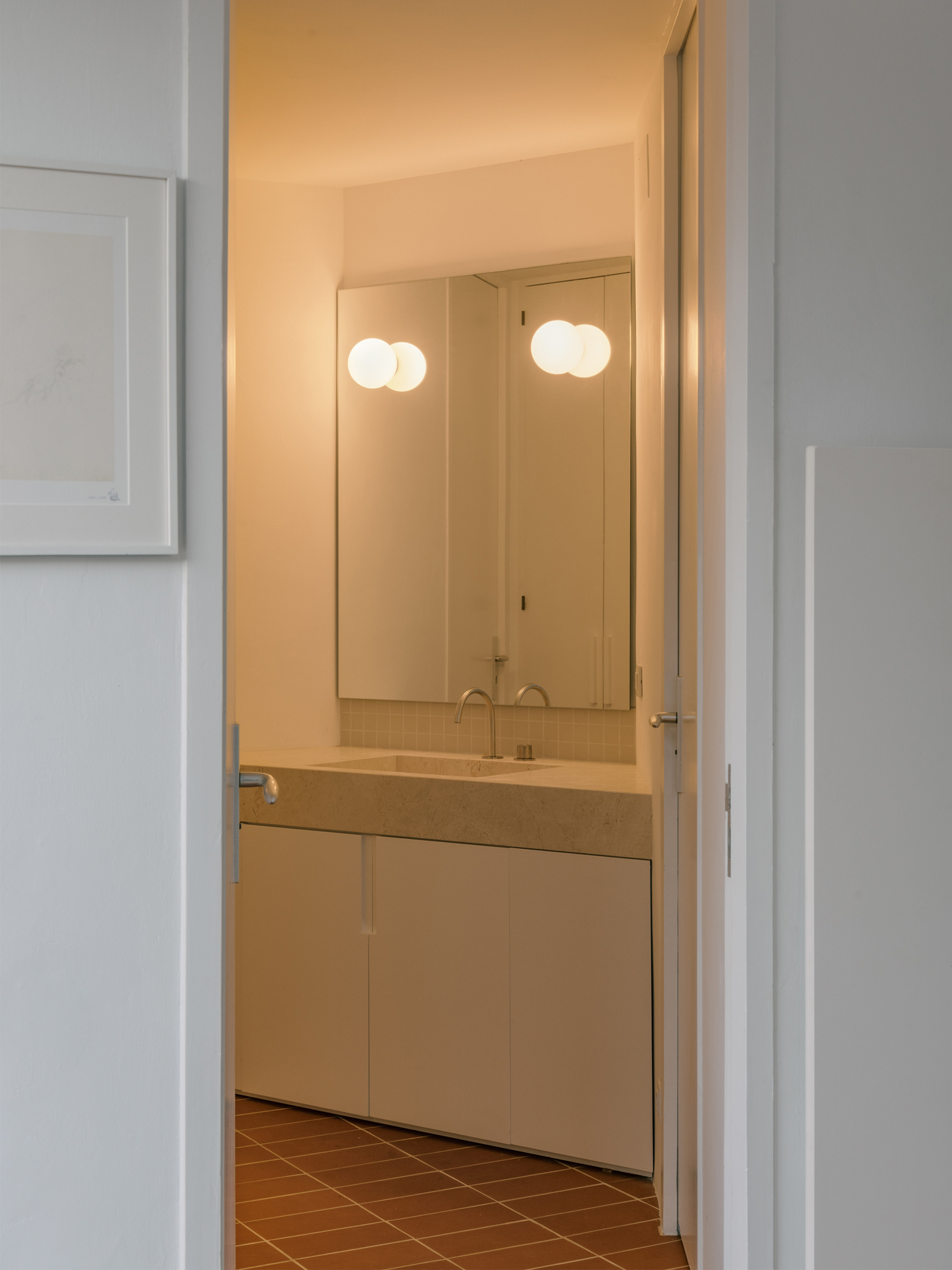For the interior, some materials have been replaced while thoughtfully maintaining the original color palette. Our work also involved designing new elements that complement the house’s hexagonal shape, including custom-made marble basins, a steel lattice, a hanging lamp, and built-in furniture.