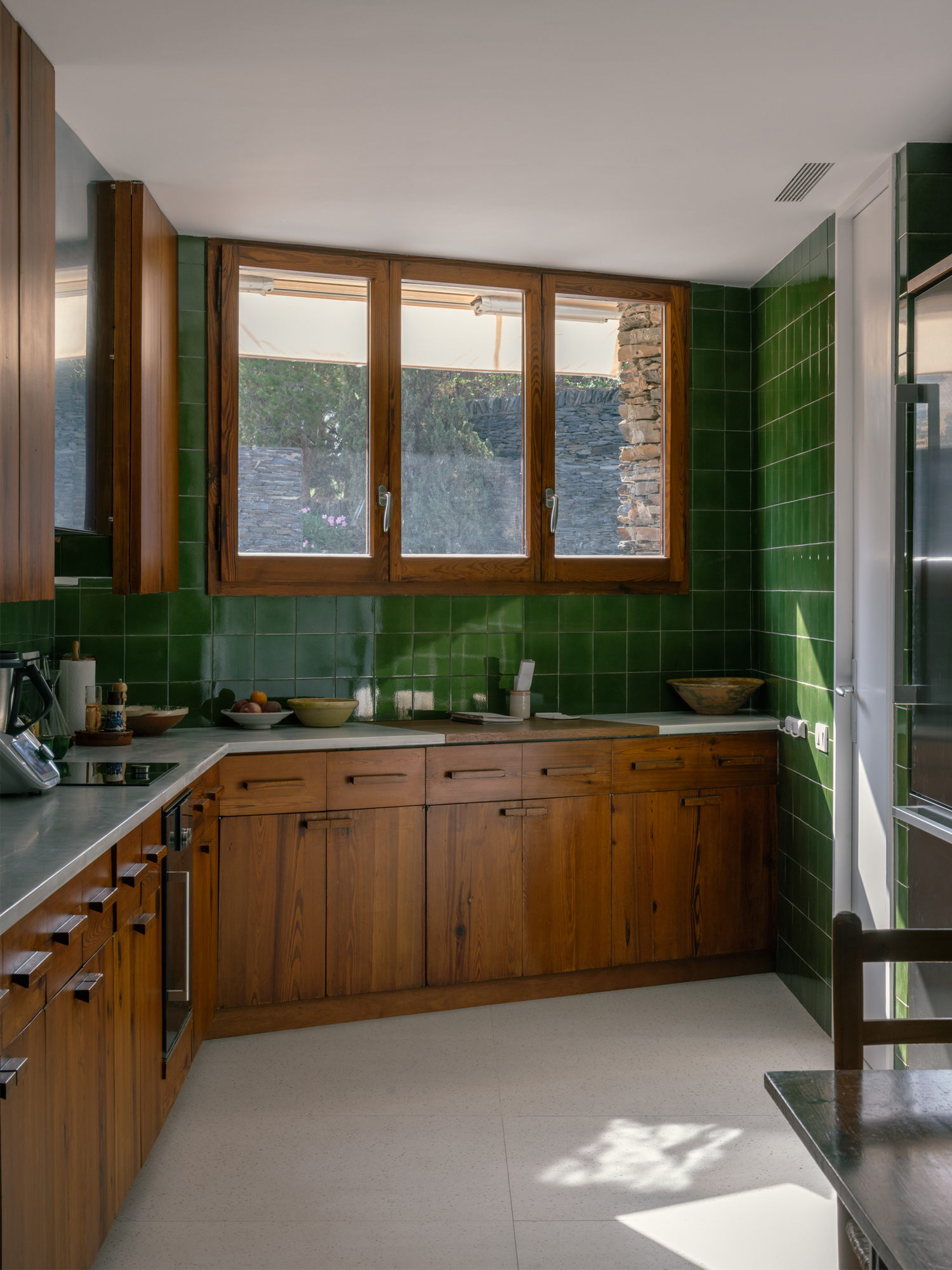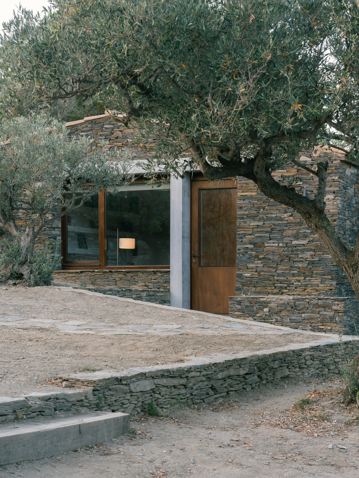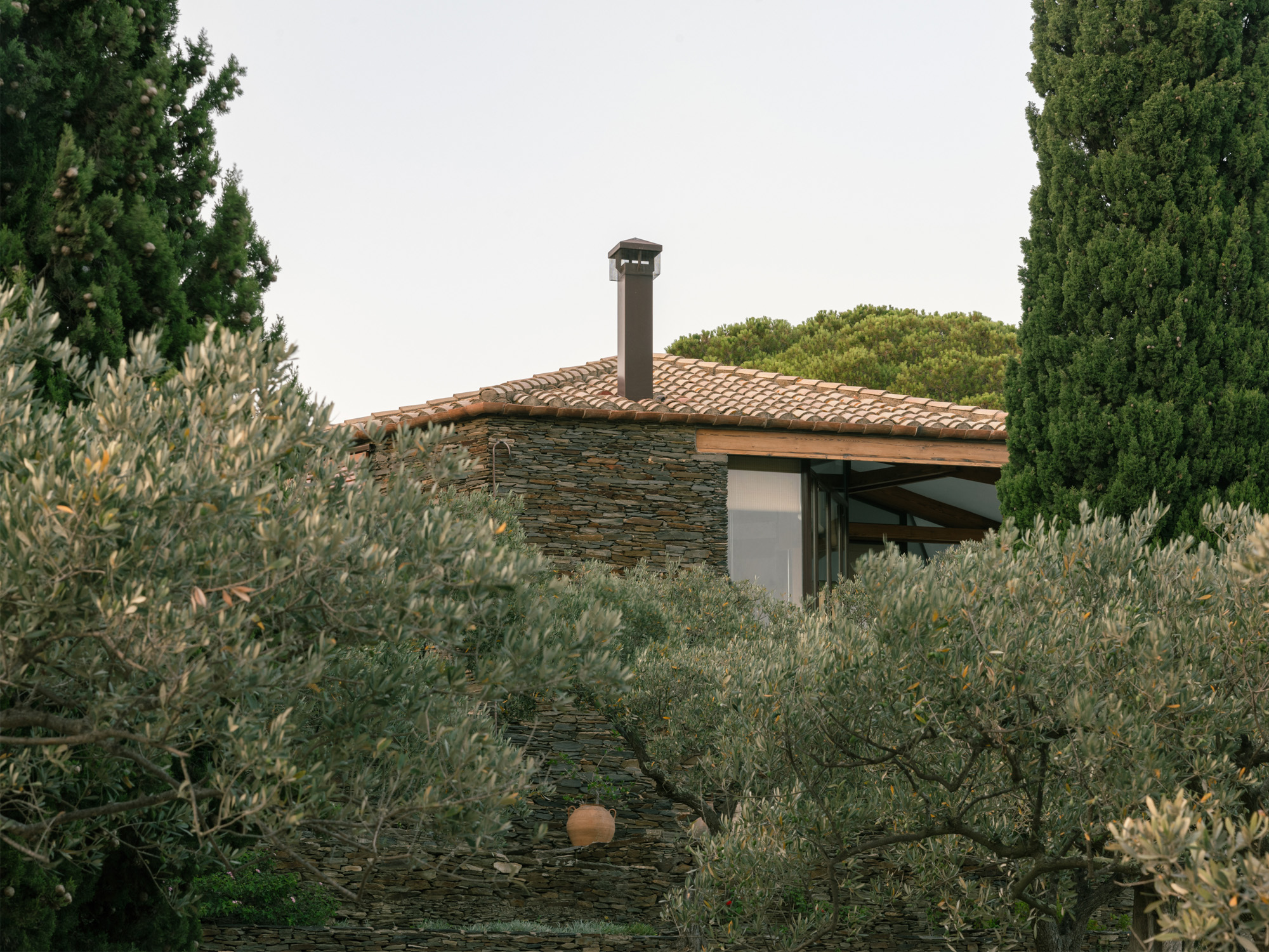 To create a new guest bedroom and bathroom, we renovated an old barn, originally built by the gardener as a storage space. Exploring the tension between rural construction methods and modern techniques, we made a large opening in the dry stone wall, framed by an exposed concrete lintel and column. This enhances the interior experience by opening large windows toward the olive grove, offering a view that is characteristic of Cadaqués. Inside, local slate pavements and green glazed tiles give a sense of continuity from the main house to this smaller structure.
