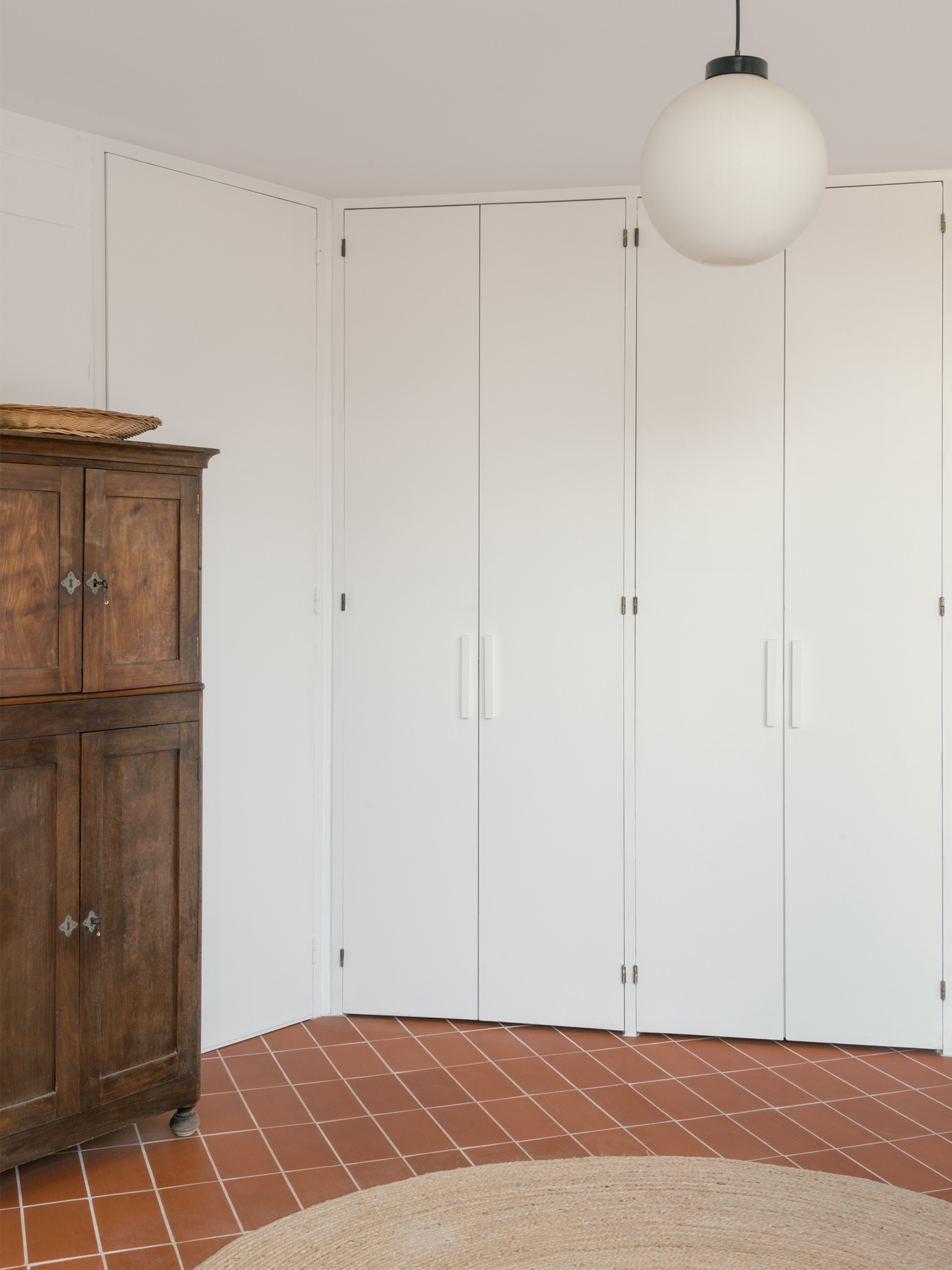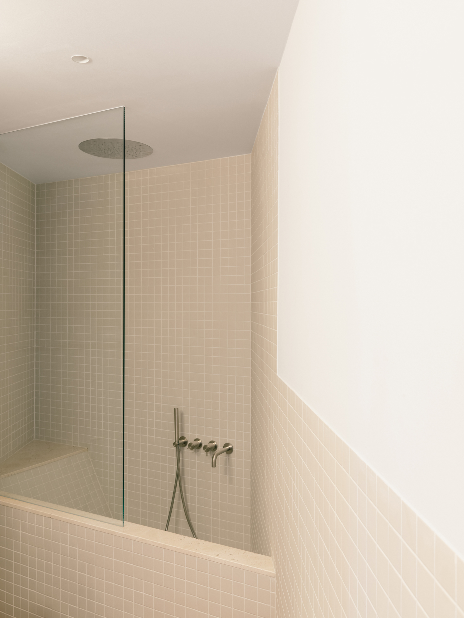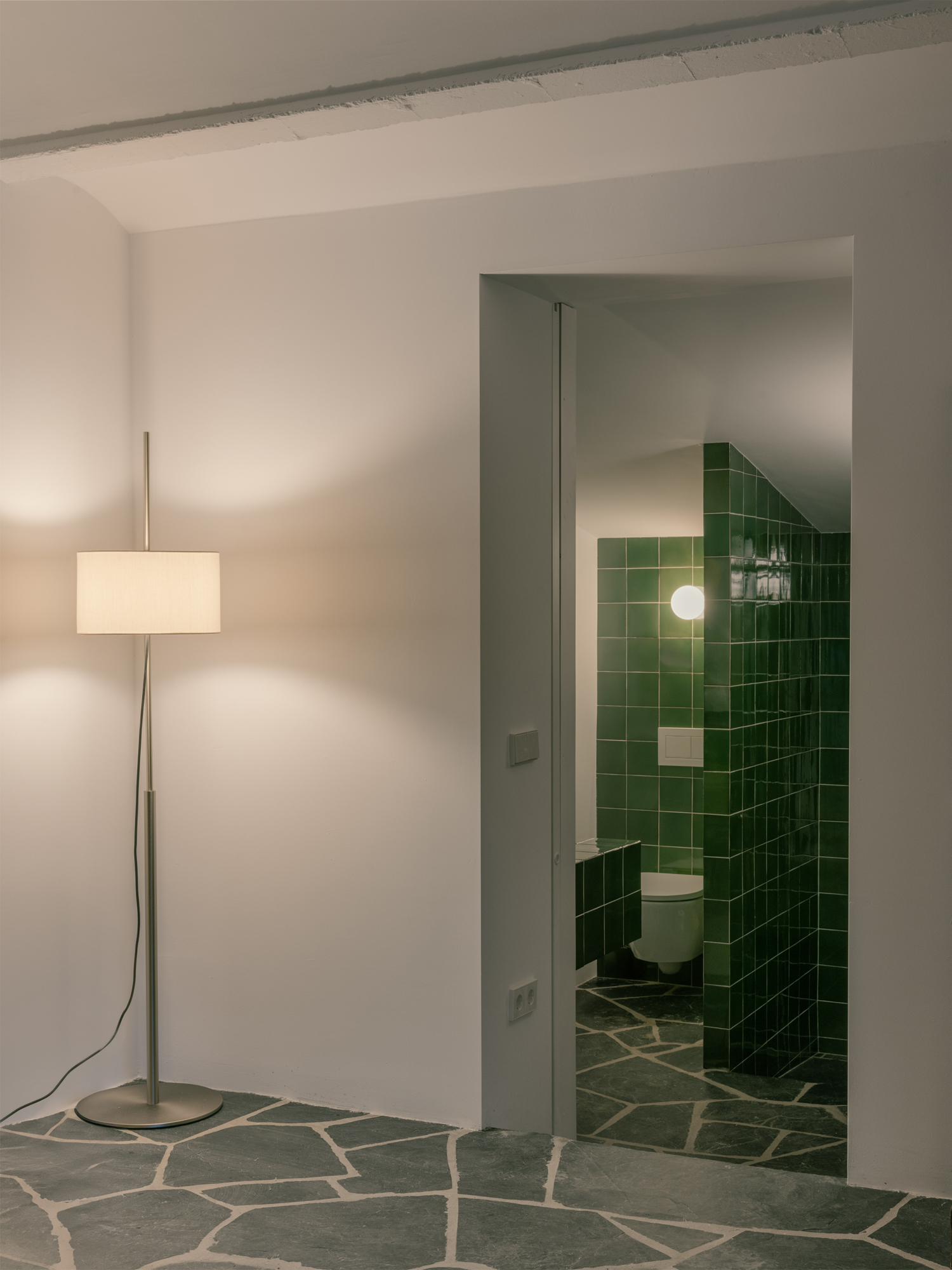 To create a new guest bedroom and bathroom, we renovated an old barn, originally built by the gardener as a storage space. Exploring the tension between rural construction methods and modern techniques, we made a large opening in the dry stone wall, framed by an exposed concrete lintel and column. This enhances the interior experience by opening large windows toward the olive grove, offering a view that is characteristic of Cadaqués. Inside, local slate pavements and green glazed tiles give a sense of continuity from the main house to this smaller structure.