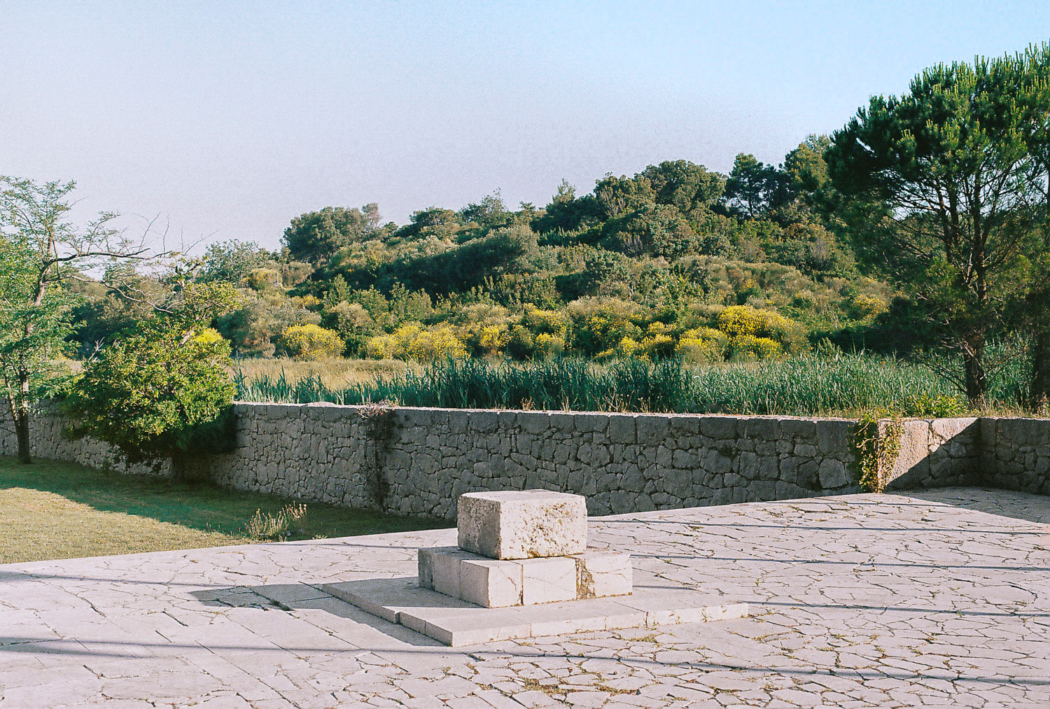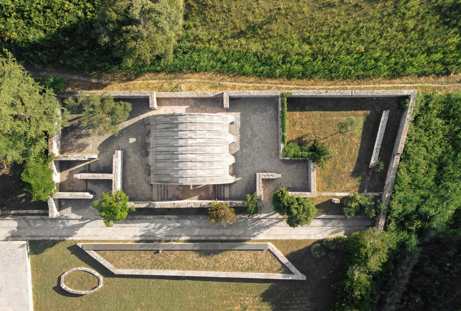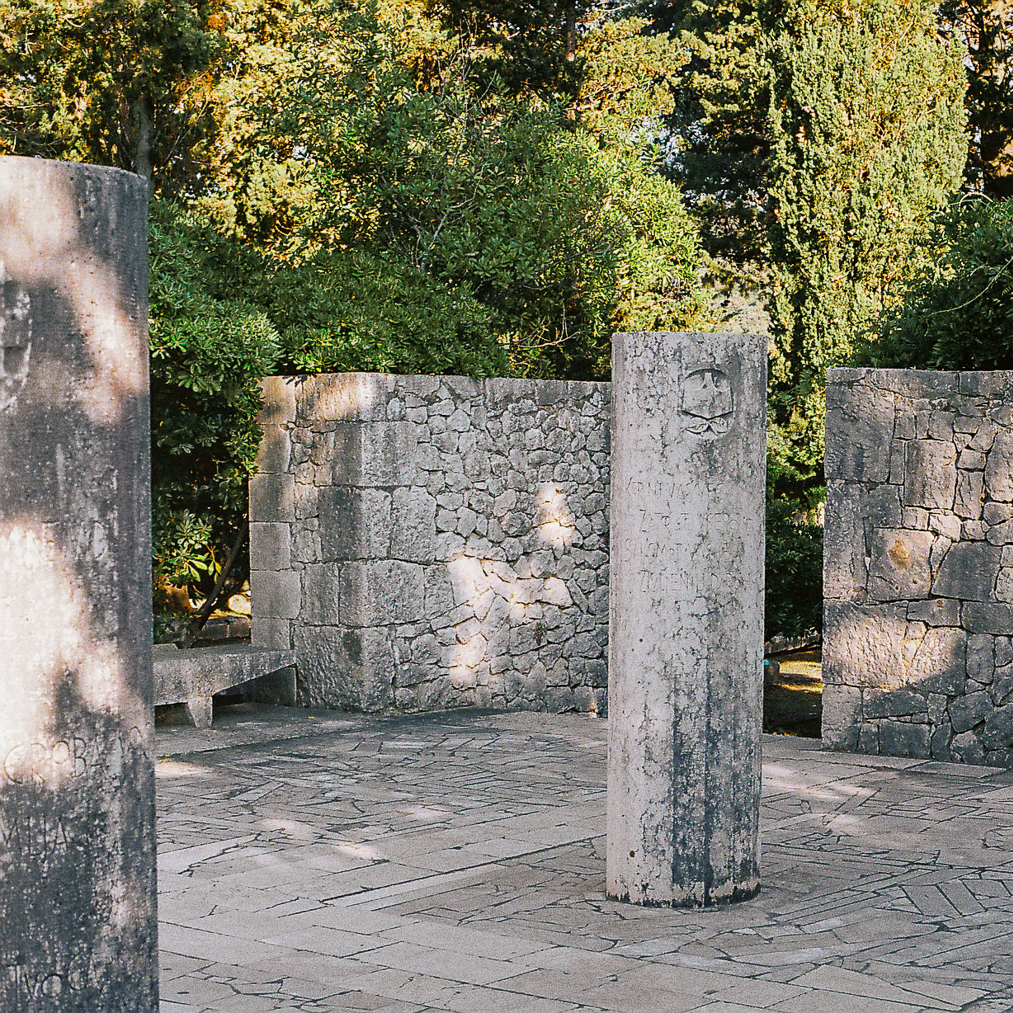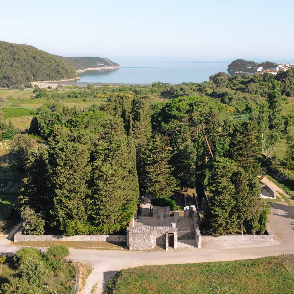 The Kampor memorial complex lies at the bottom of the valley that runs out into the sea and is therefore surrounded by slopes with lush greenery, trees and fields on both sides, with the sea and the contours of the island of Krk in the background. The concept envisages the organisation of the enclosed site in terraces, which are always horizontal to prevent any further washing away of the soil.