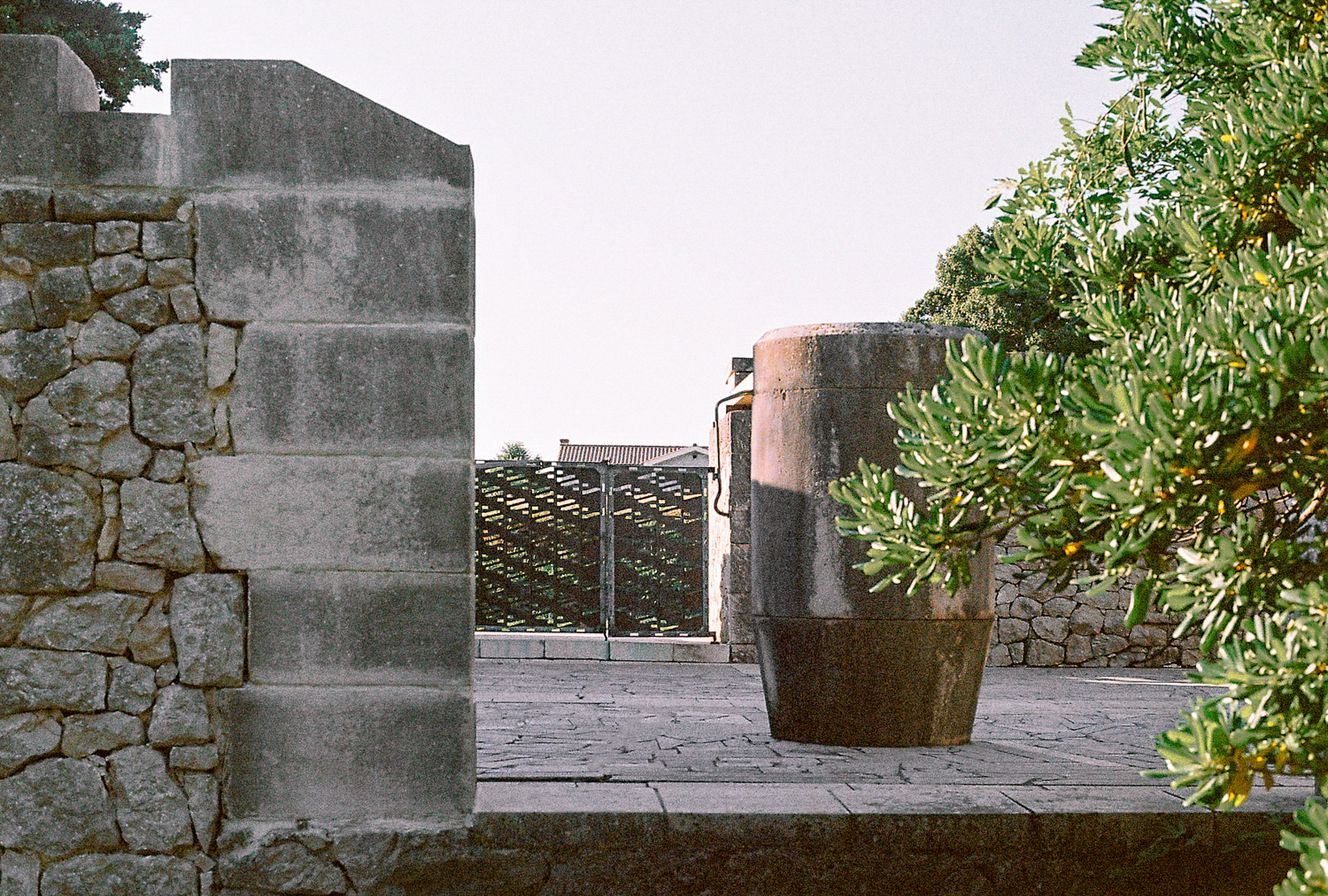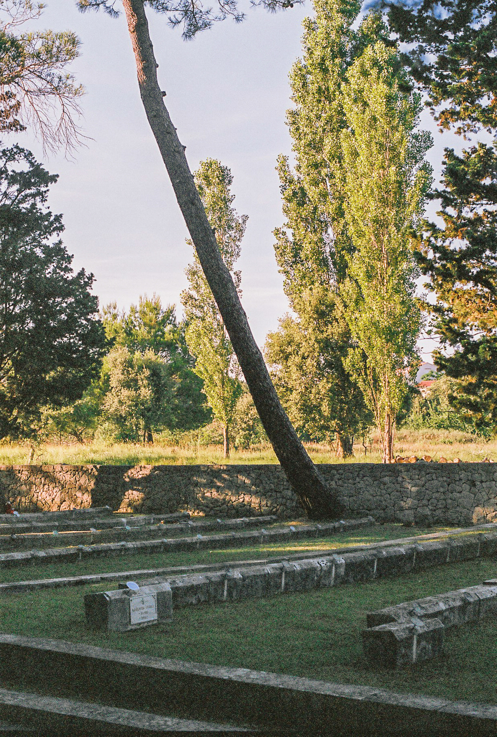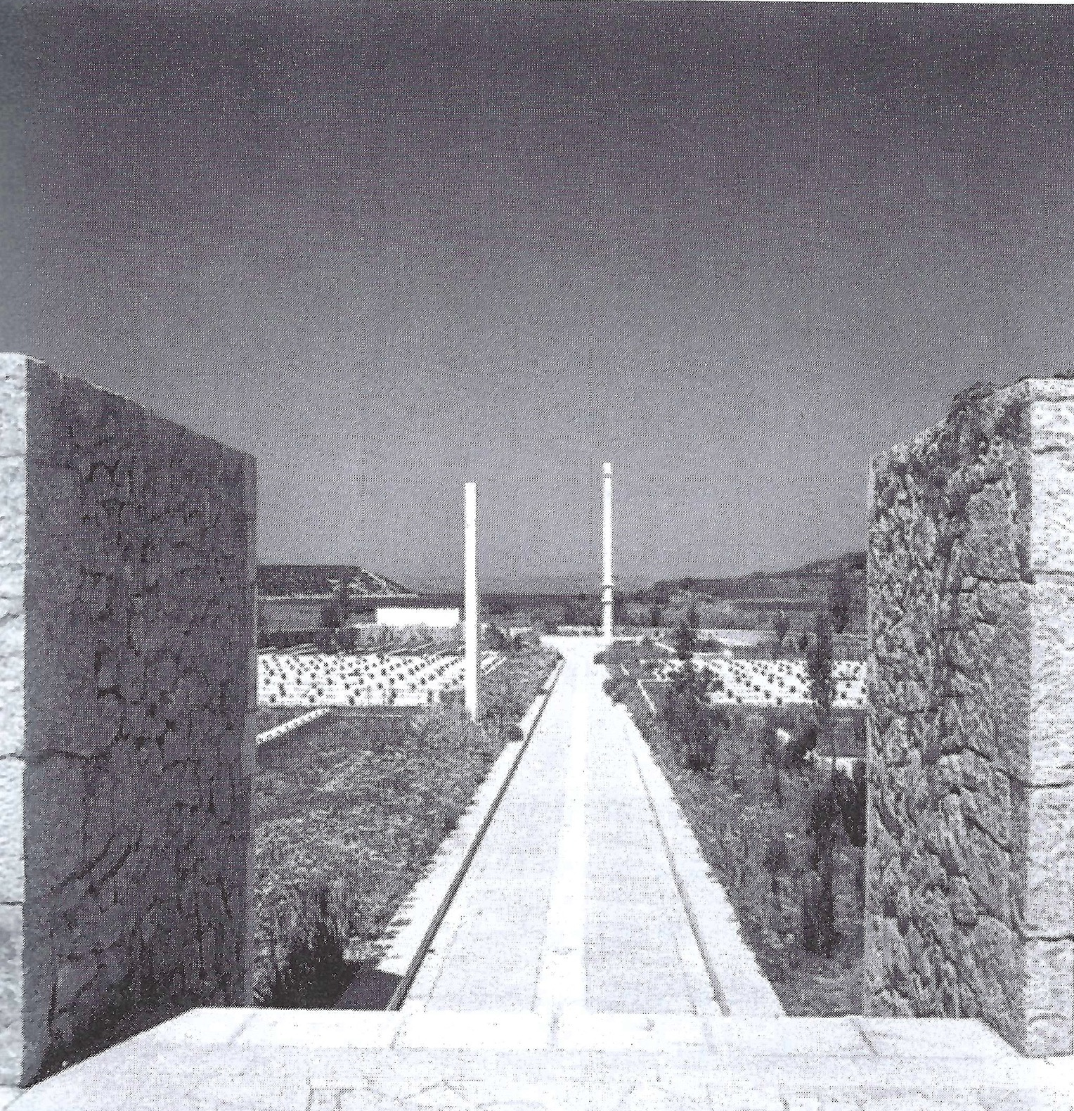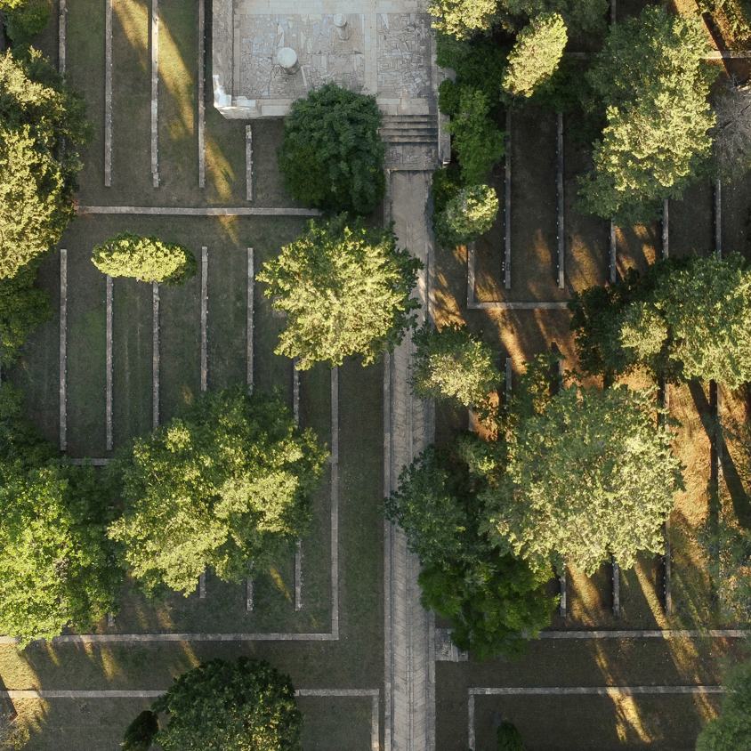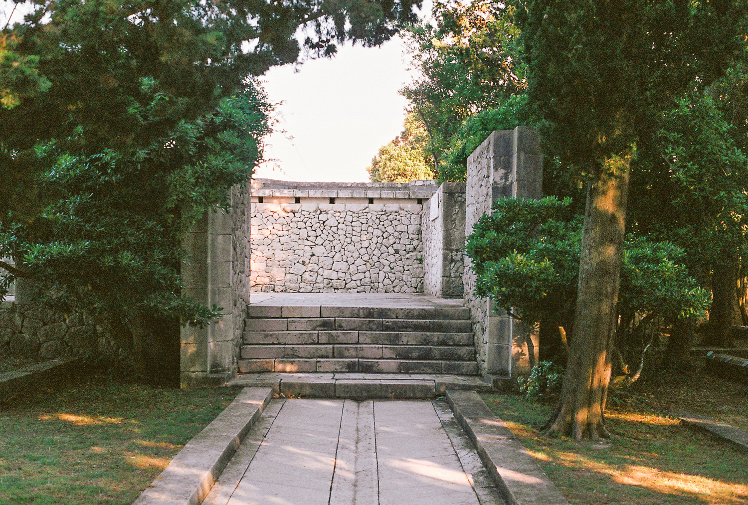 The Kampor memorial complex lies at the bottom of the valley that runs out into the sea and is therefore surrounded by slopes with lush greenery, trees and fields on both sides, with the sea and the contours of the island of Krk in the background. The concept envisages the organisation of the enclosed site in terraces, which are always horizontal to prevent any further washing away of the soil.