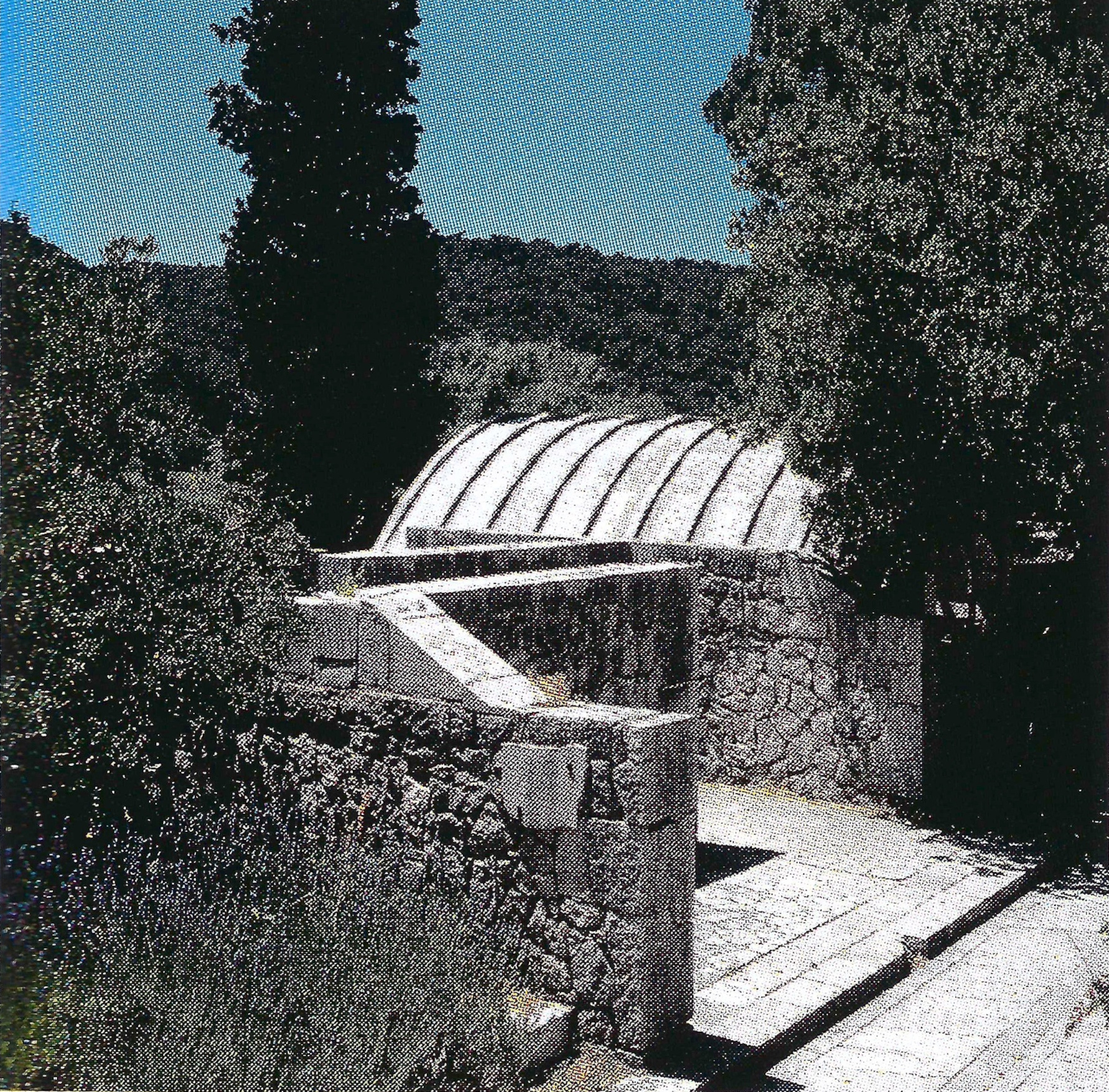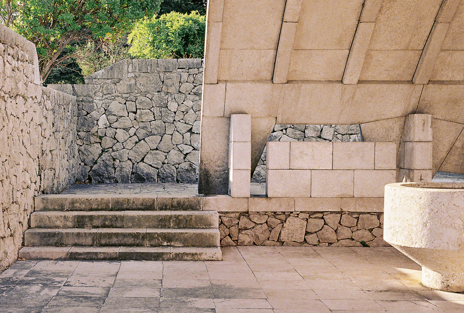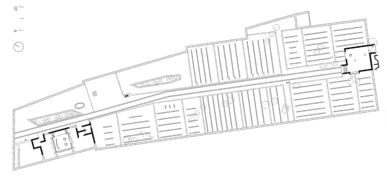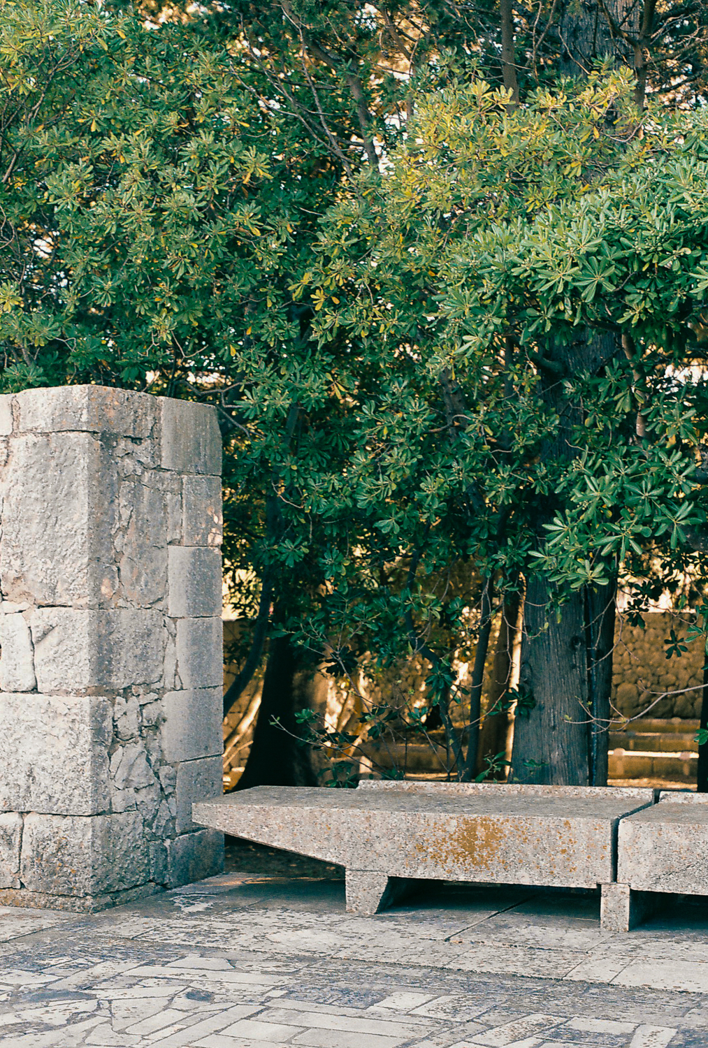 The architect tried to transfer the architectural qualities from the decorative and structural to the optical. Colour contrasts provided by the stone and the greenery of the environment and the blue of the sky, the verticals of the architecture and the horizontals of the sea, together with the composed views that connect existing landscape elements with the new are the main means that the architect uses in order to influence the visitors.