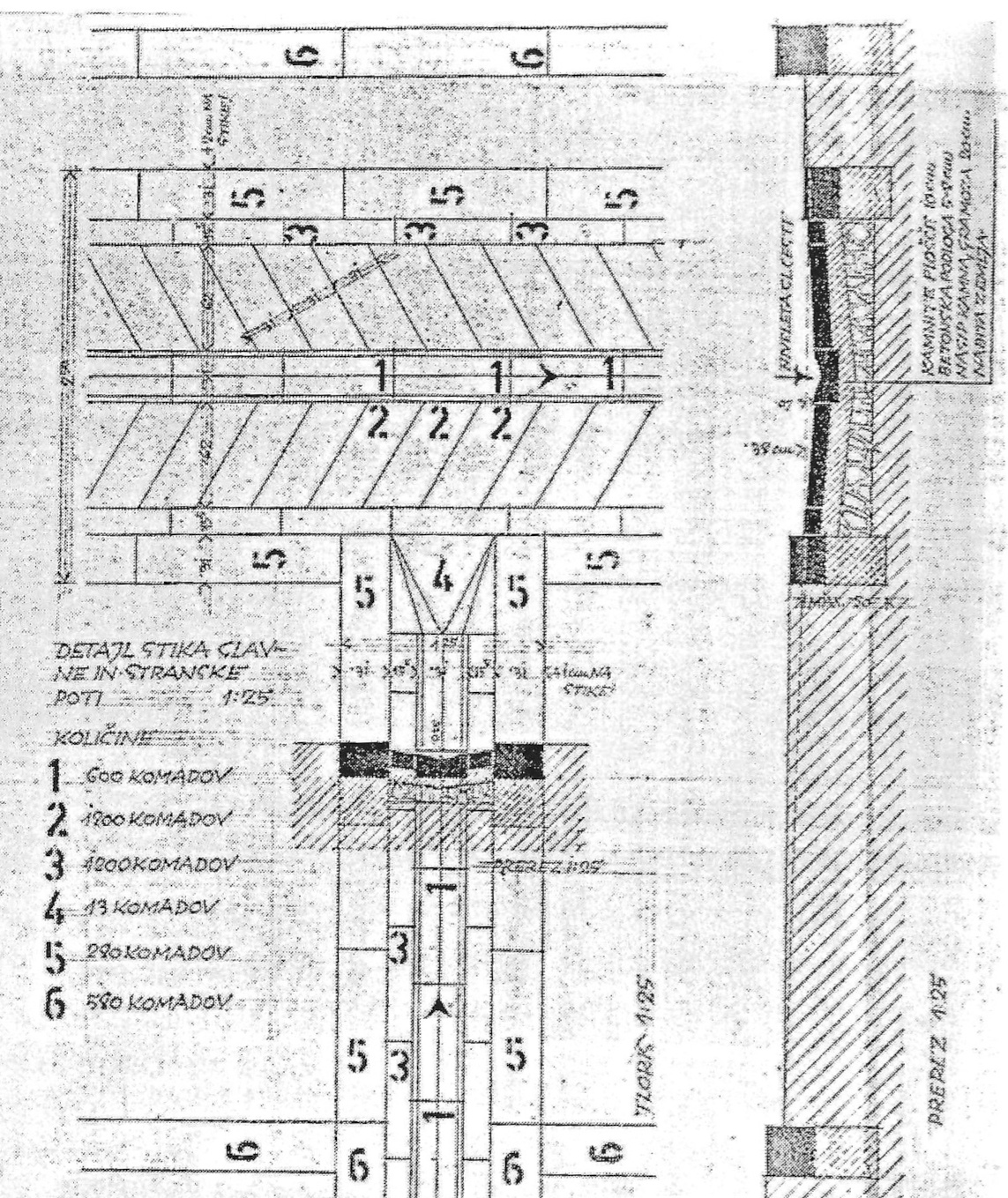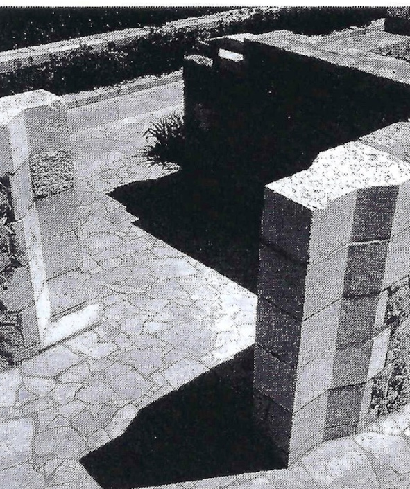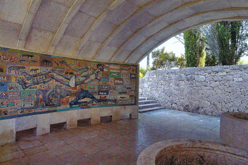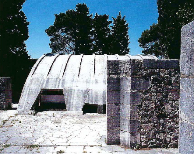 It has two architectural emphases: the entrance plateau, a space shaped by walls and monolithic elements, and a covered hall of parabolic shape, a space envisaged for remem-brance, which includes a memorial book, two showcases and a wall mosaic by academic painter Marij Pregeli. This element is built entirely out of stone with lead joints. Both architectural emphases are connected by a path that serves also as a rainwater channel during the winter season.