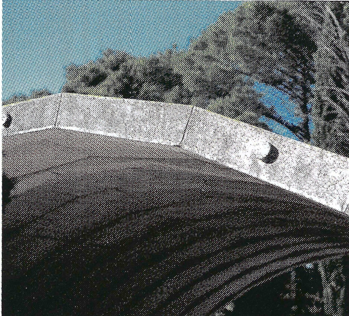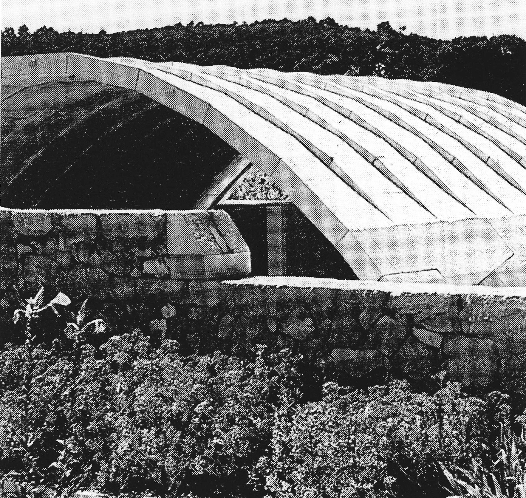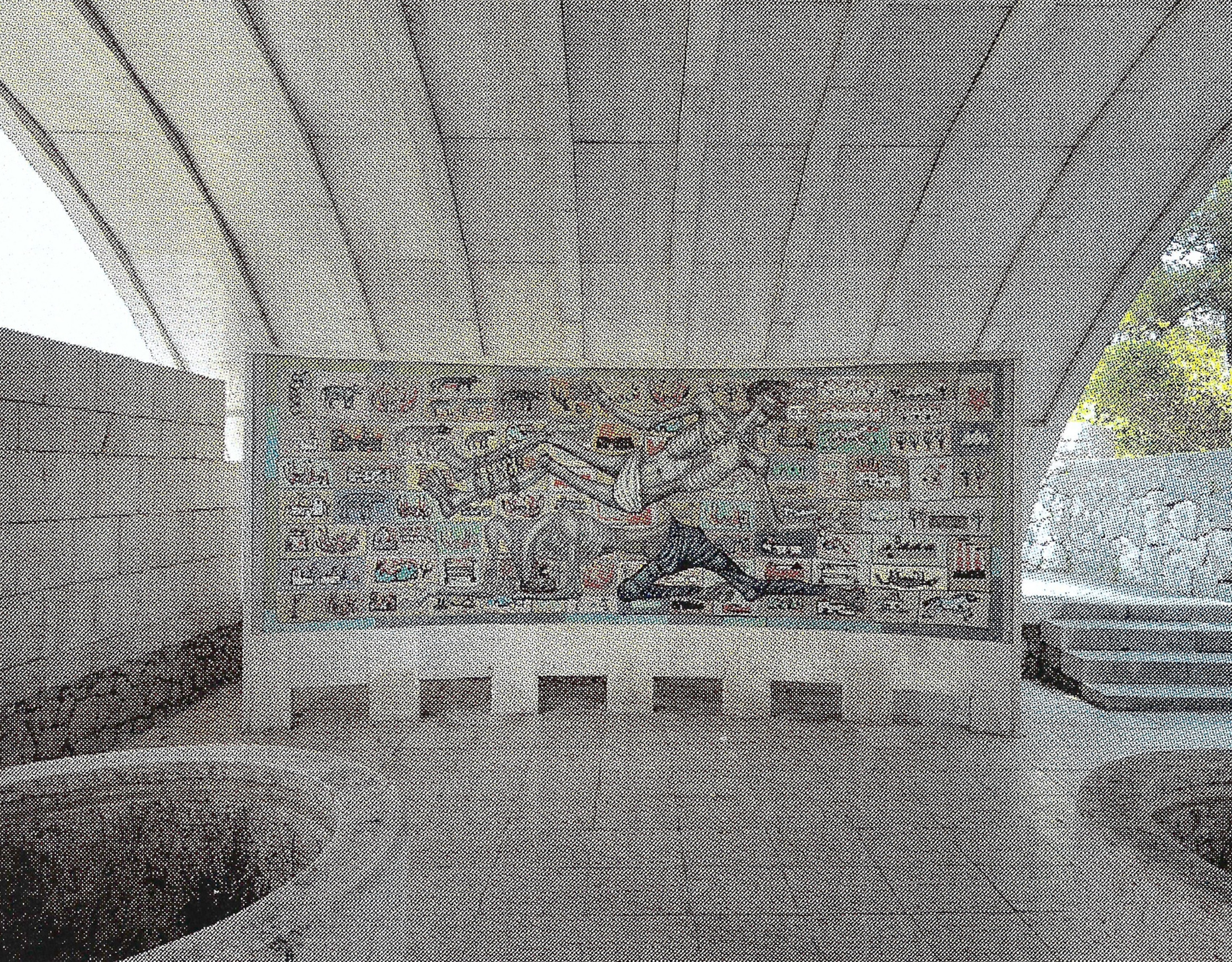 It has two architectural emphases: the entrance plateau, a space shaped by walls and monolithic elements, and a covered hall of parabolic shape, a space envisaged for remem-brance, which includes a memorial book, two showcases and a wall mosaic by academic painter Marij Pregeli. This element is built entirely out of stone with lead joints. Both architectural emphases are connected by a path that serves also as a rainwater channel during the winter season.